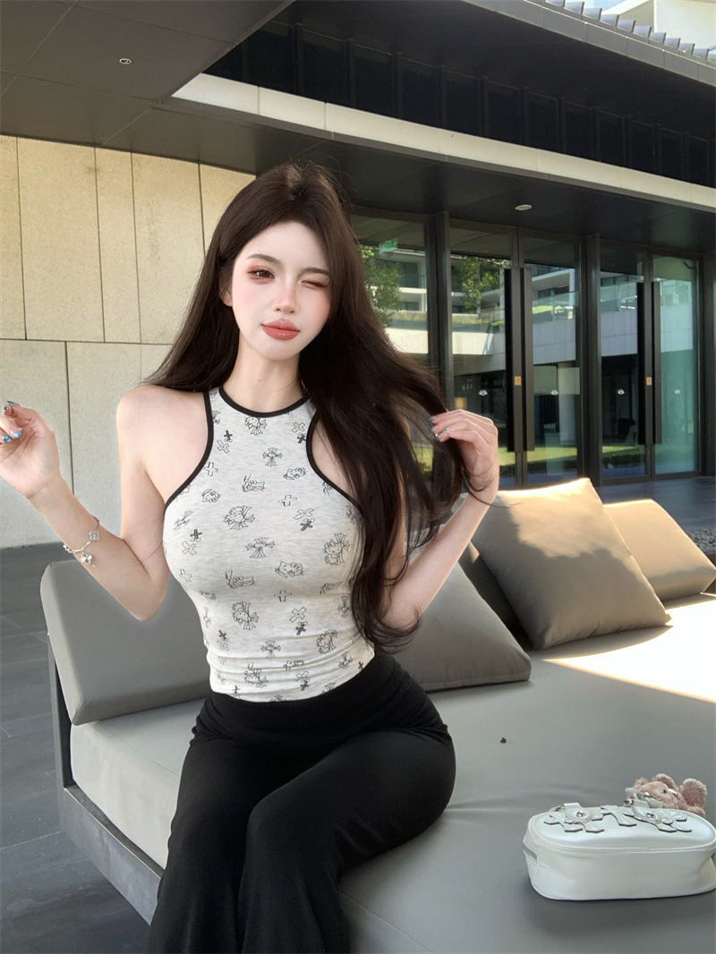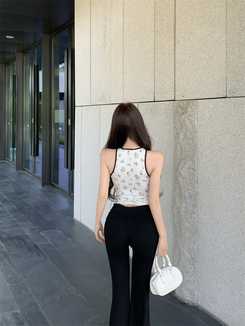 MY6763#辣妹卡通印花吊带背心女夏季黑色休闲裤微喇裤两件套女裝貨源服裝批發