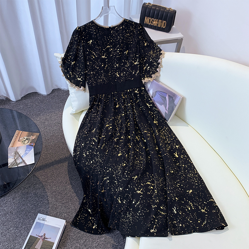 MY6768# 大码女装夏季烫金重工拼接花边设计感显瘦中长裙连衣裙短袖女裝貨源服裝批發