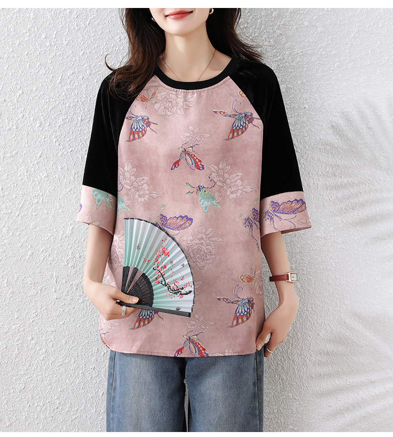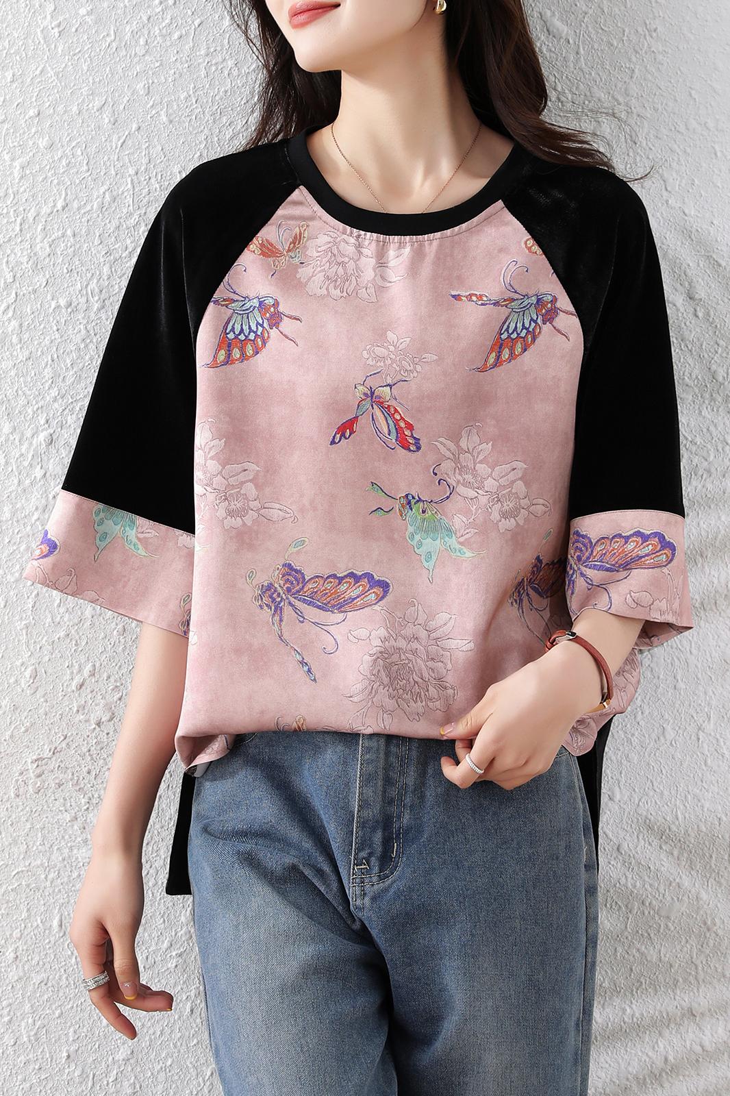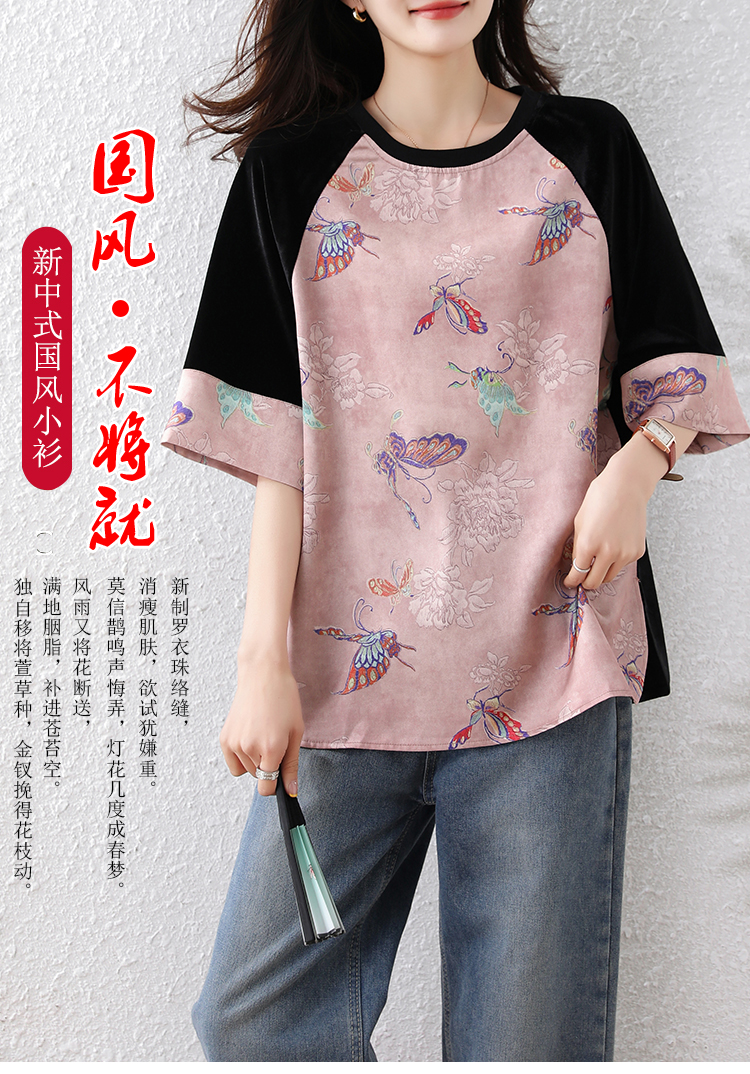 MY6775# 夏季新款大码女装胖MM时尚宽松显瘦国风拼接撞色印花T恤上衣女裝貨源服裝批發
