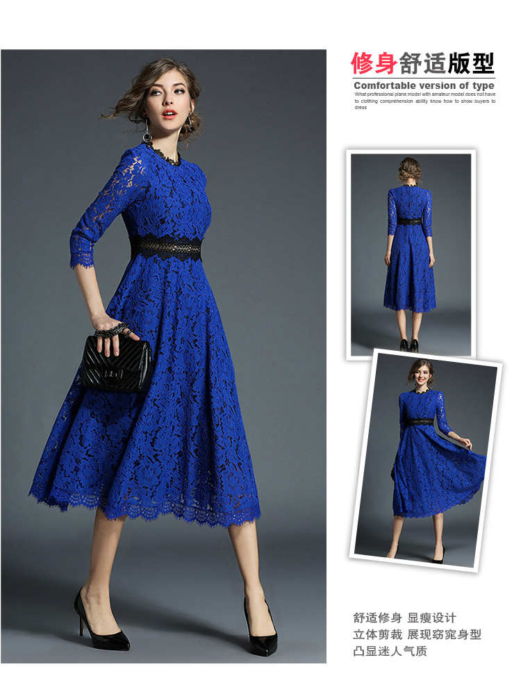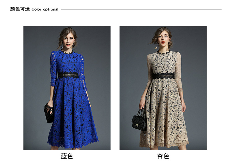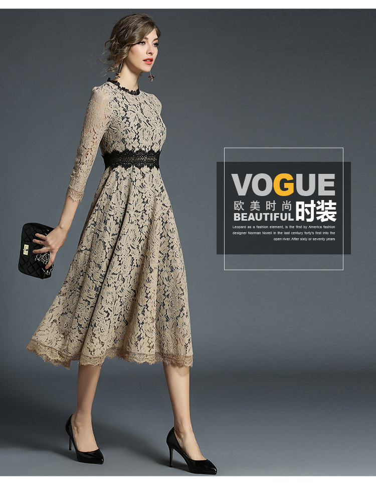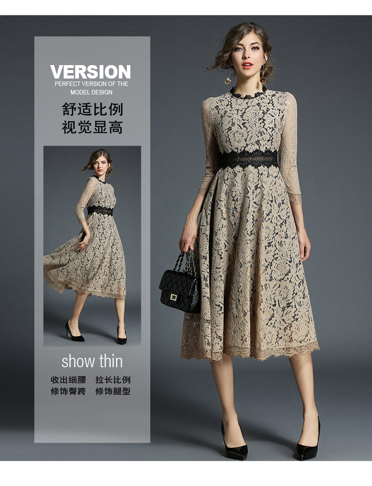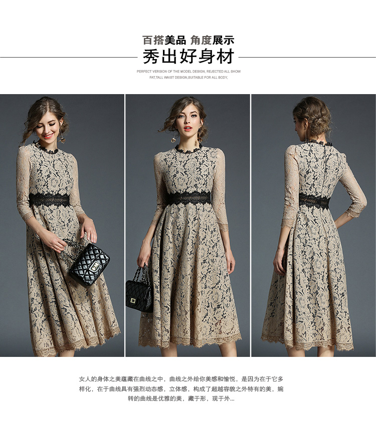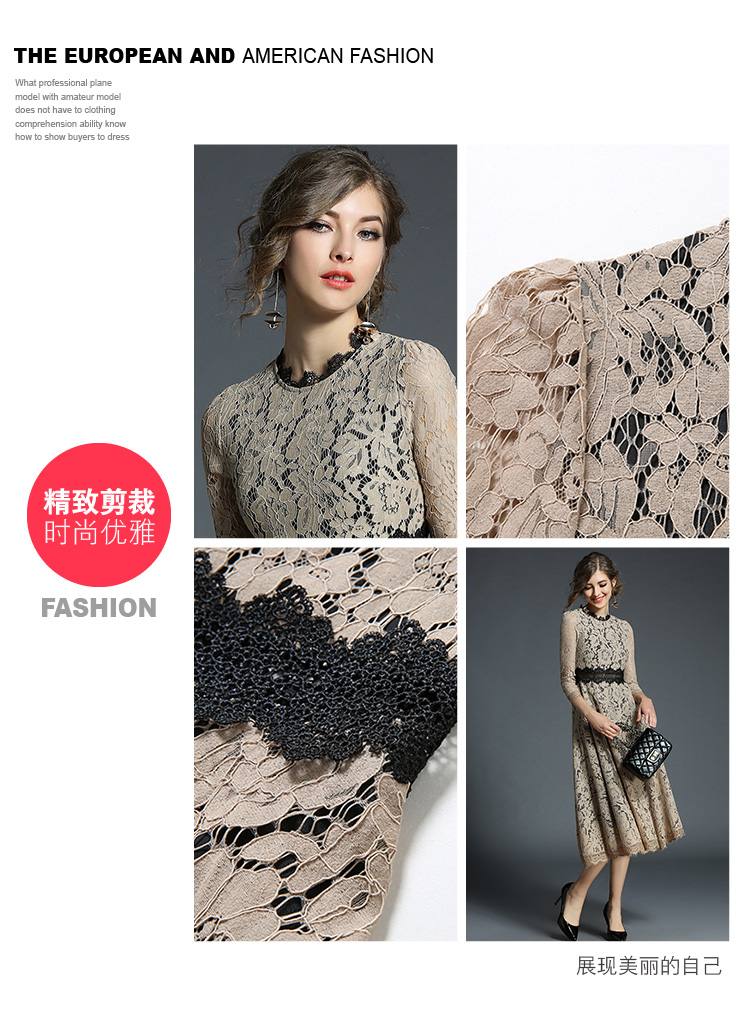 MY12552#春季欧美风钩花镂空拼接蕾丝连衣裙