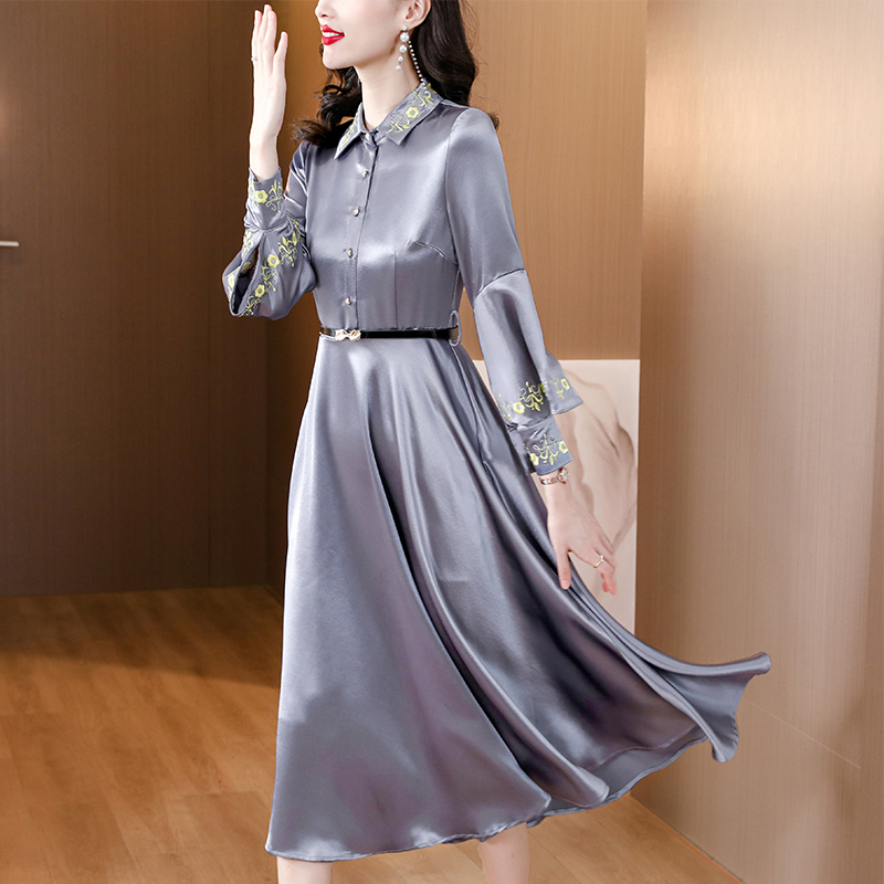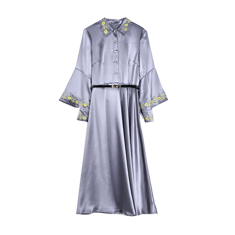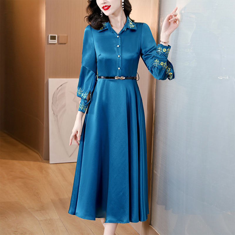 MY13325# 重工刺绣缎面长袖连衣裙显瘦洋气遮肚女装女裝貨源服裝批發