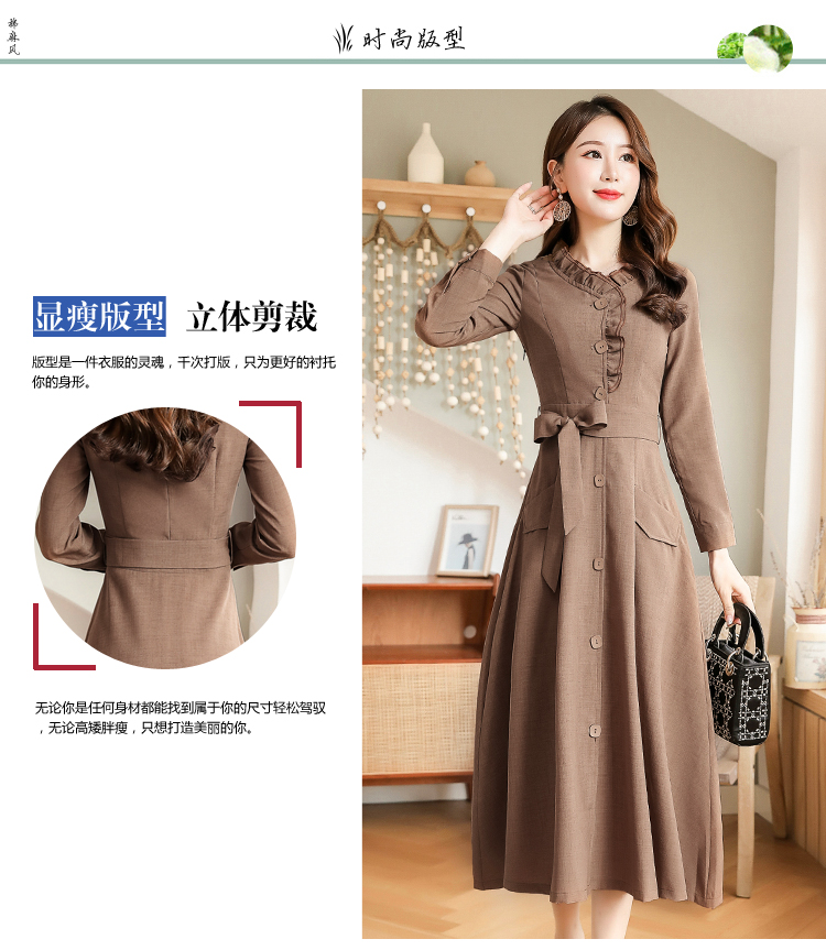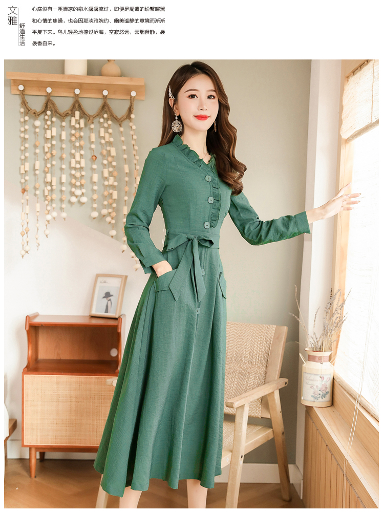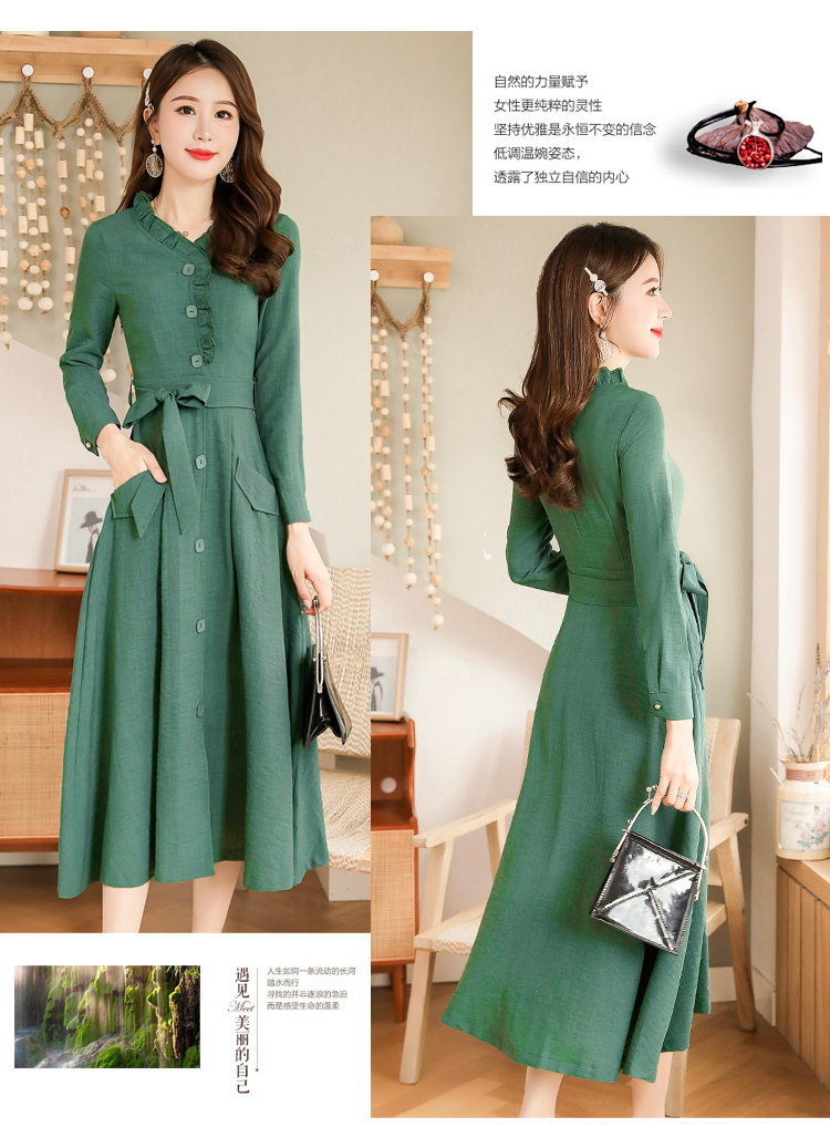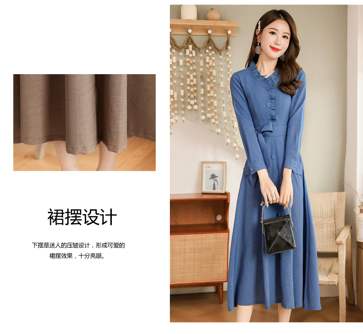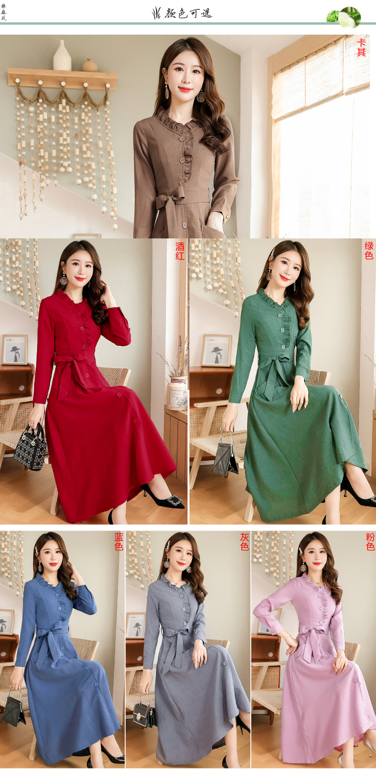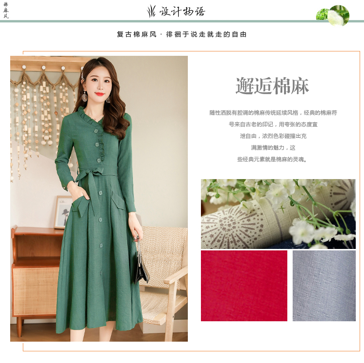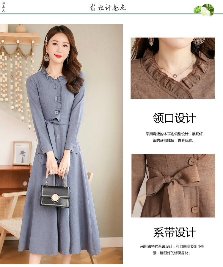 MY13327# 新款流行裙子亚麻收腰显瘦气质长袖棉麻连衣裙女裝貨源服裝批發