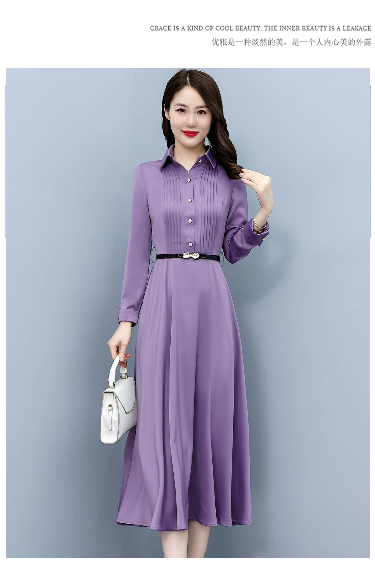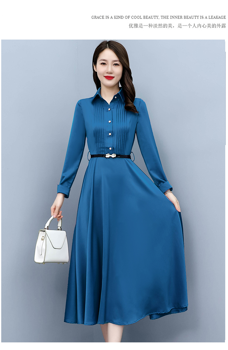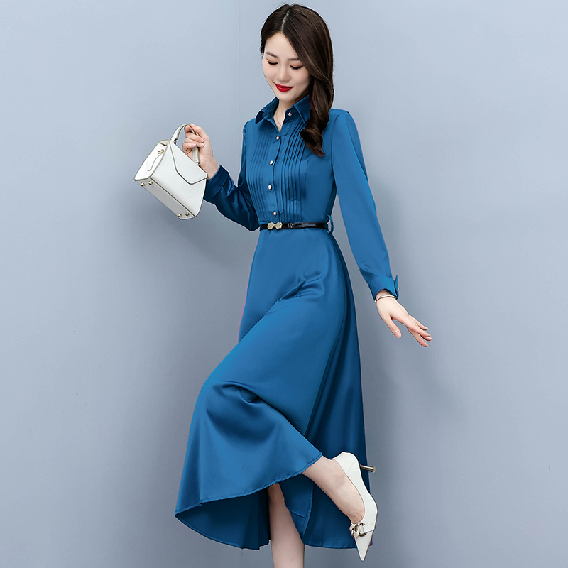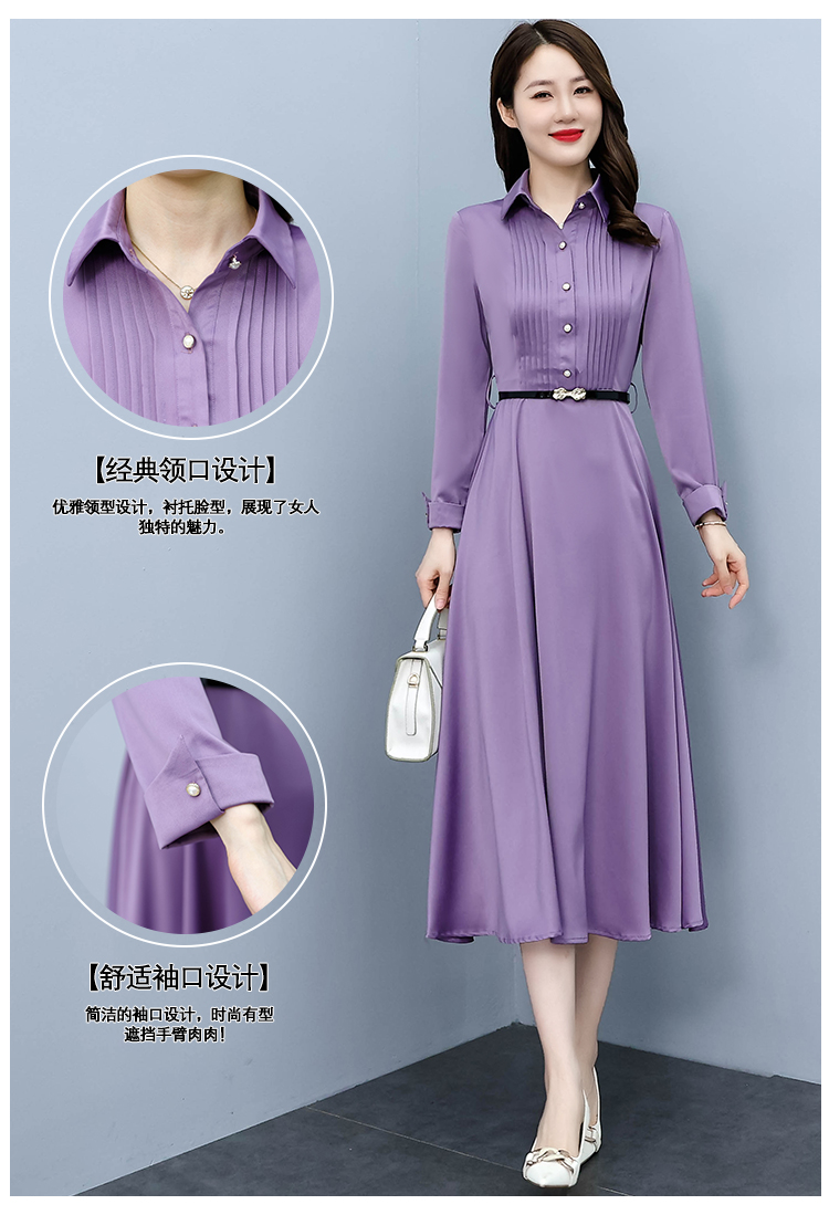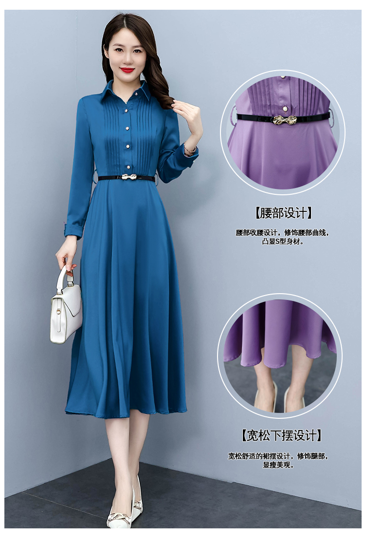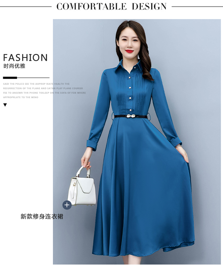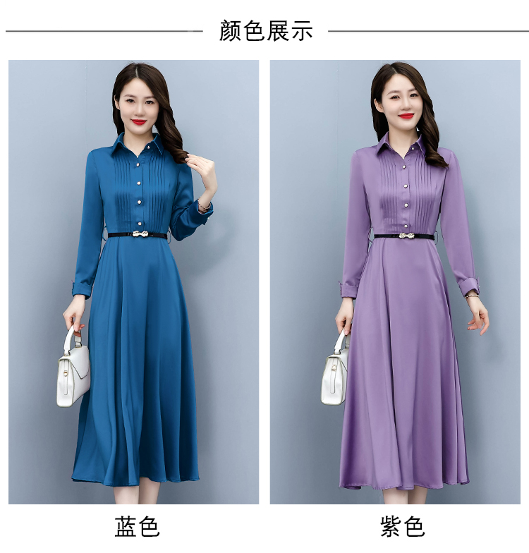 MY13331# 新款醋酸缎面长袖连衣裙气质显瘦遮肚纯色女装女裝貨源服裝批發