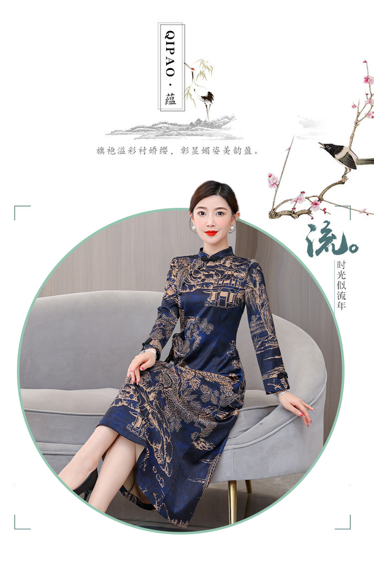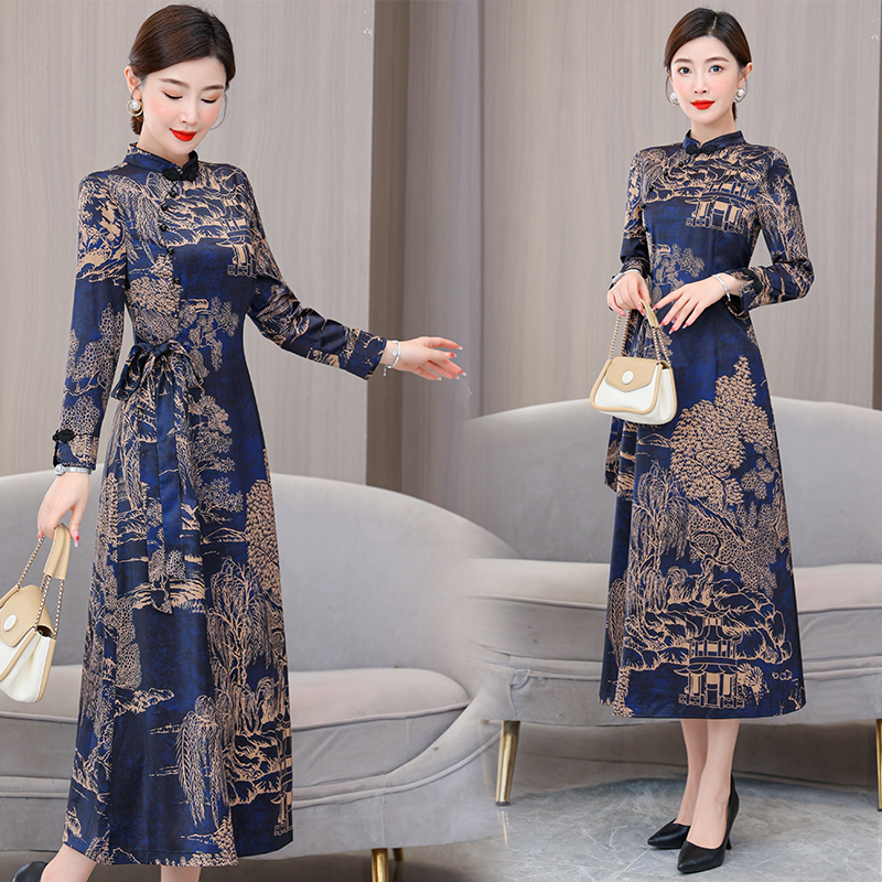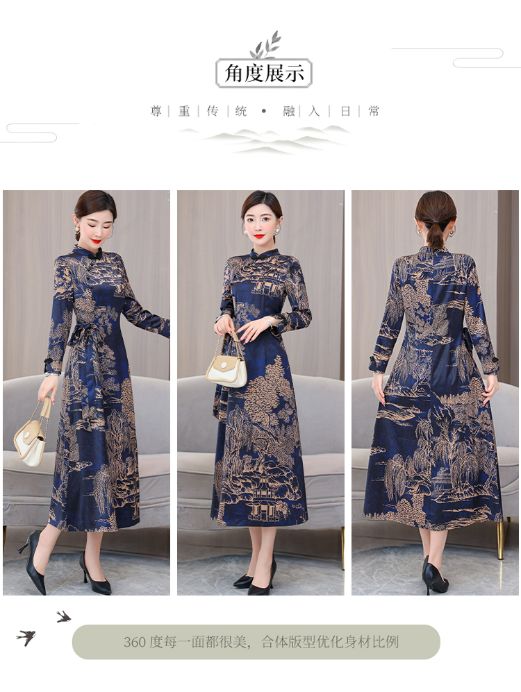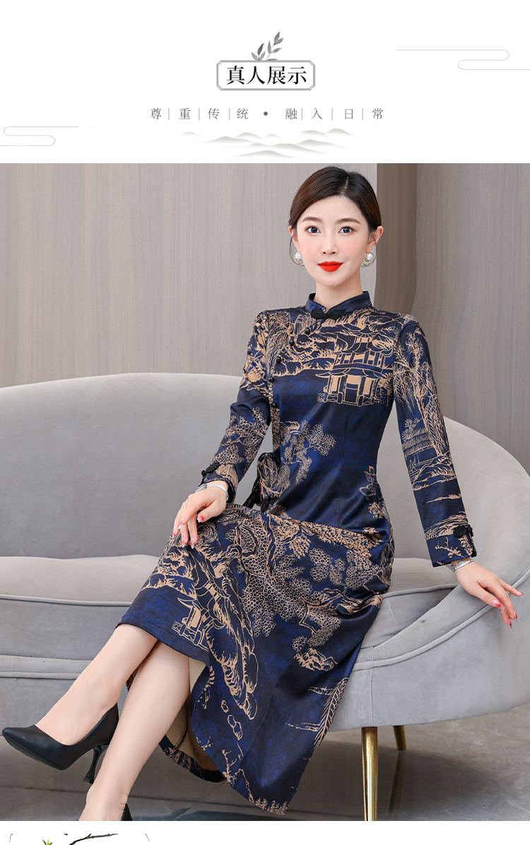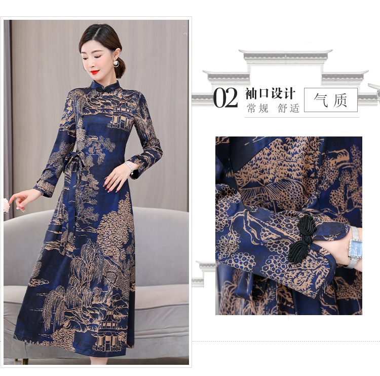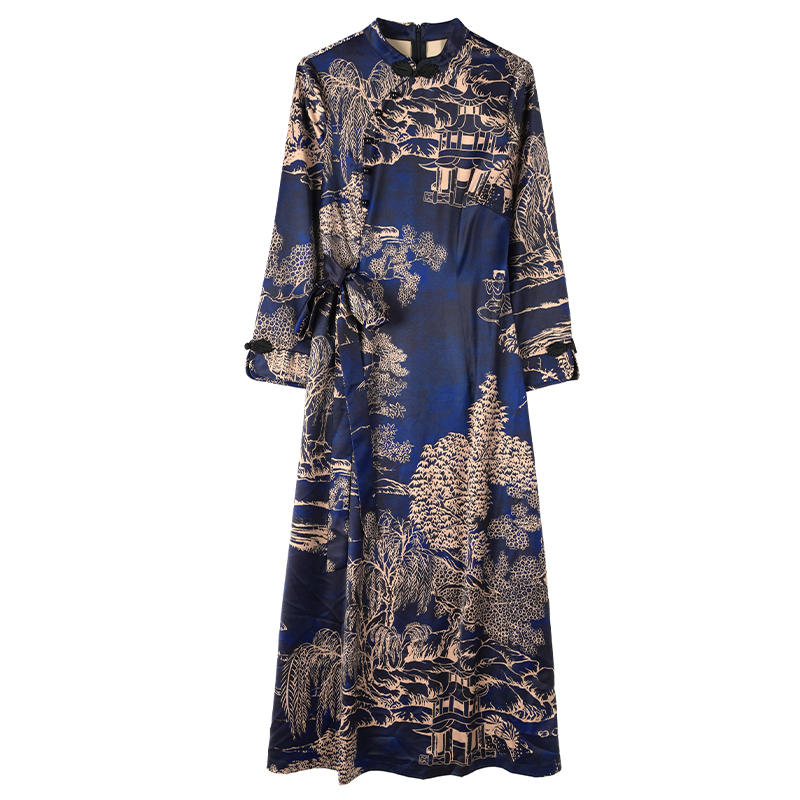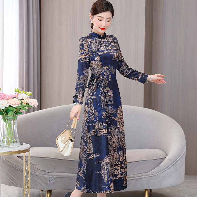 MY13333# 新款长袖缎面旗袍改良连衣裙女气质大码长裙女裝貨源服裝批發