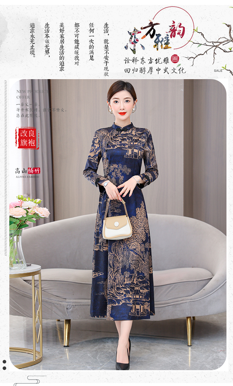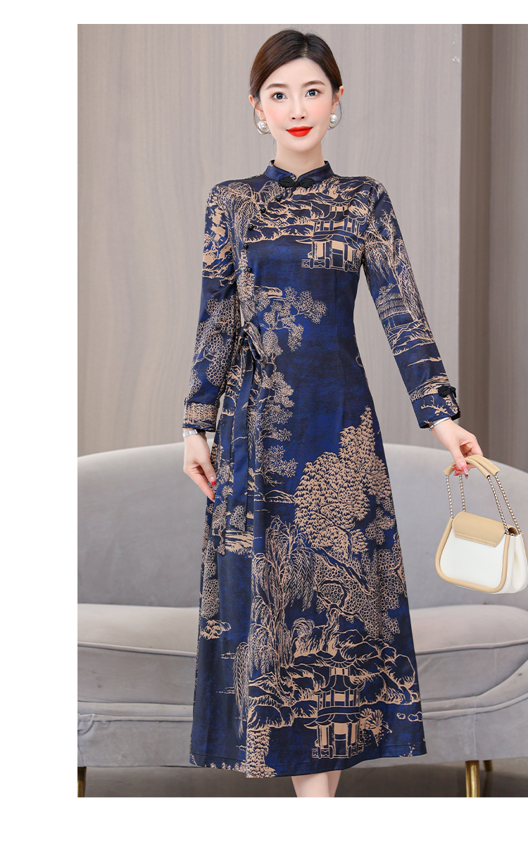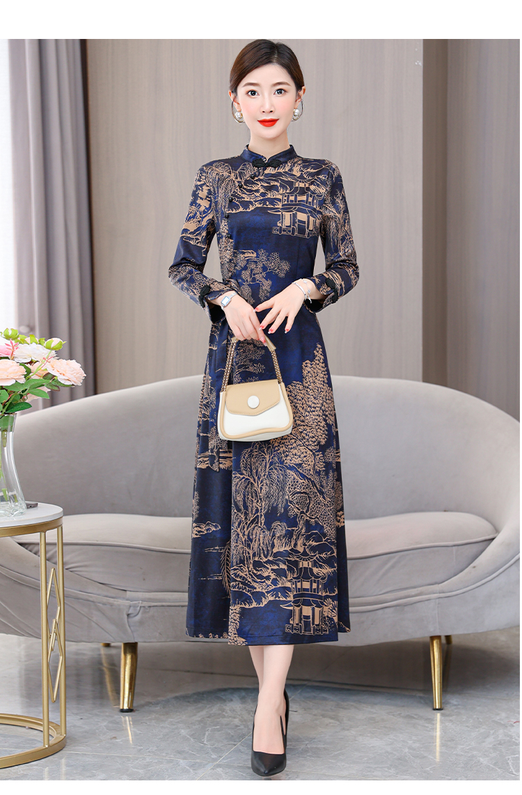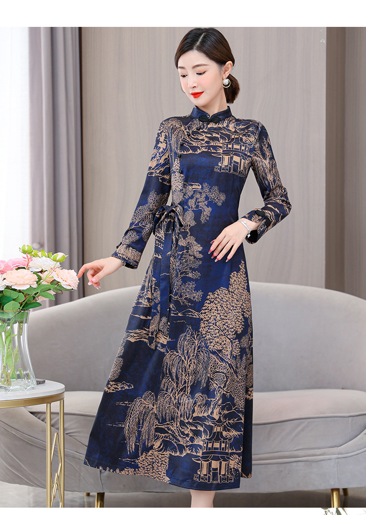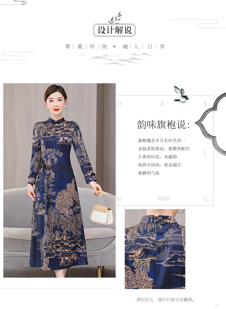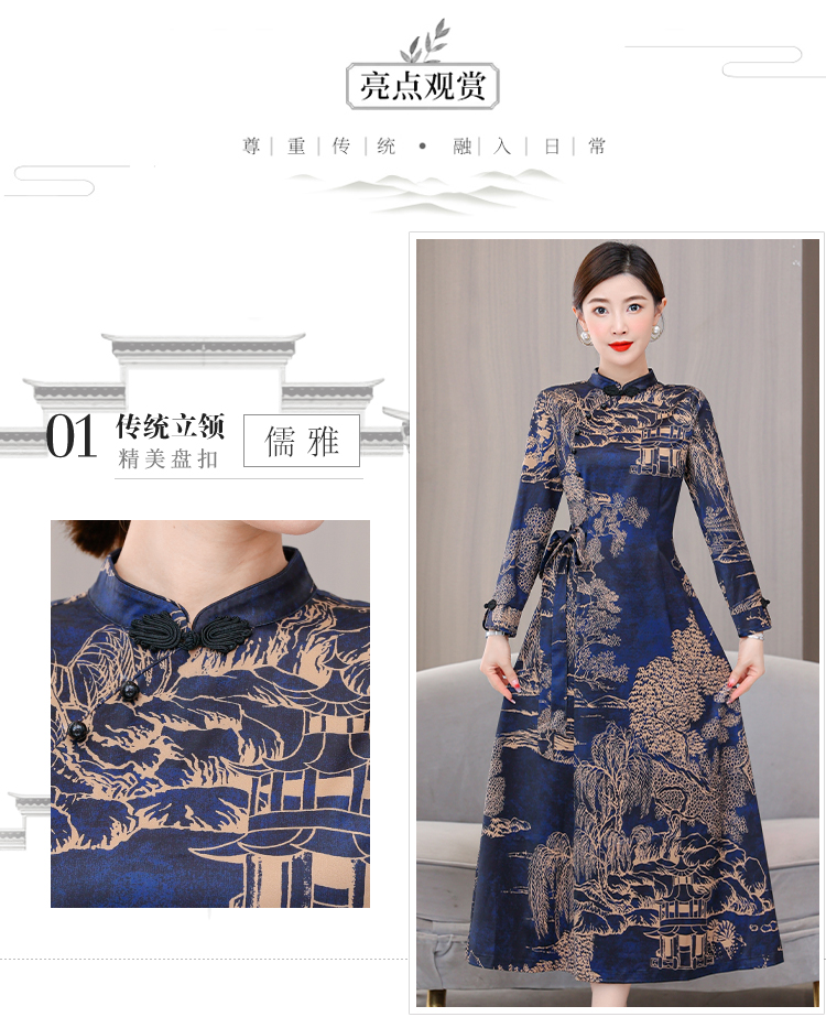 MY13333# 新款长袖缎面旗袍改良连衣裙女气质大码长裙女裝貨源服裝批發