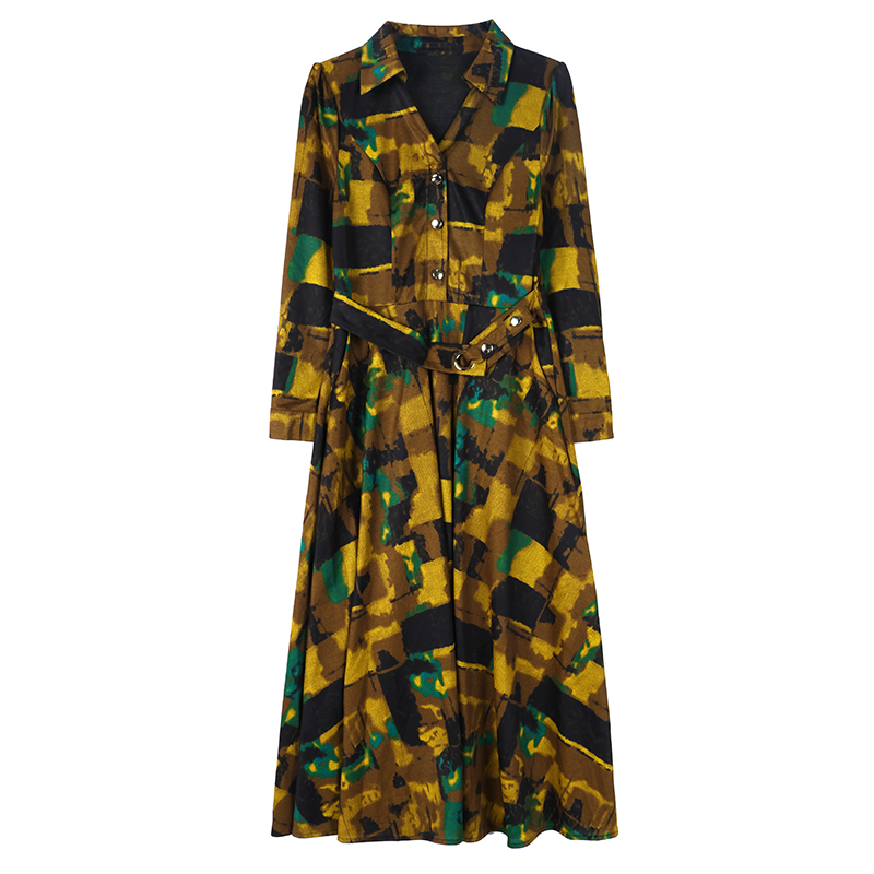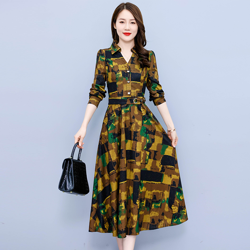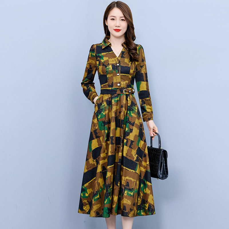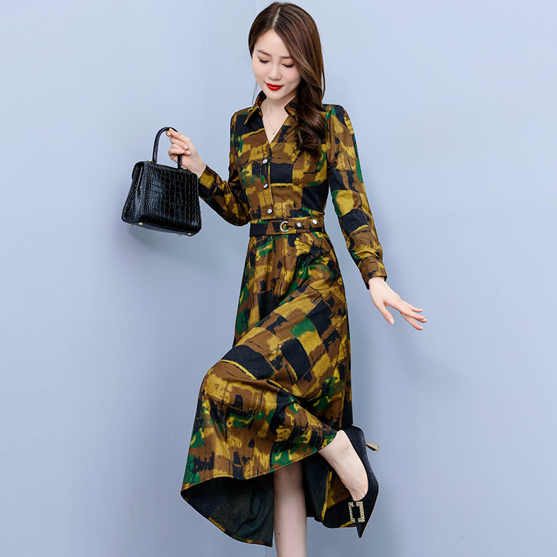 MY13335# 立领长袖印花连衣裙新款韩版修身中长裙女女裝貨源服裝批發