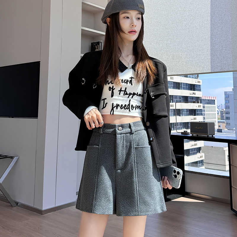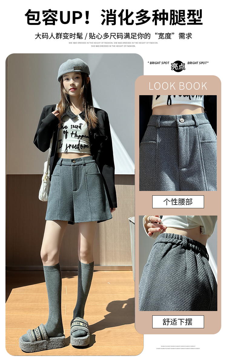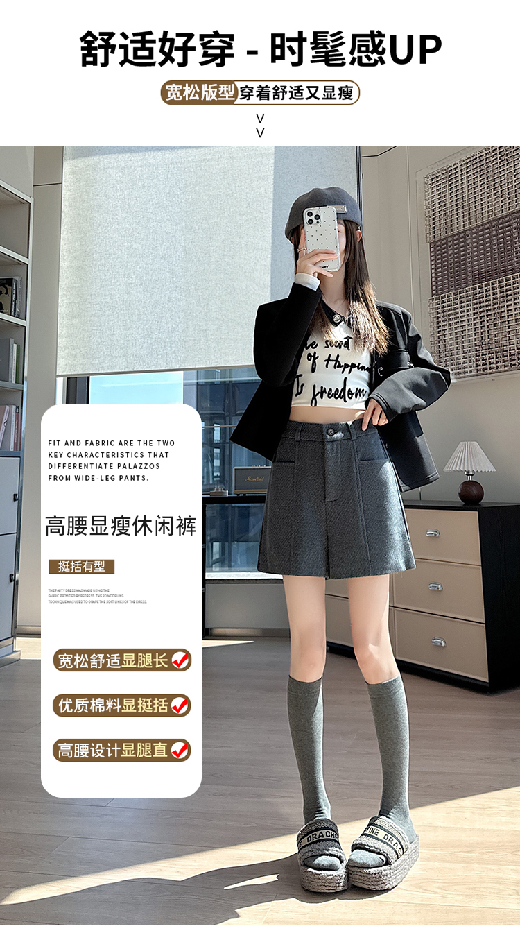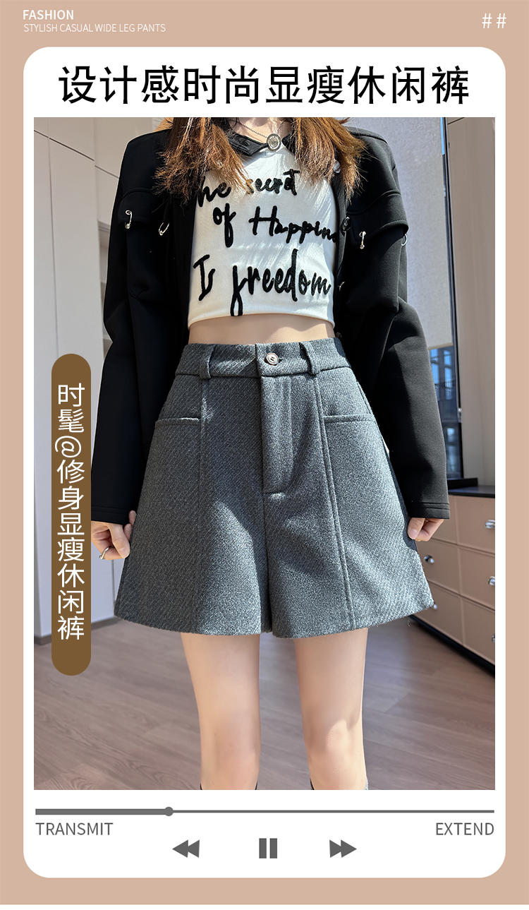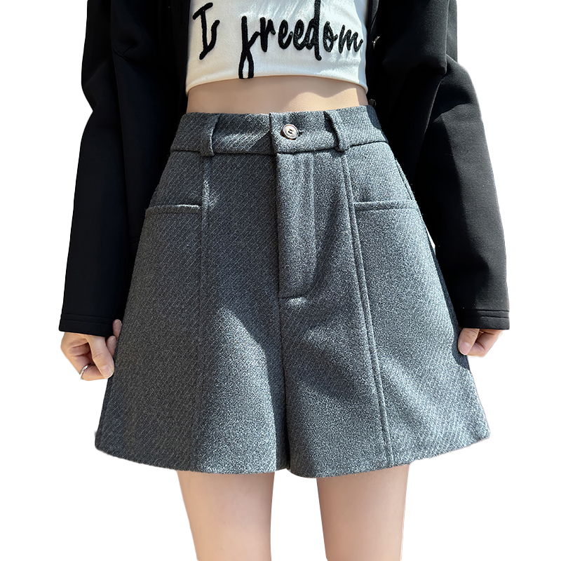MY13573# 灰色高腰毛呢短裤百搭外穿显瘦a字裤休闲靴裤子女裝貨源服裝批發