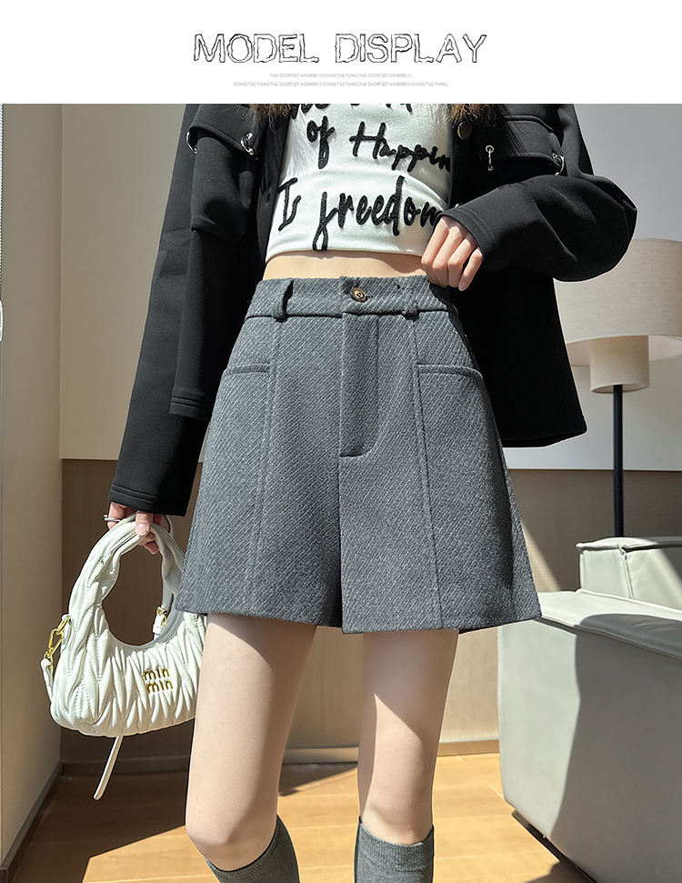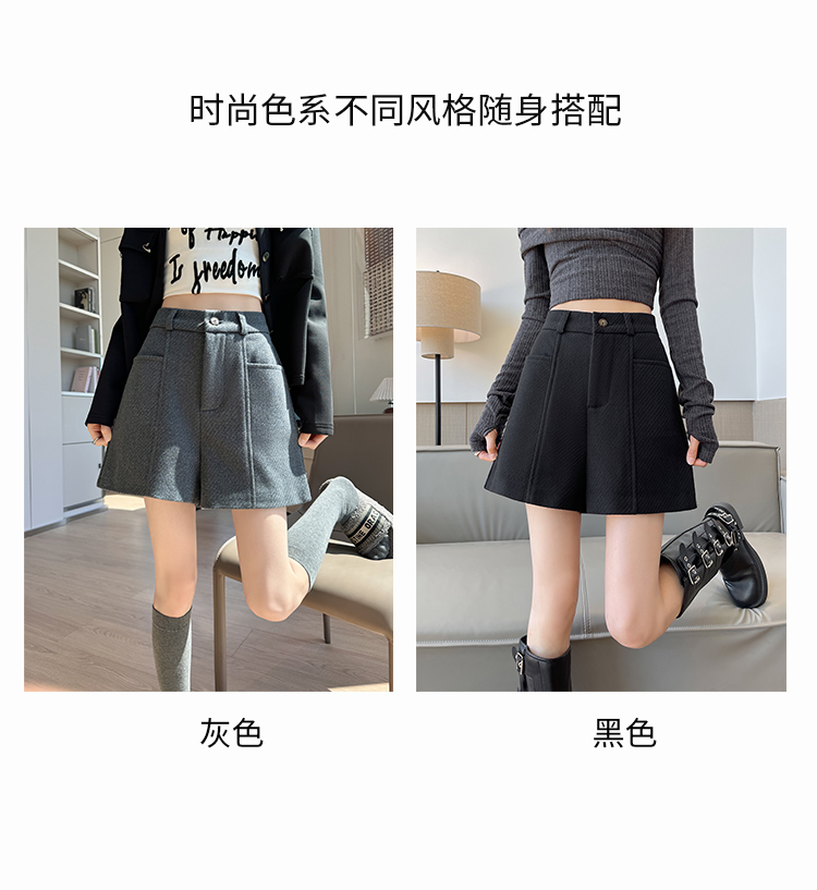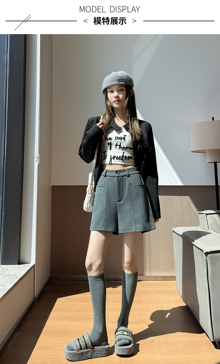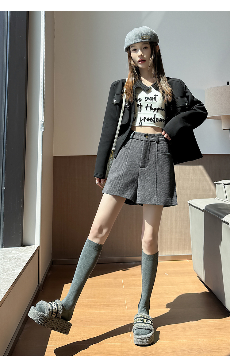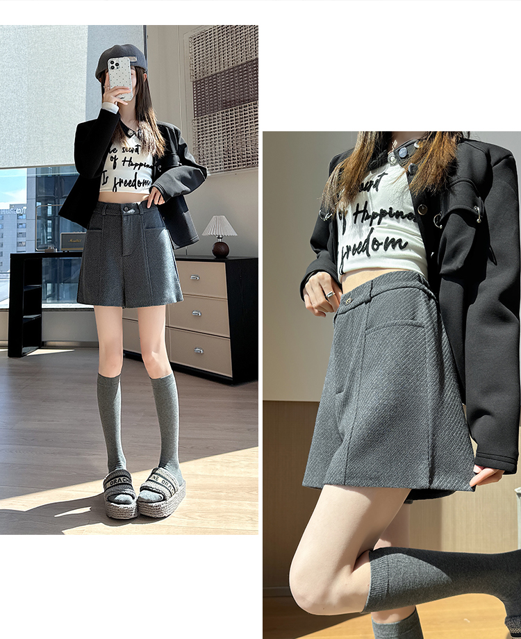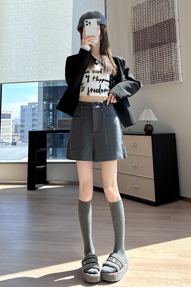 MY13573# 灰色高腰毛呢短裤百搭外穿显瘦a字裤休闲靴裤子女裝貨源服裝批發