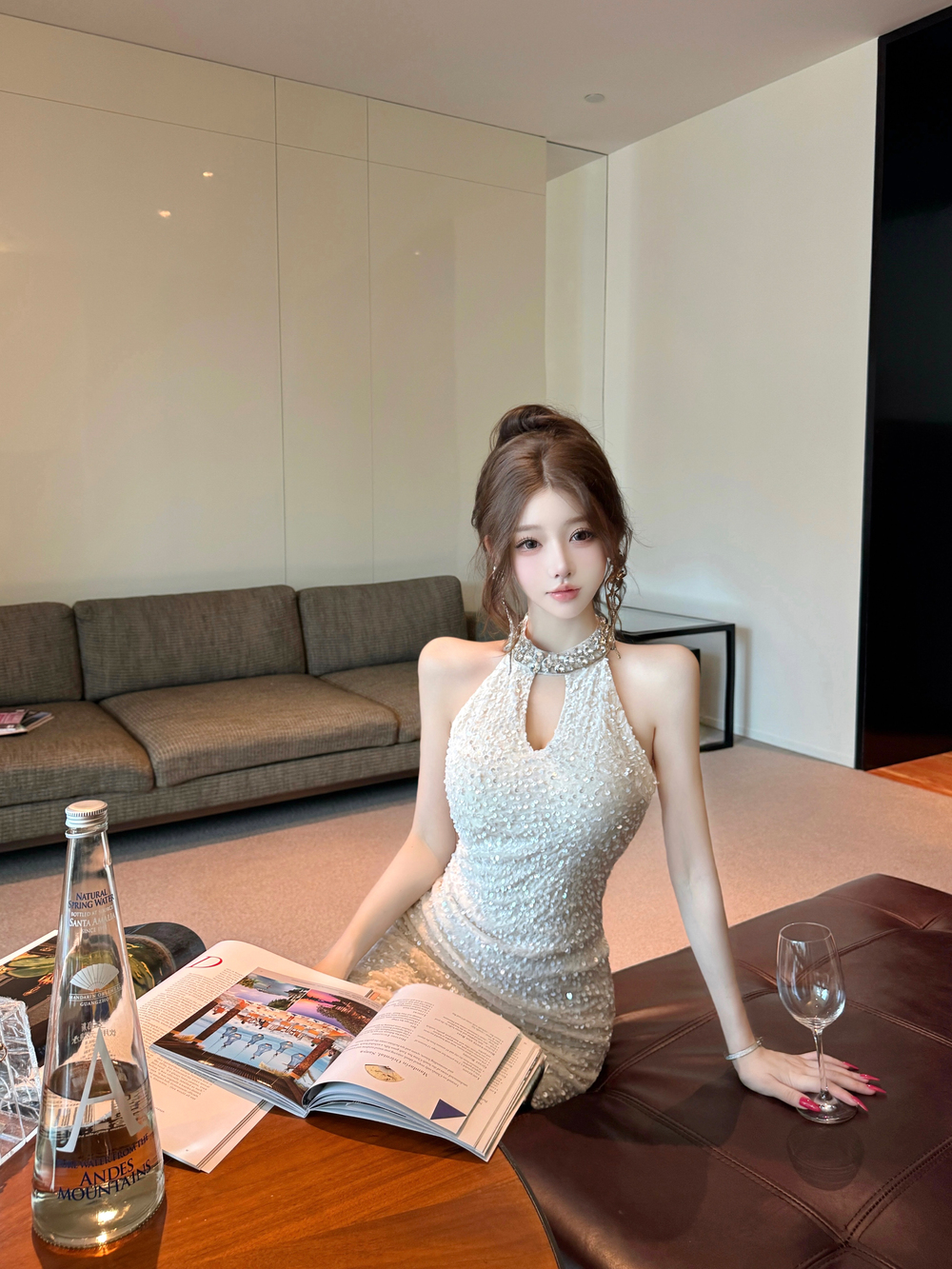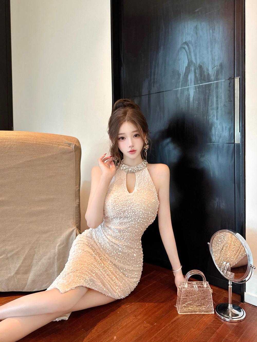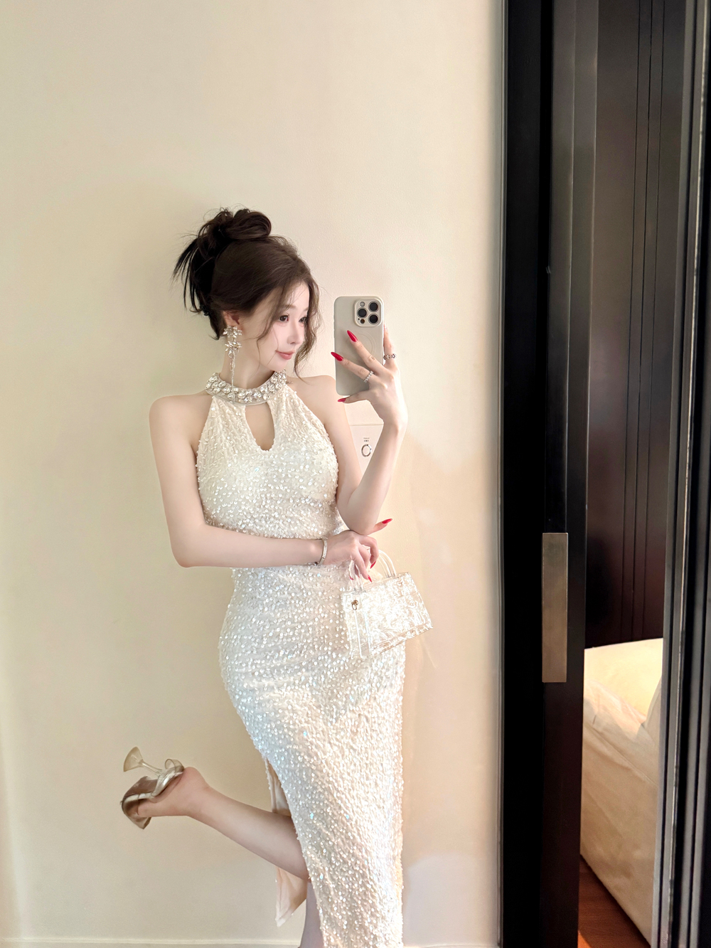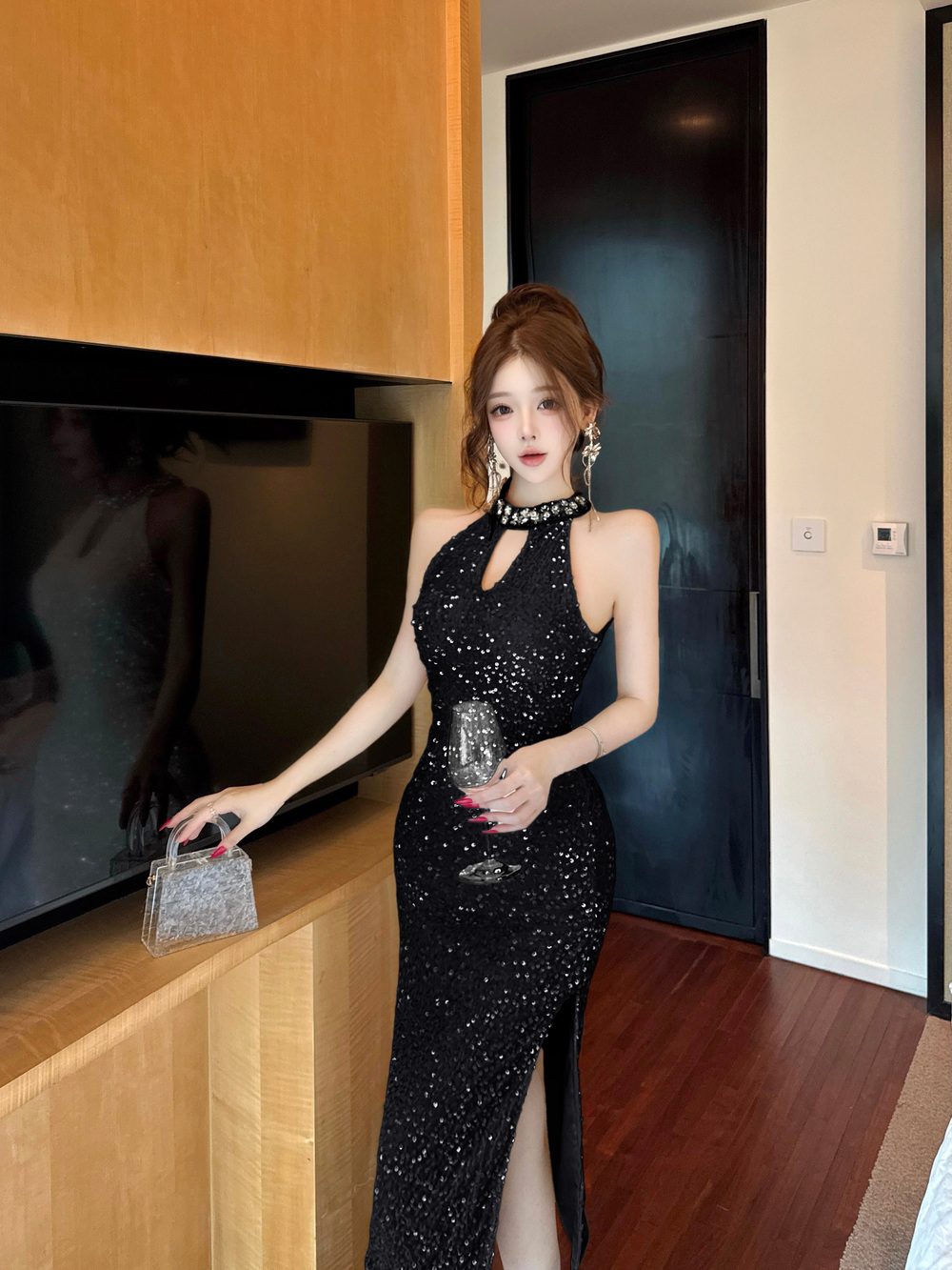 MY13630# 名媛御姐风高端精致镶钻亮片宴会礼服开叉镂空挂脖连衣裙女裝貨源服裝批發