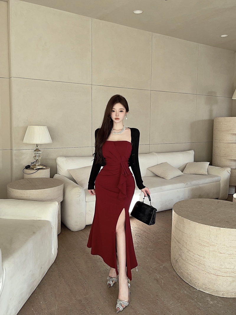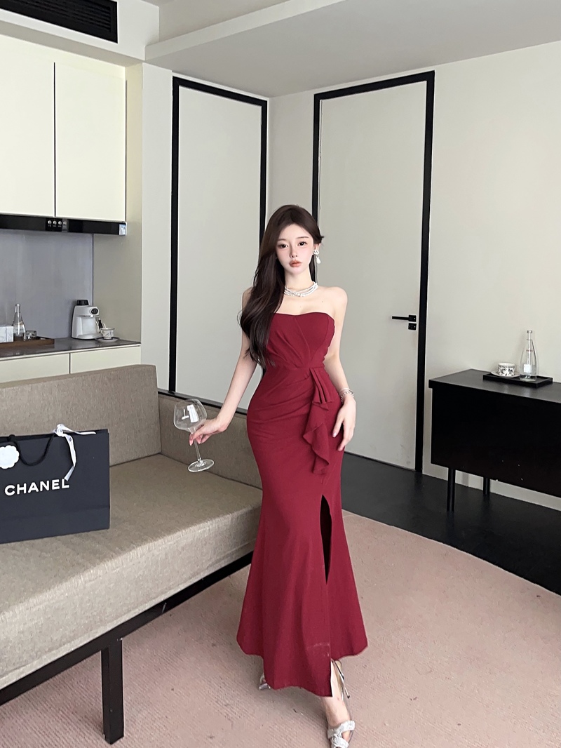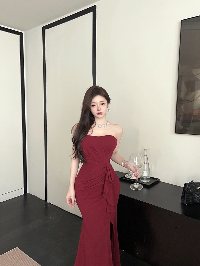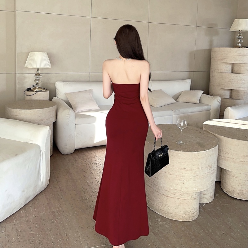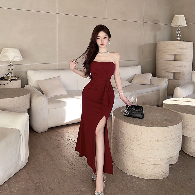 MY13638# 名媛气质露锁骨长款开叉鱼尾抹胸宴会礼服显瘦包臀连衣裙女裝貨源服裝批發