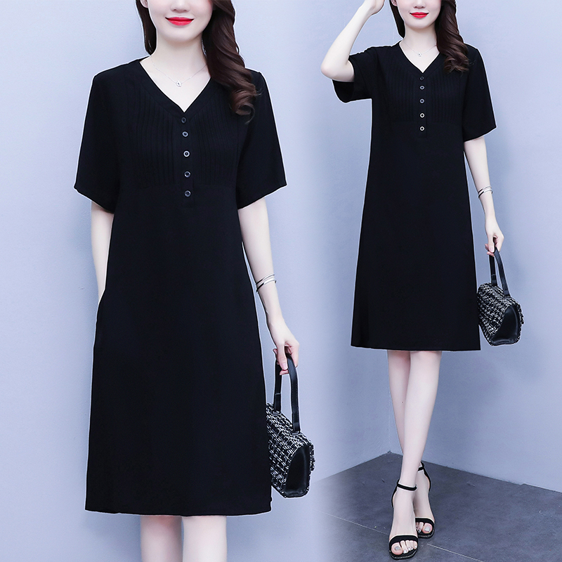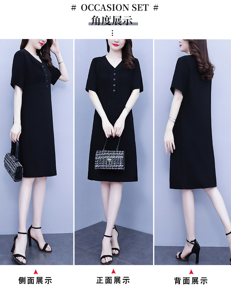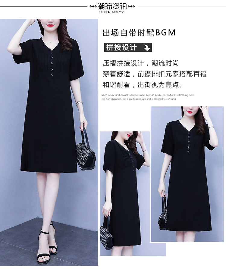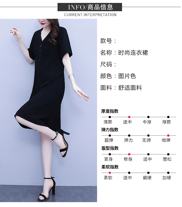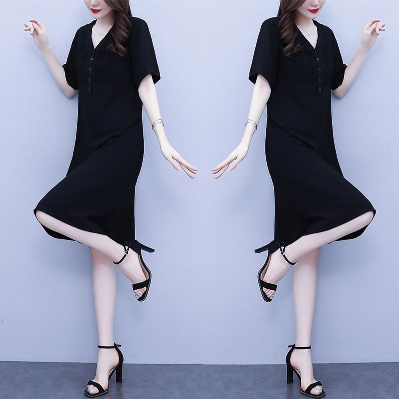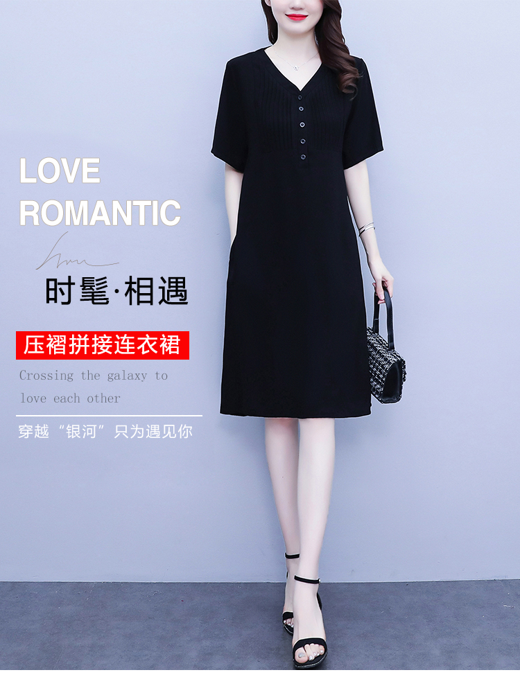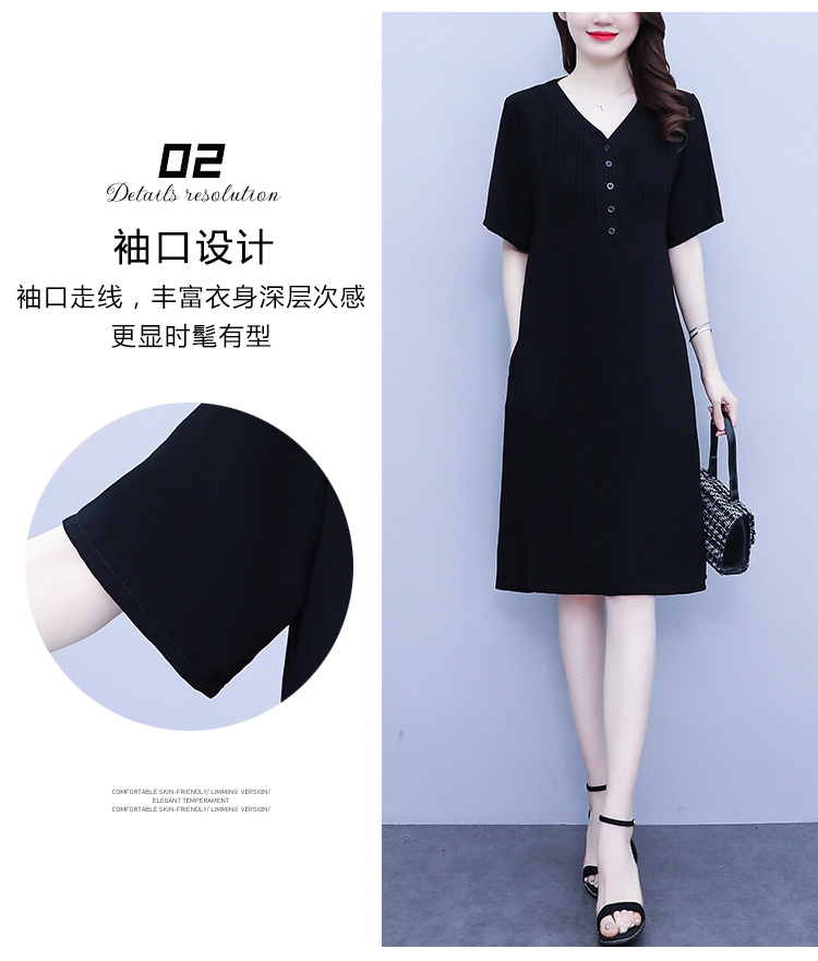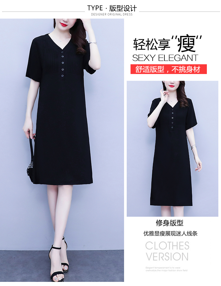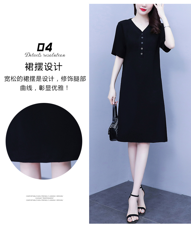 BY9151#夏季新款大码V领黑色雪纺宽松时尚气质遮肚显瘦连衣裙