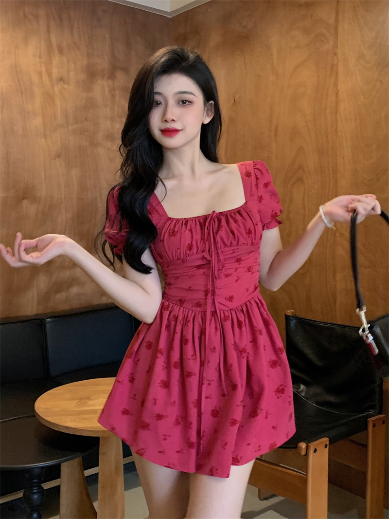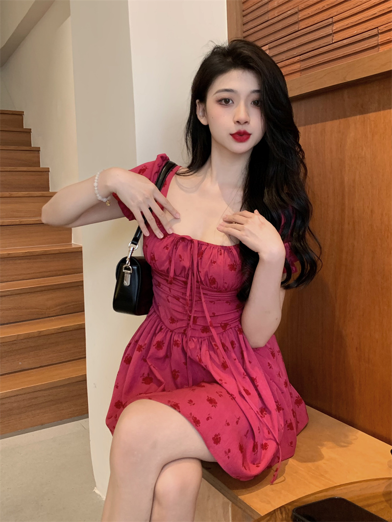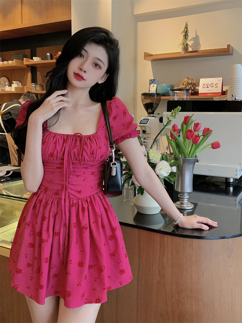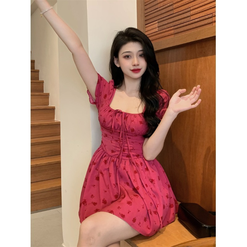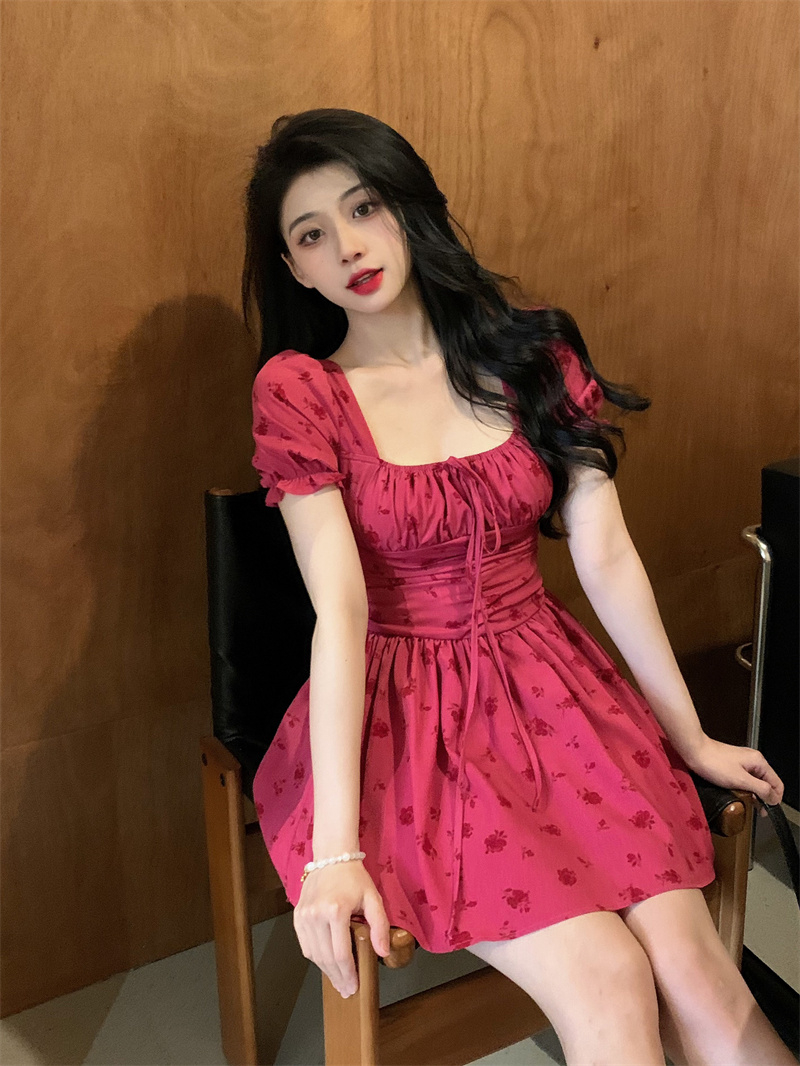 MY13895# 甜美泡泡袖方领裙子夏季2025年新款收腰显瘦小众气质短袖连衣裙女女裝貨源服裝批發