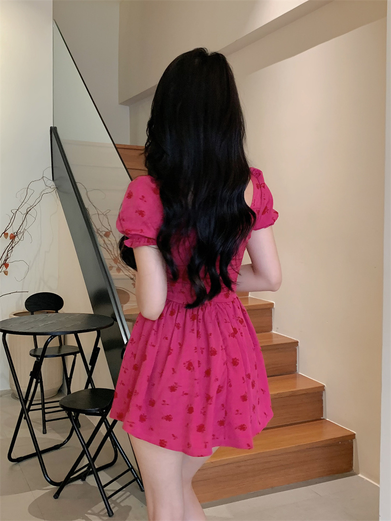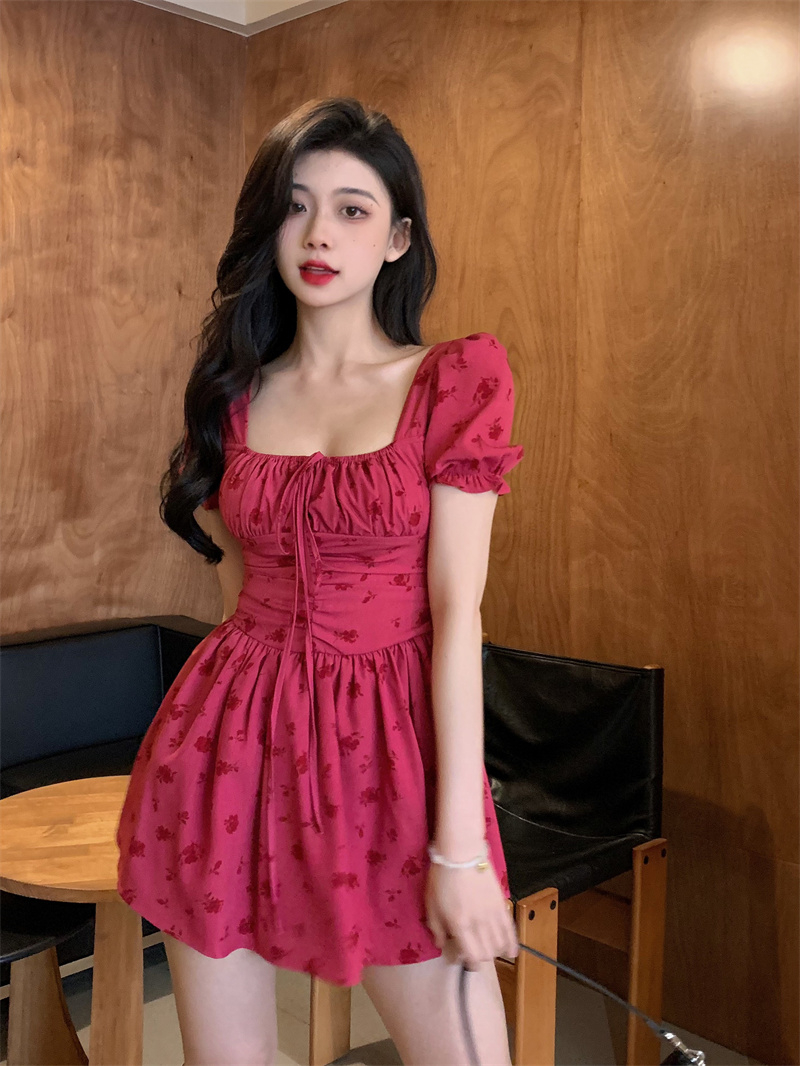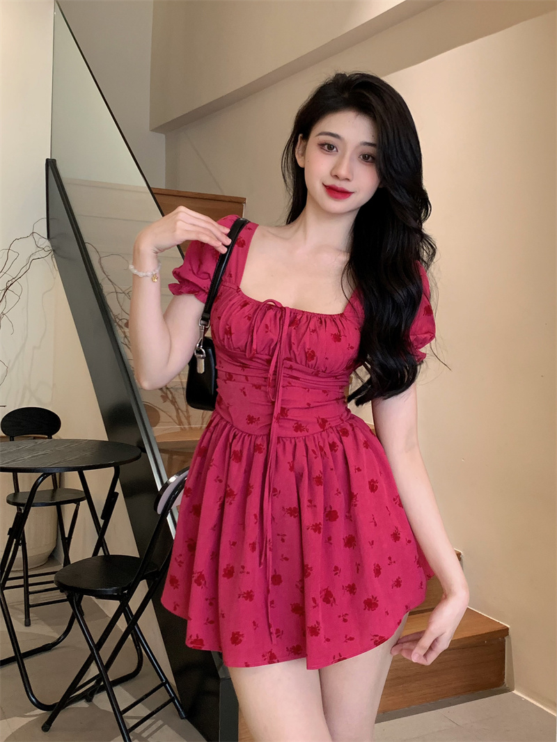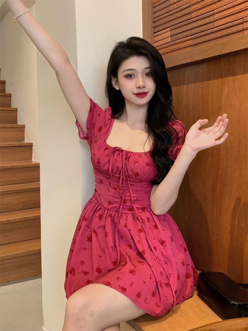 MY13895# 甜美泡泡袖方领裙子夏季2025年新款收腰显瘦小众气质短袖连衣裙女女裝貨源服裝批發