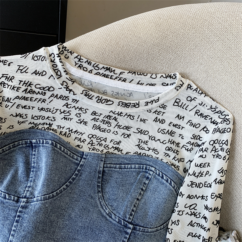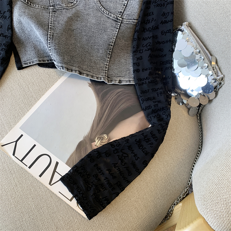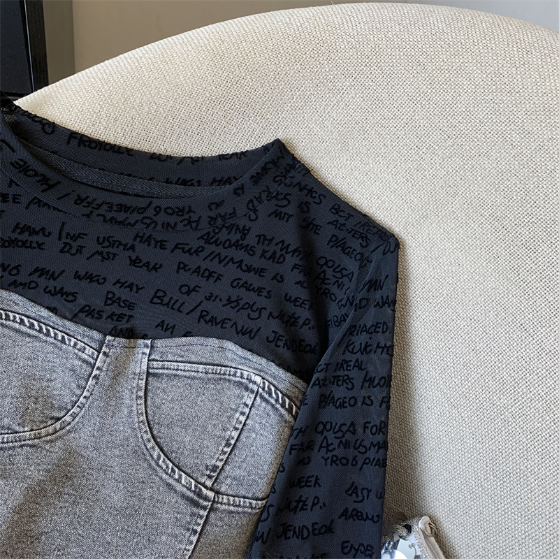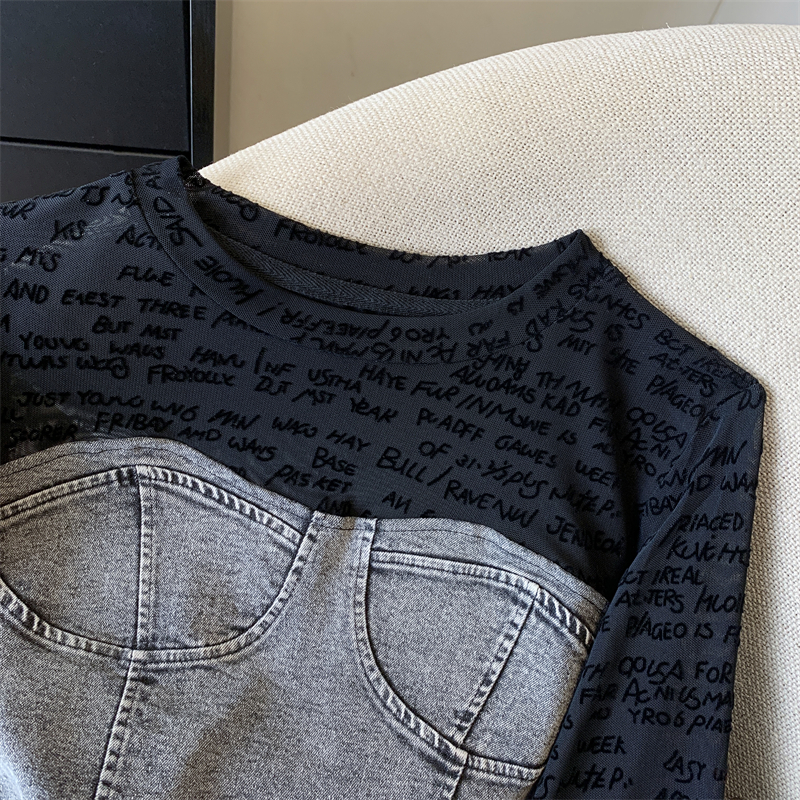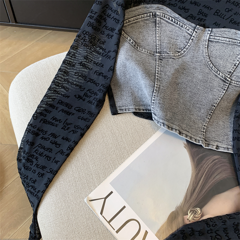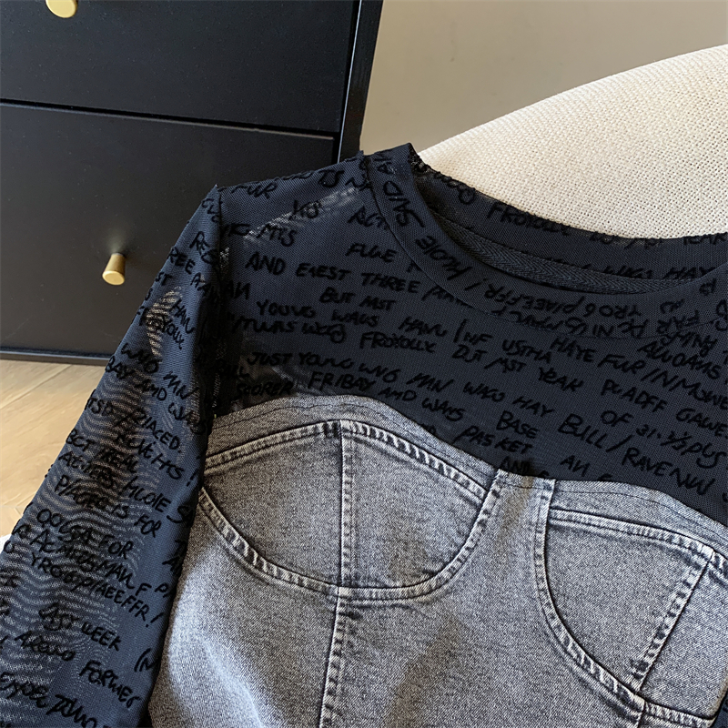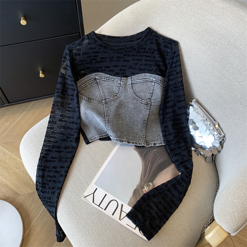 MY13994# 甜酷辣妹短款牛仔网纱拼接上衣女长袖t恤小衫女裝貨源服裝批發