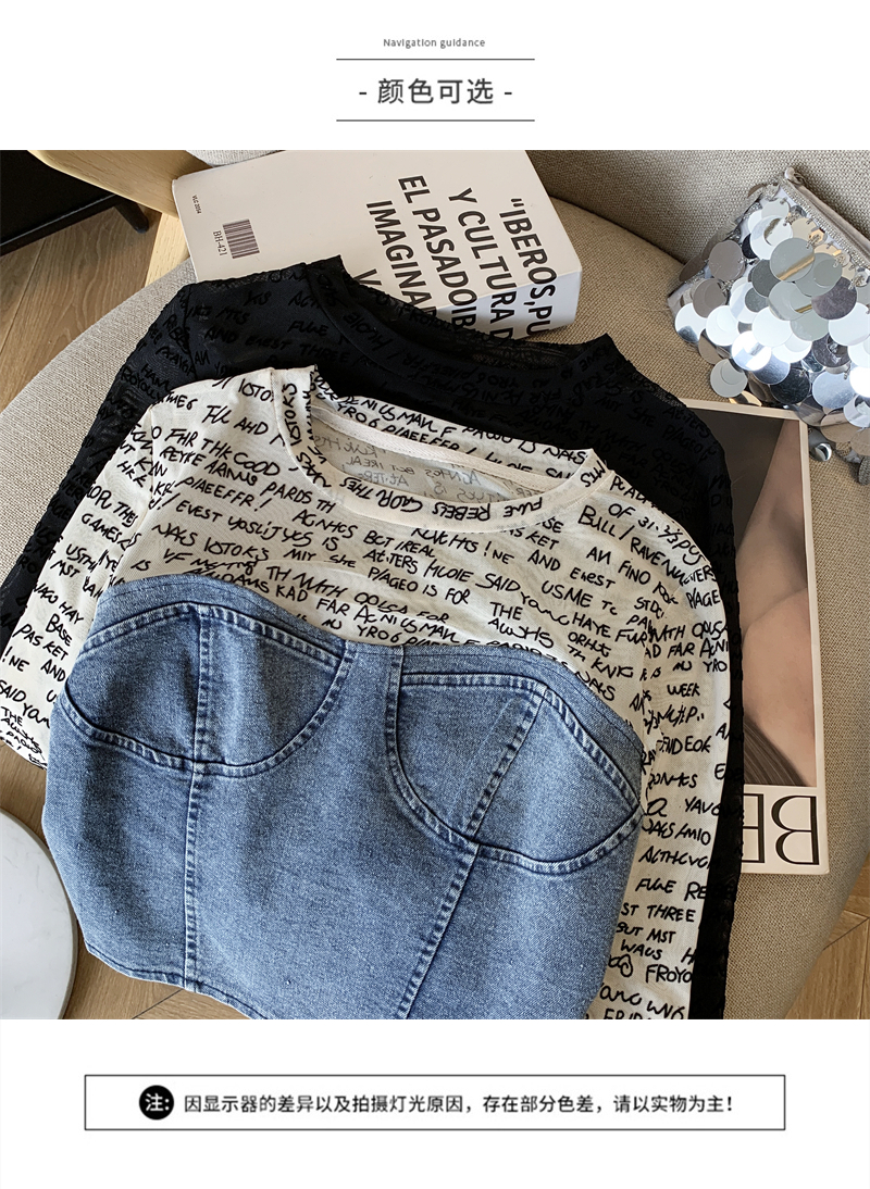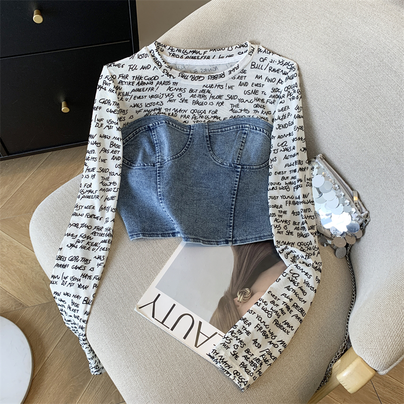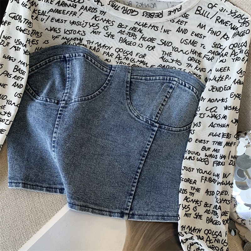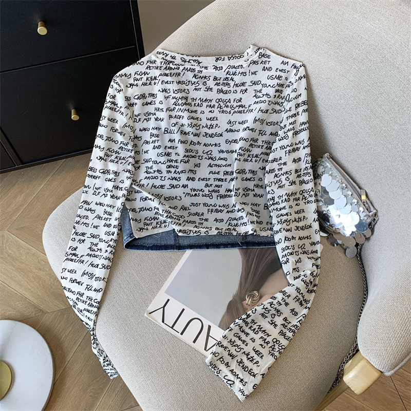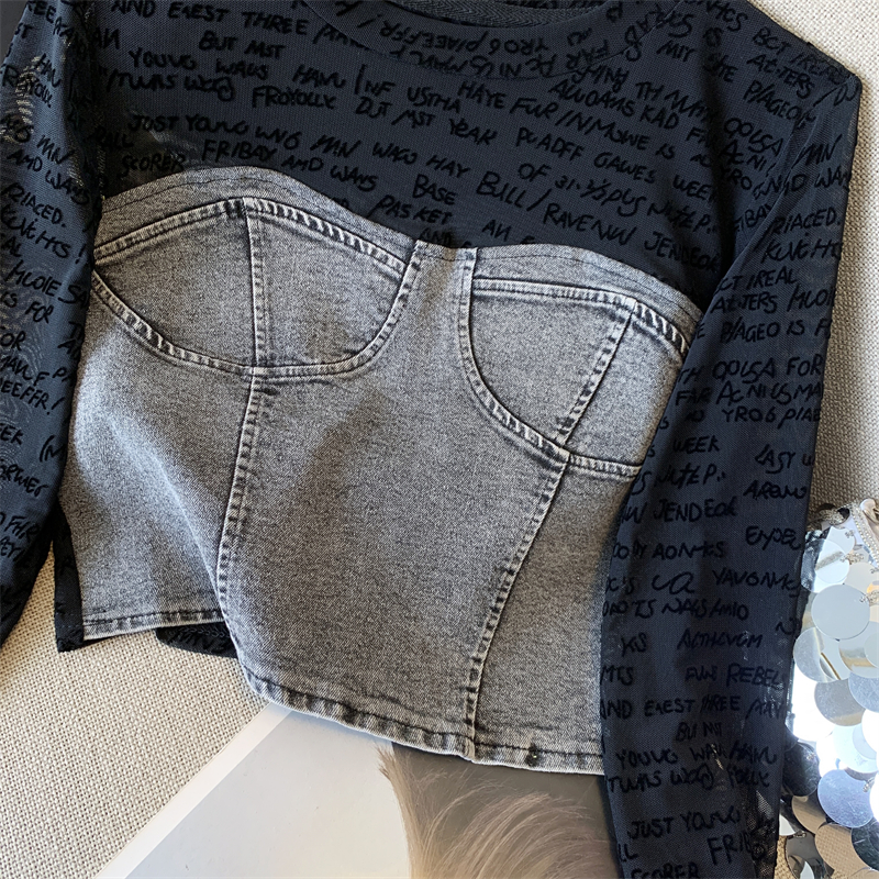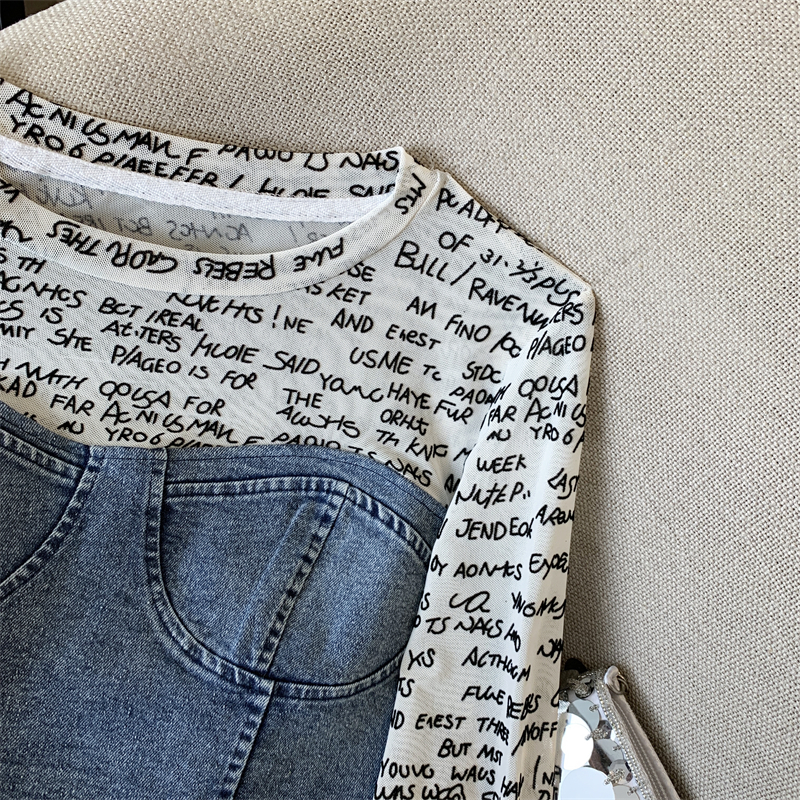 MY13994# 甜酷辣妹短款牛仔网纱拼接上衣女长袖t恤小衫女裝貨源服裝批發