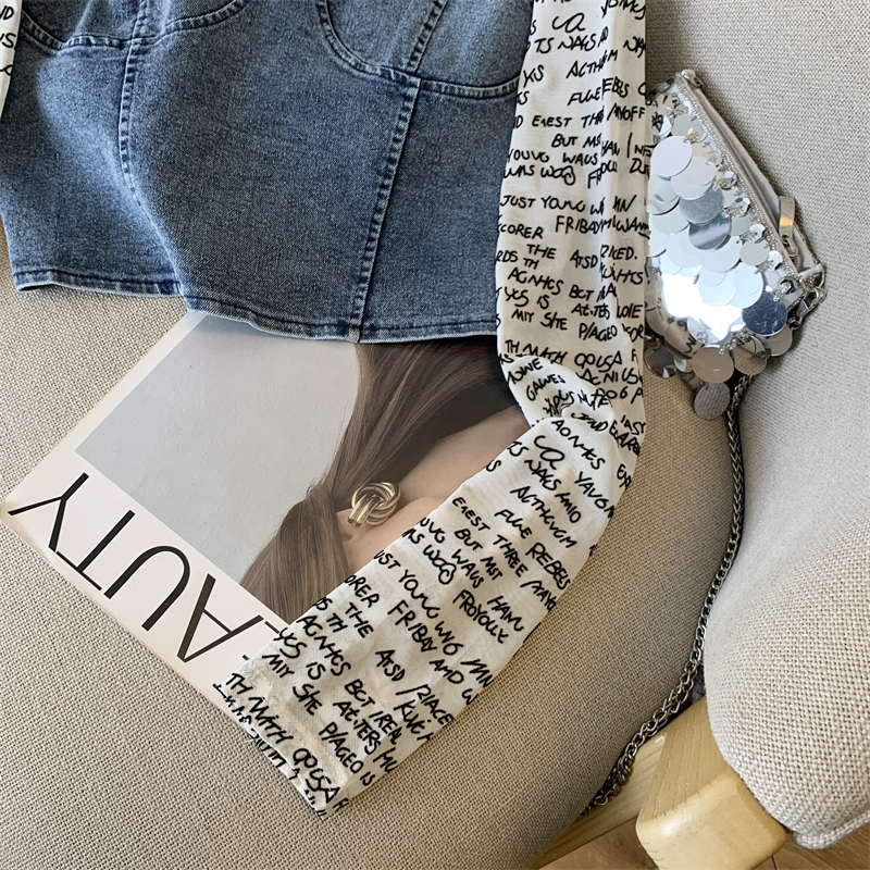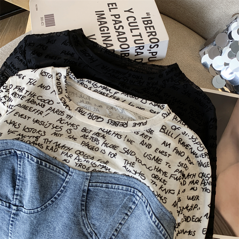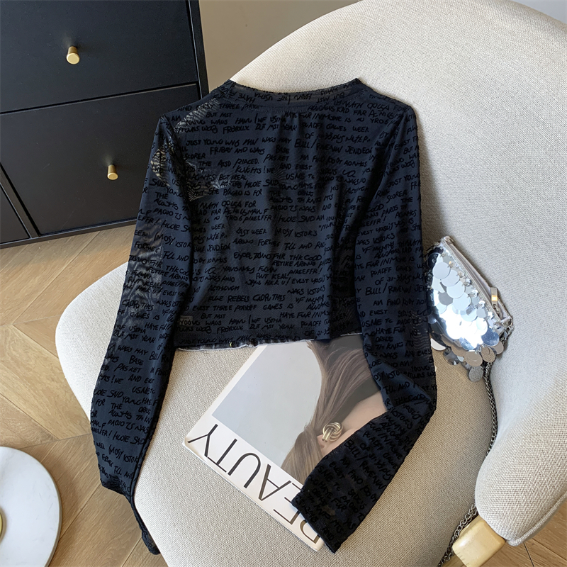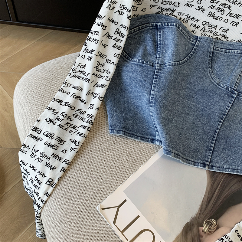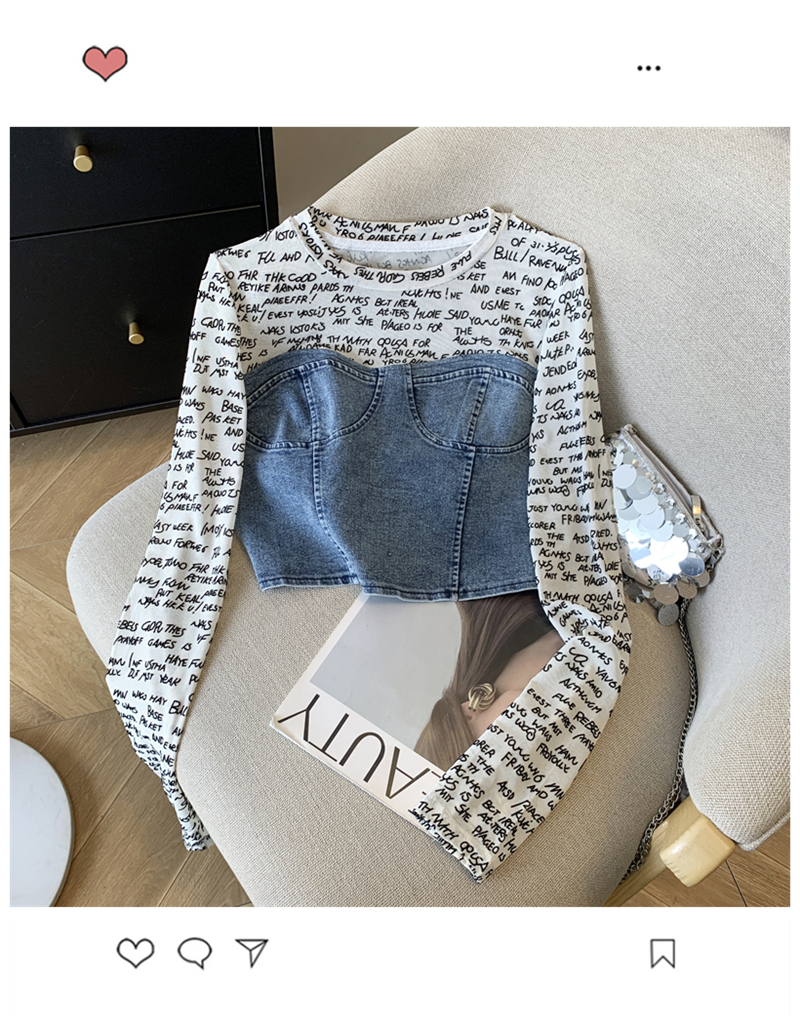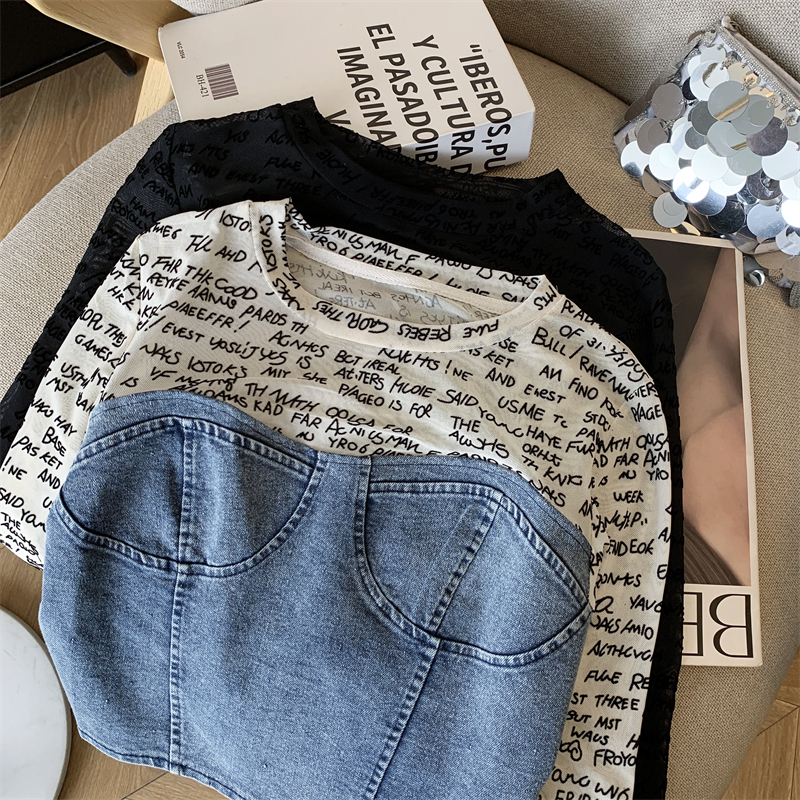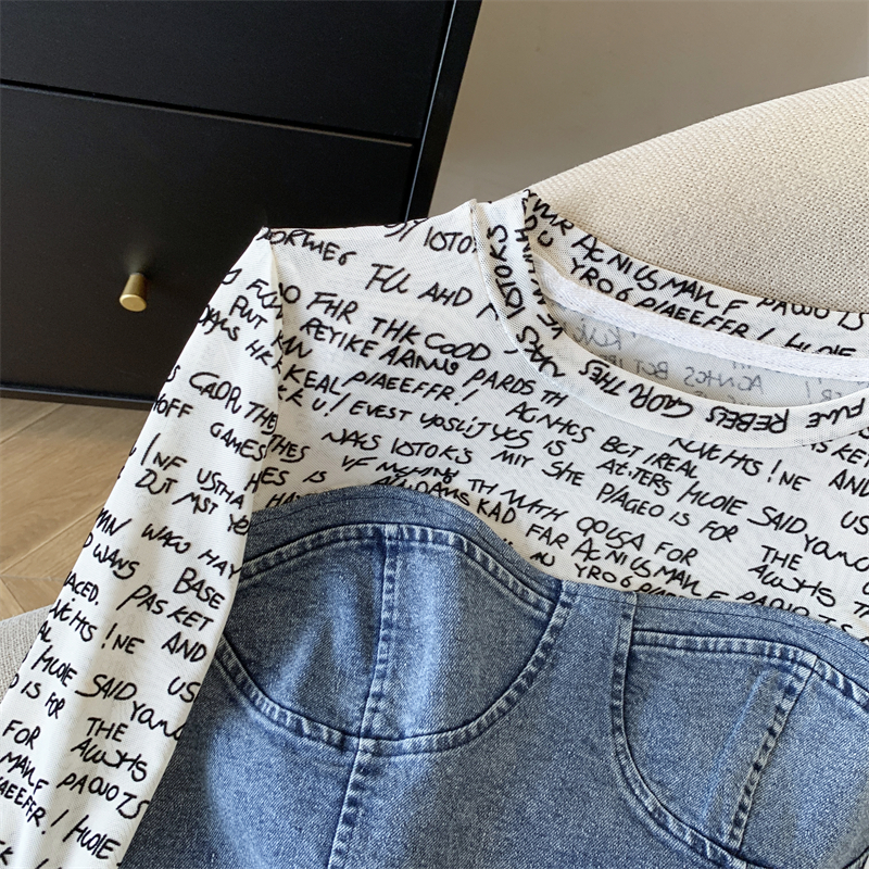 MY13994# 甜酷辣妹短款牛仔网纱拼接上衣女长袖t恤小衫女裝貨源服裝批發