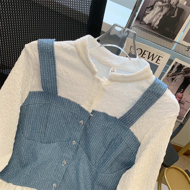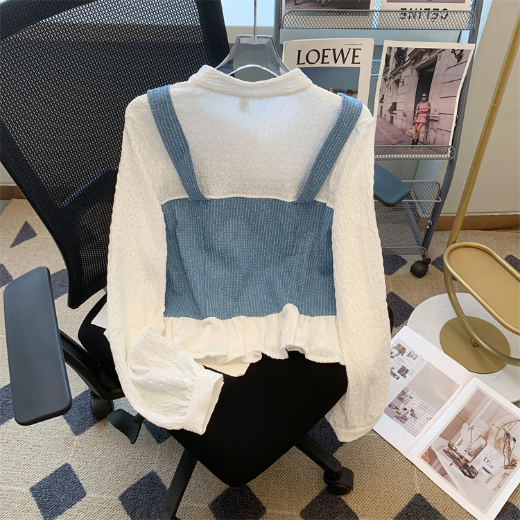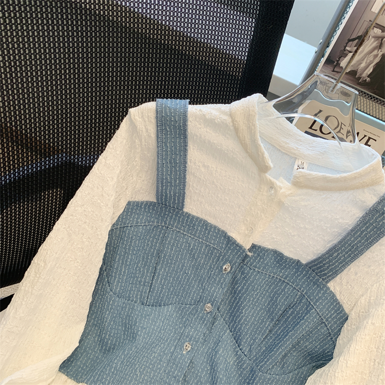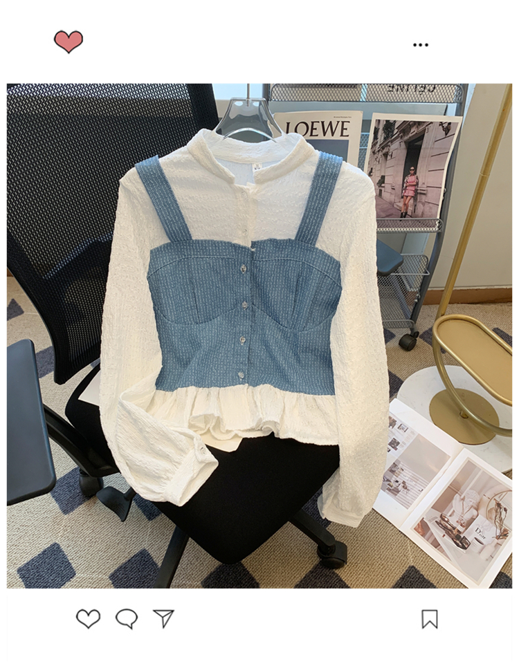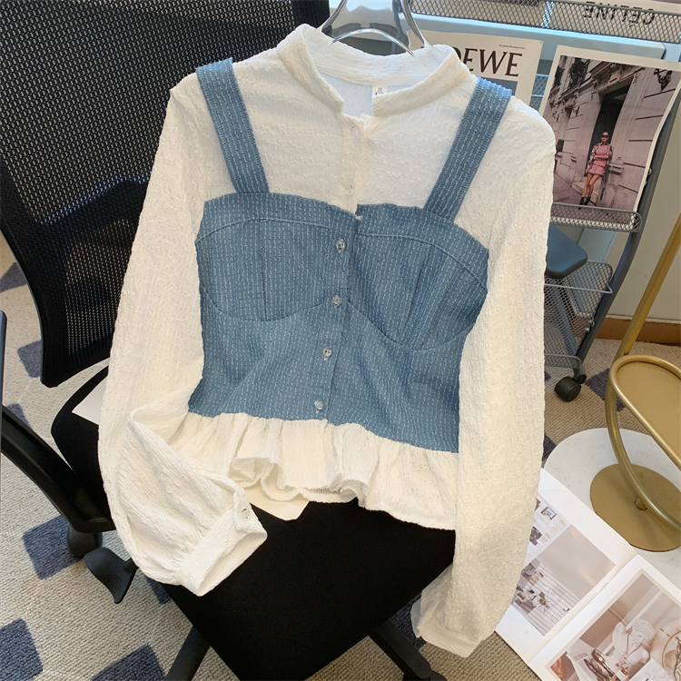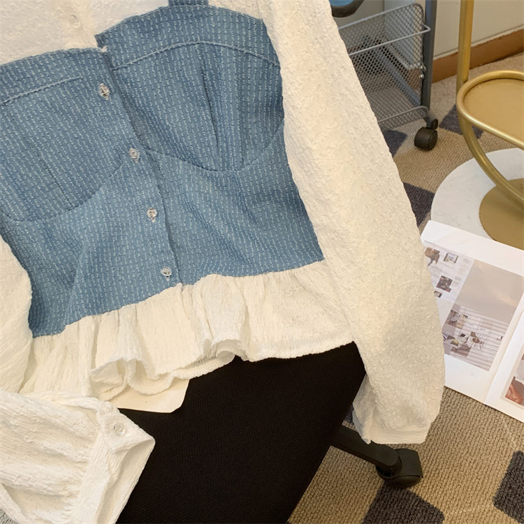 MY13995# 法式假两件衬衫设计感泡泡袖上衣牛仔拼接女裝貨源服裝批發