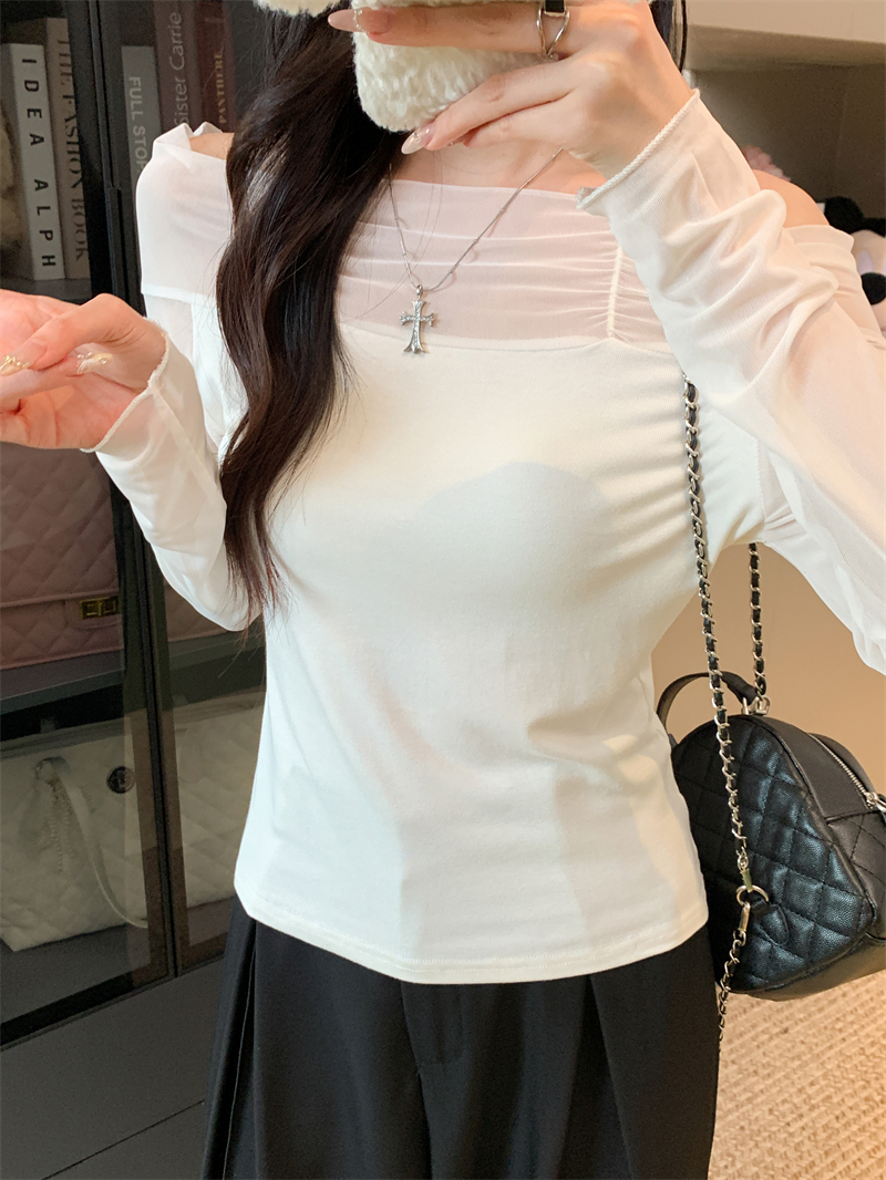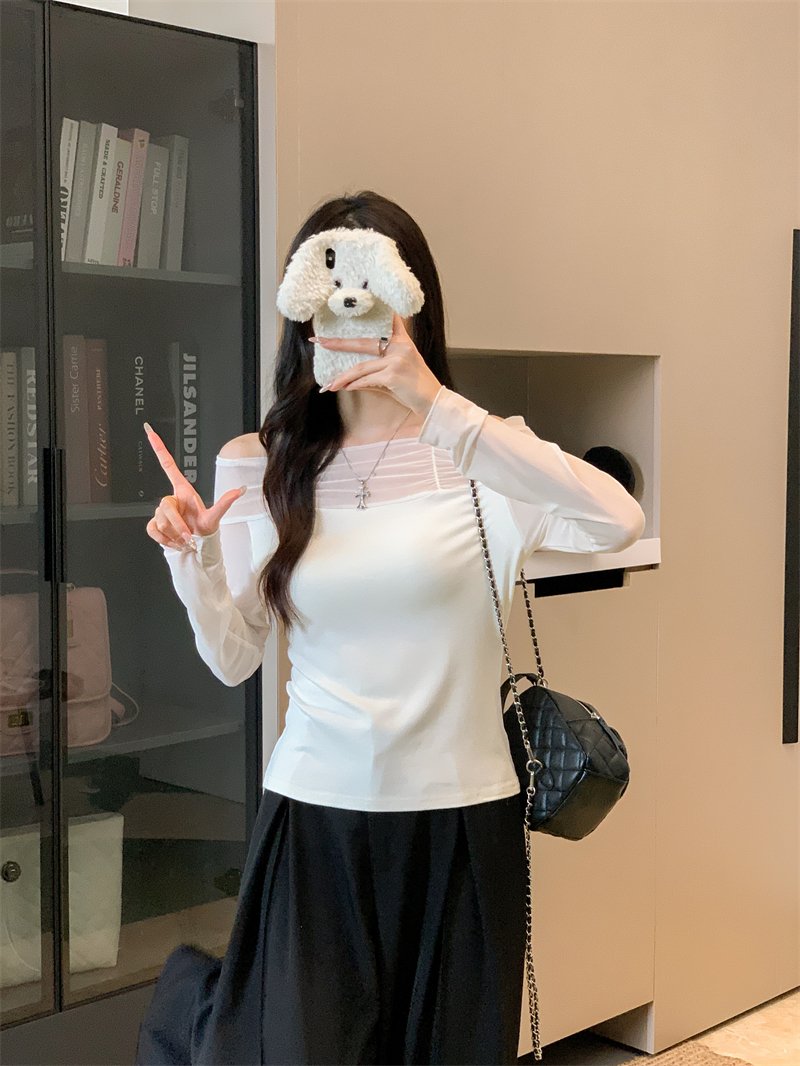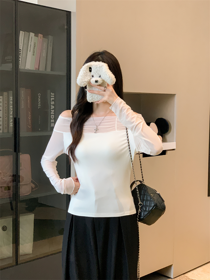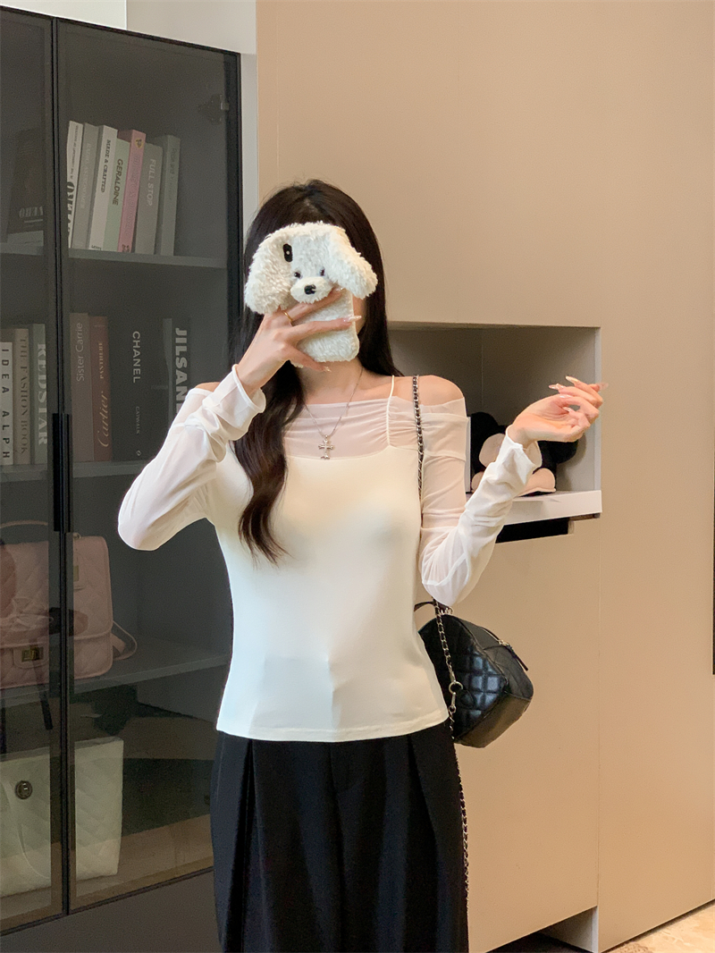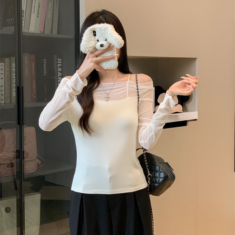 MY13999# 网纱拼接露肩辣妹风纯欲长袖上衣设计感小众t恤女裝貨源服裝批發