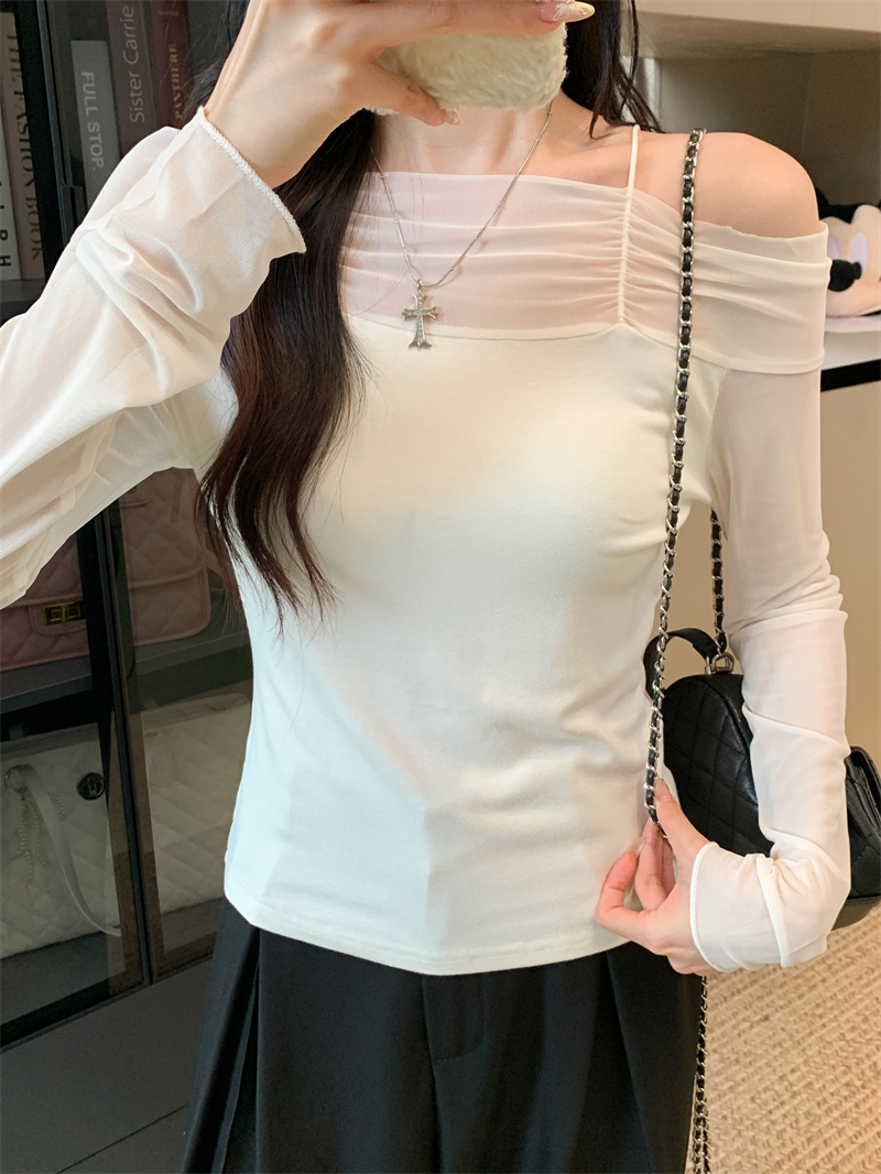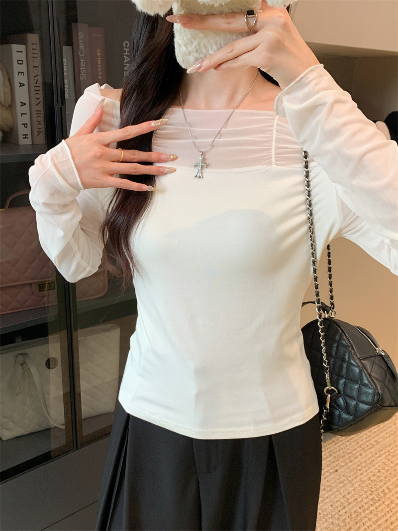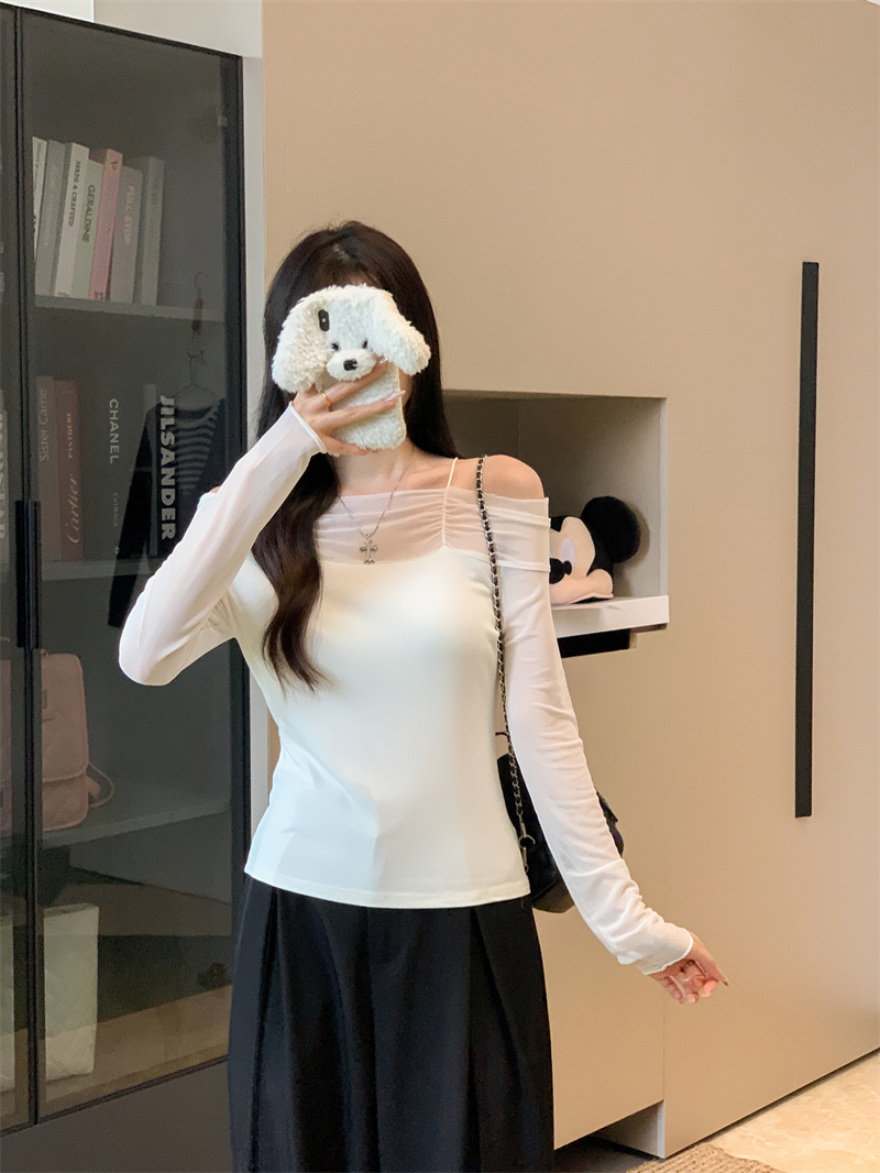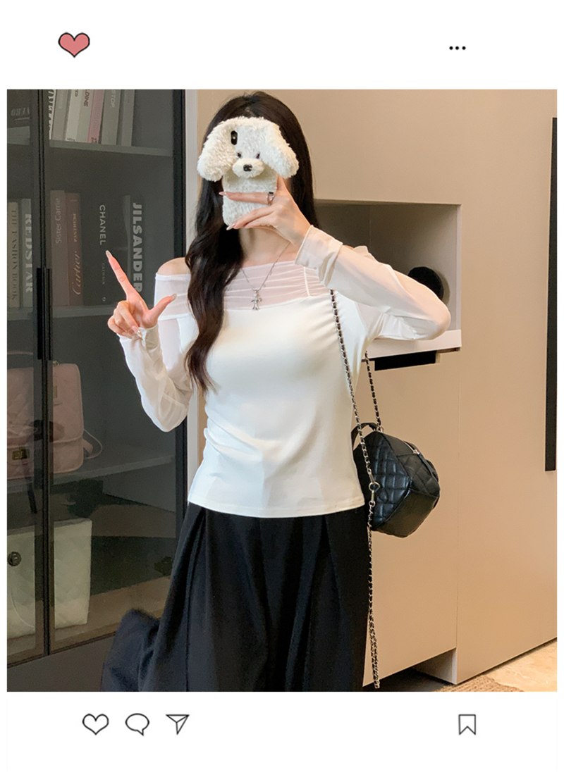 MY13999# 网纱拼接露肩辣妹风纯欲长袖上衣设计感小众t恤女裝貨源服裝批發