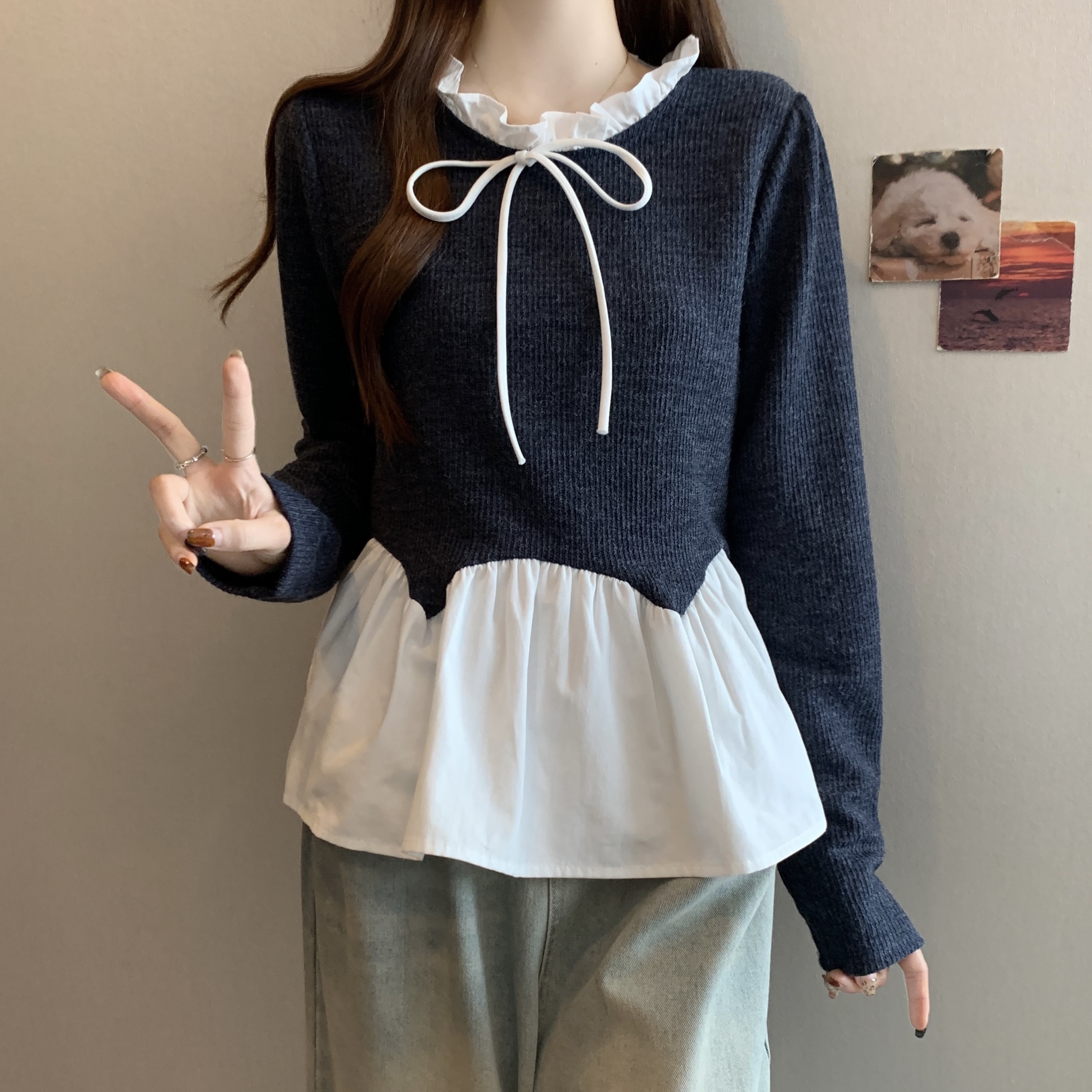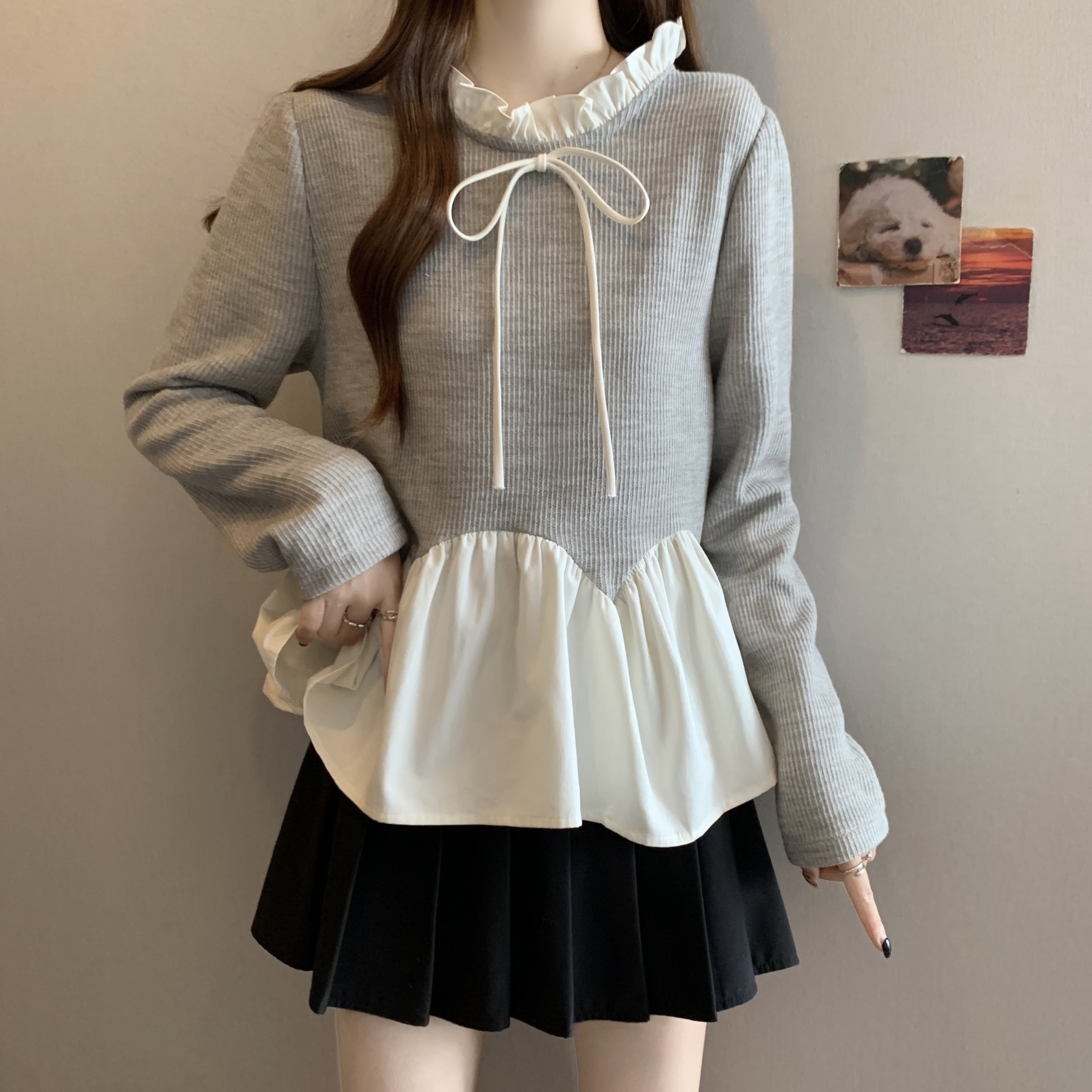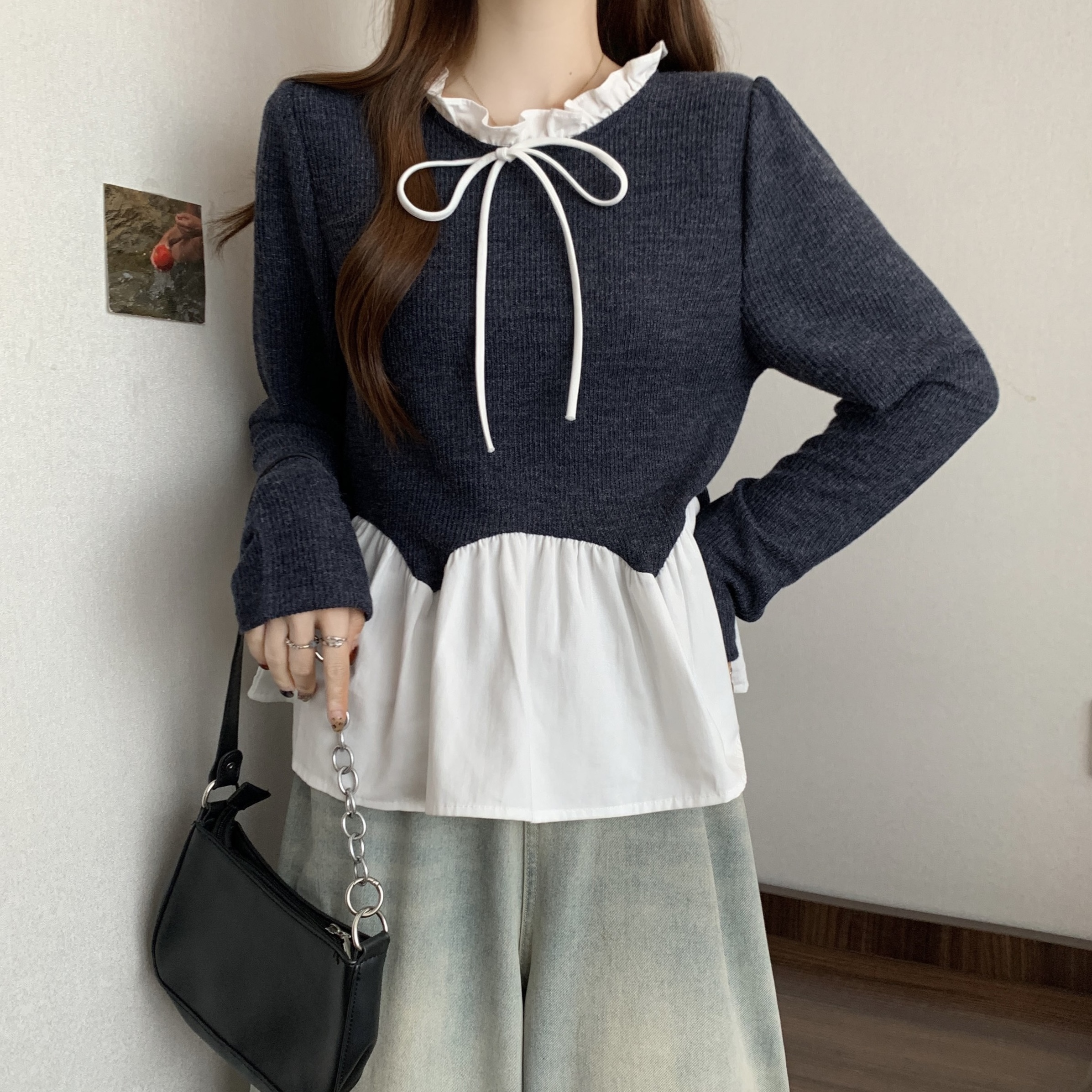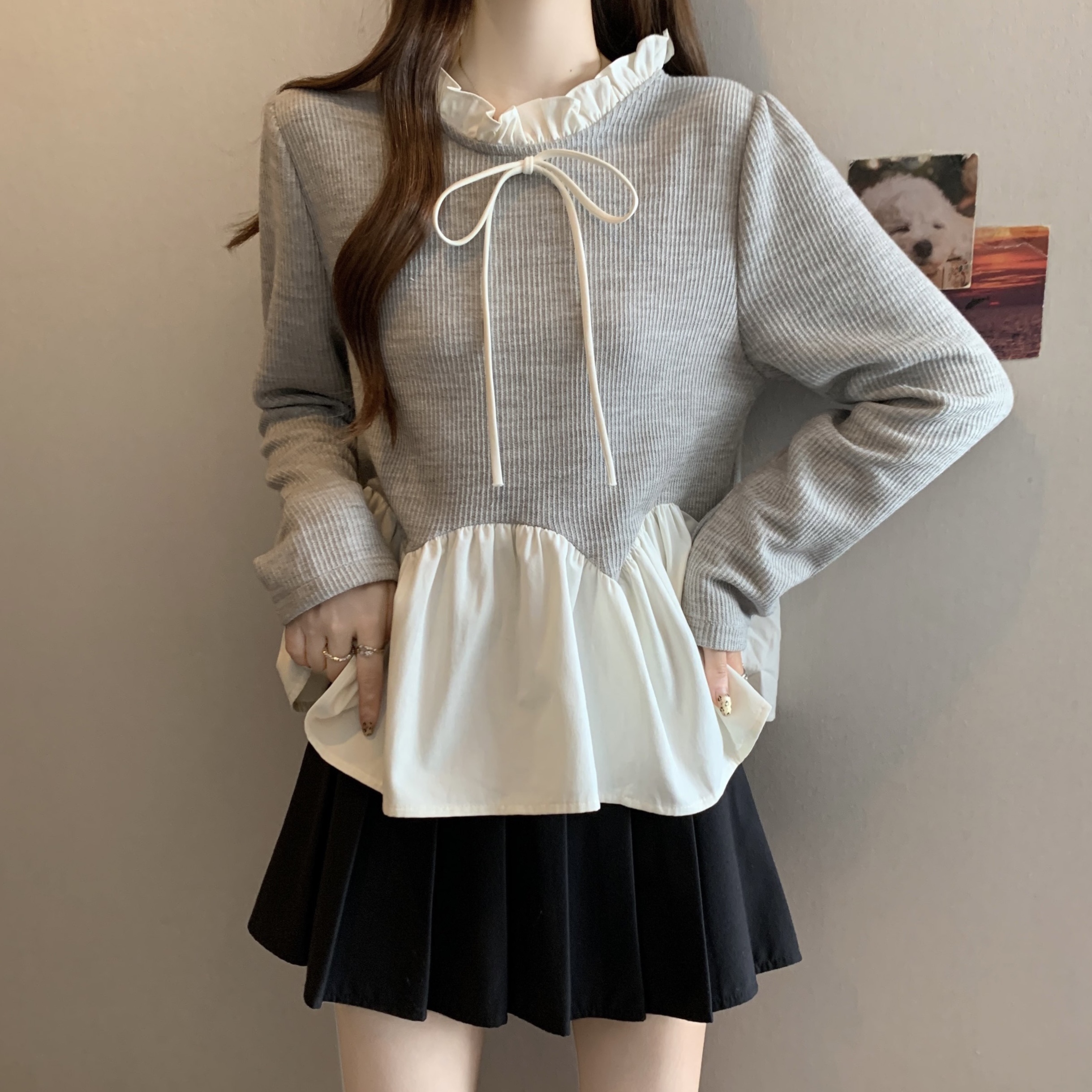 MY14016# 大码新款立领甜美蝴蝶结拼接长袖T恤打底衫女裝貨源服裝批發