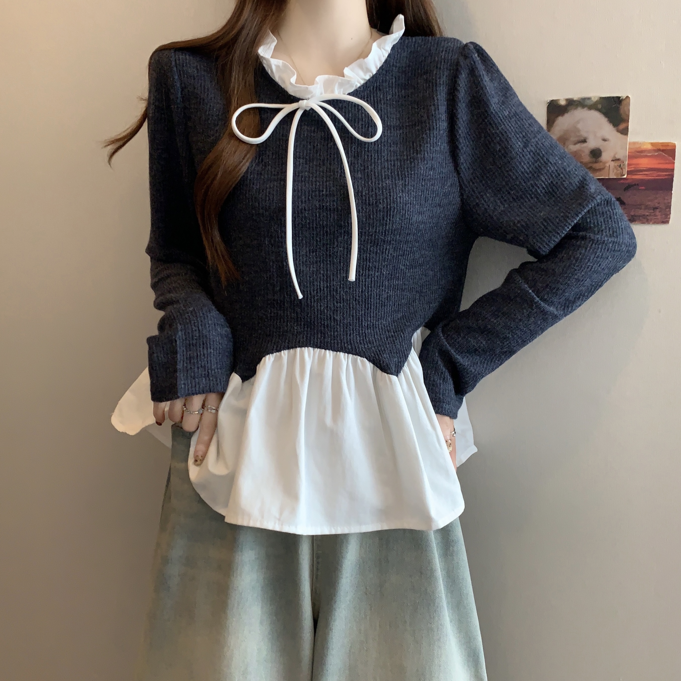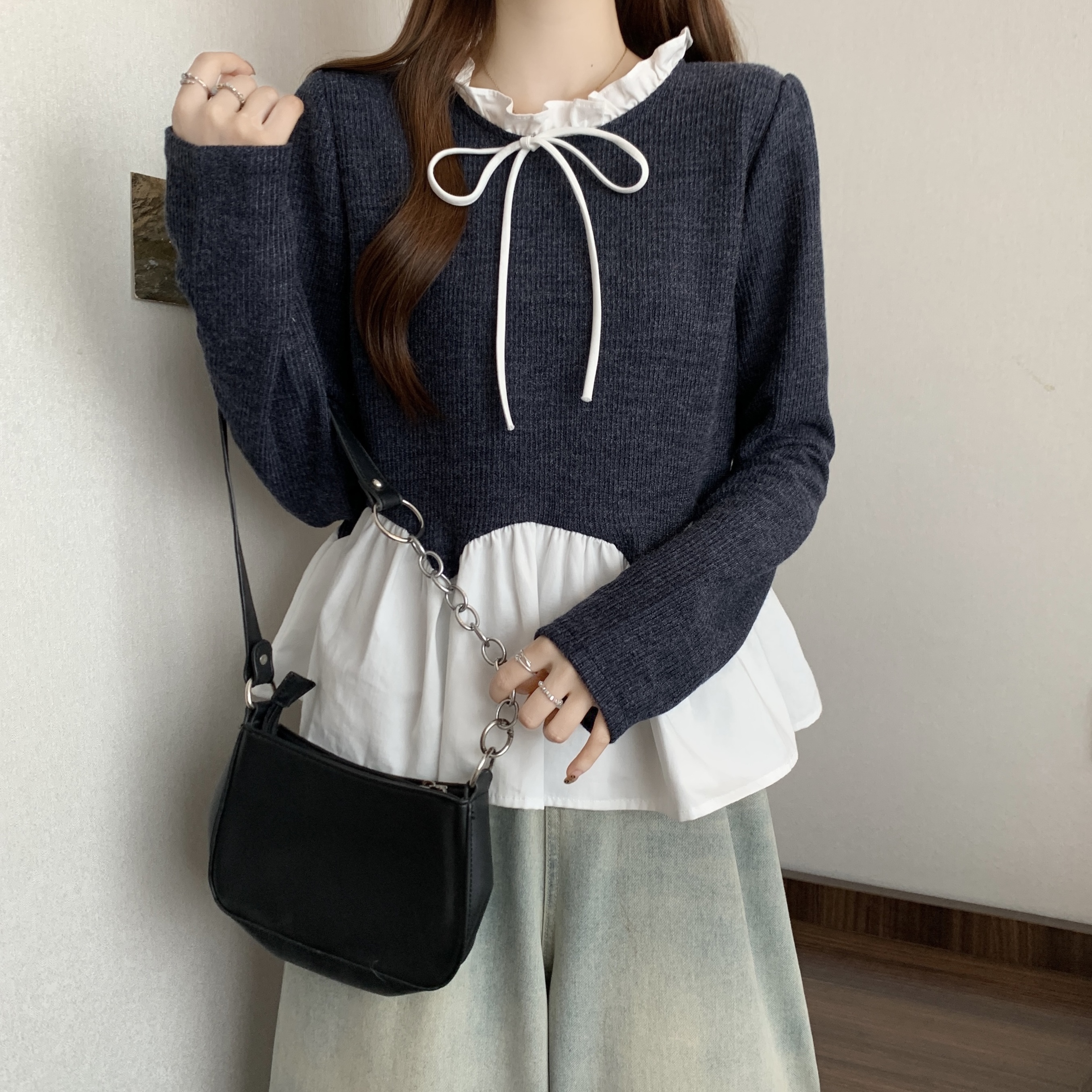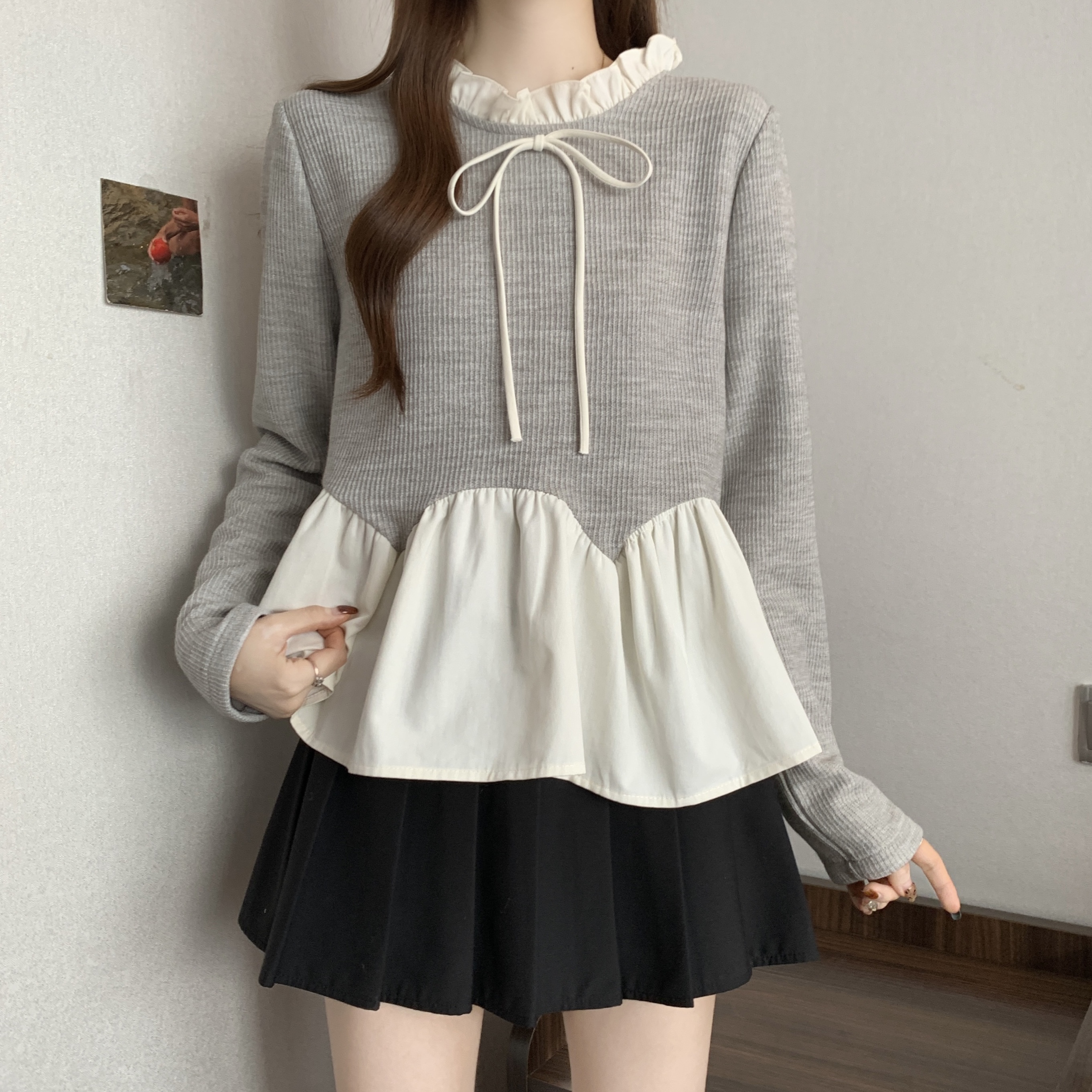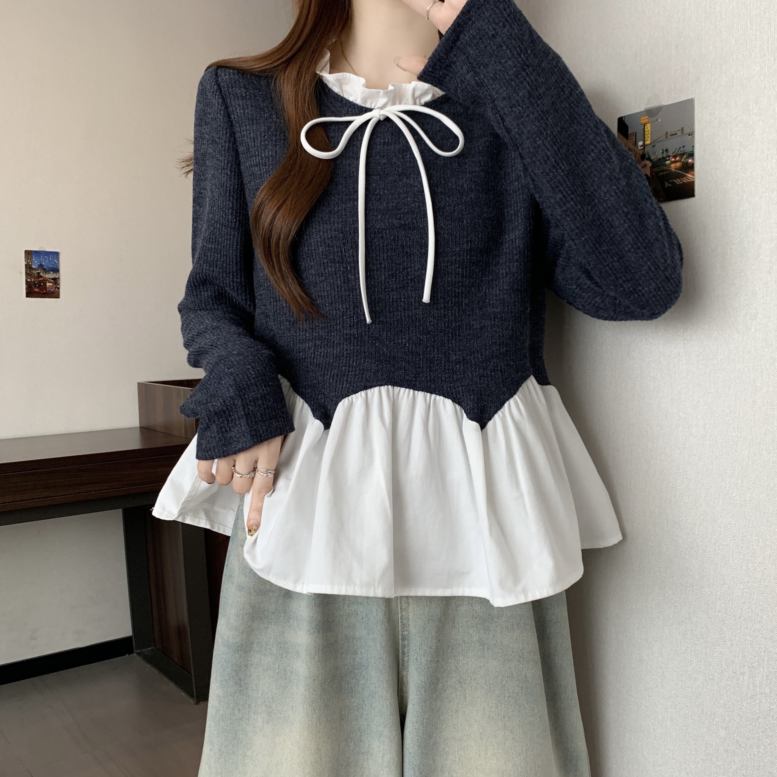 MY14016# 大码新款立领甜美蝴蝶结拼接长袖T恤打底衫女裝貨源服裝批發