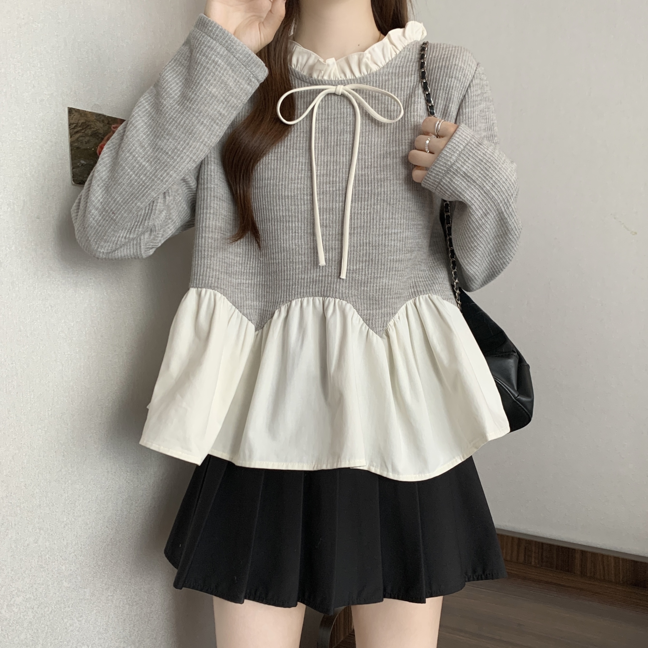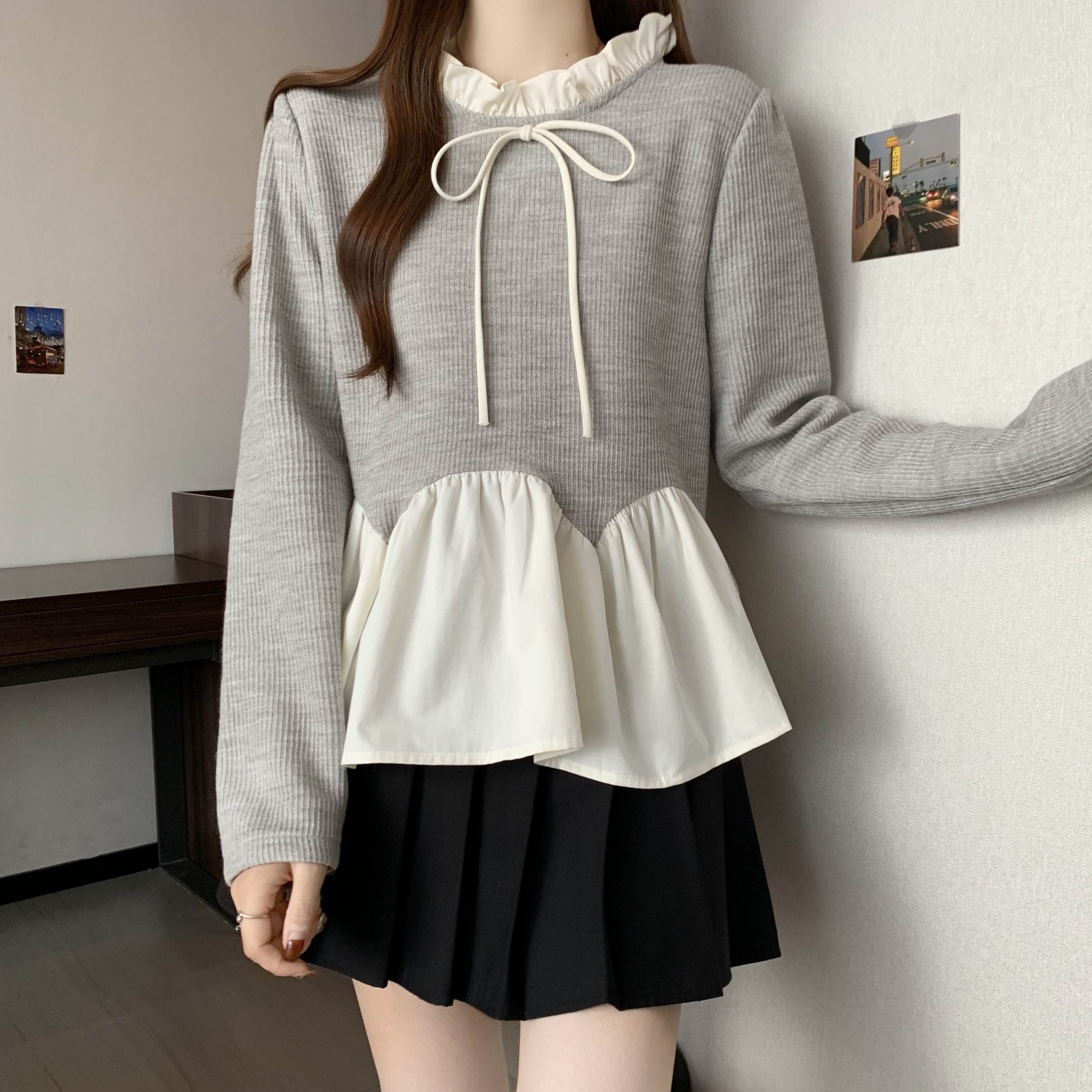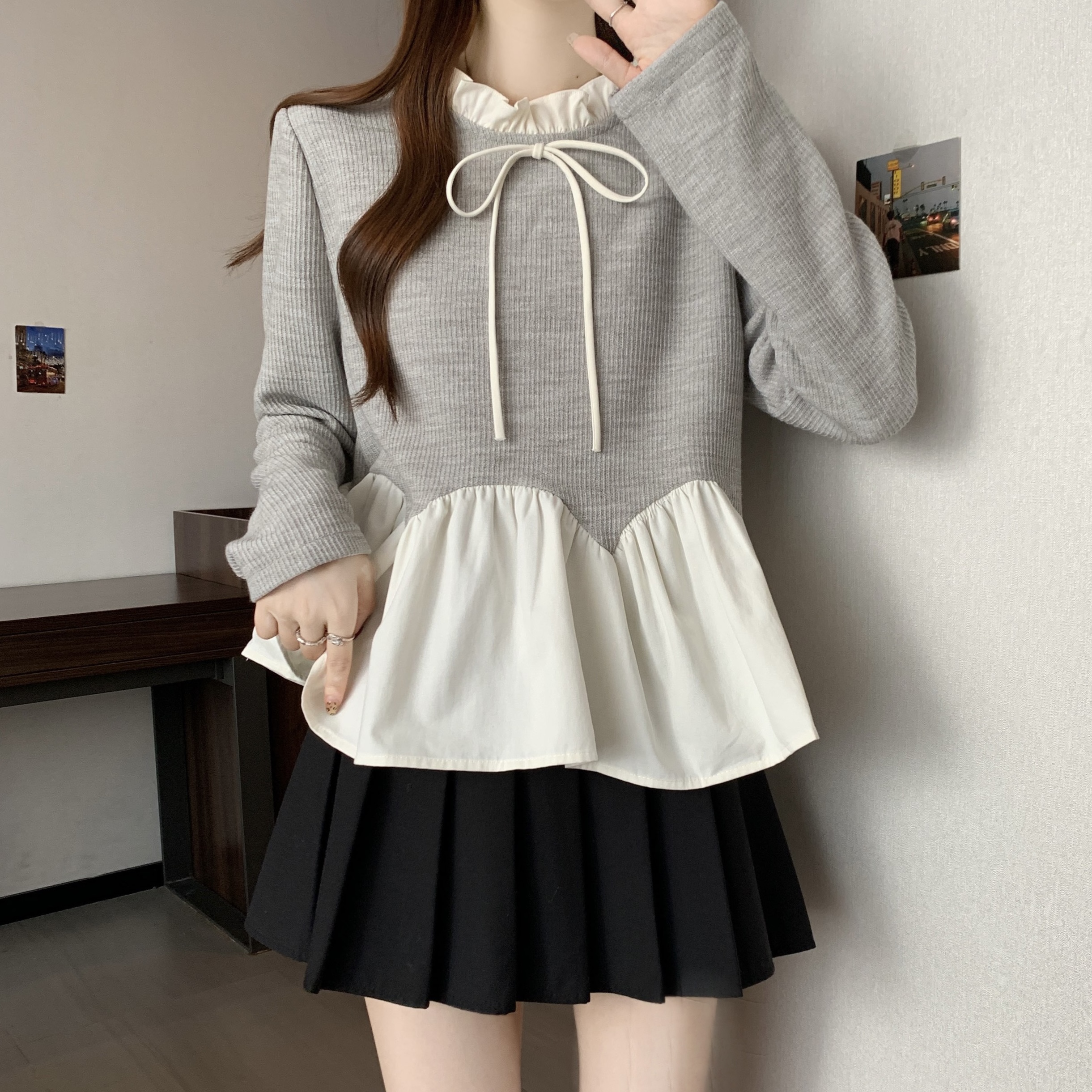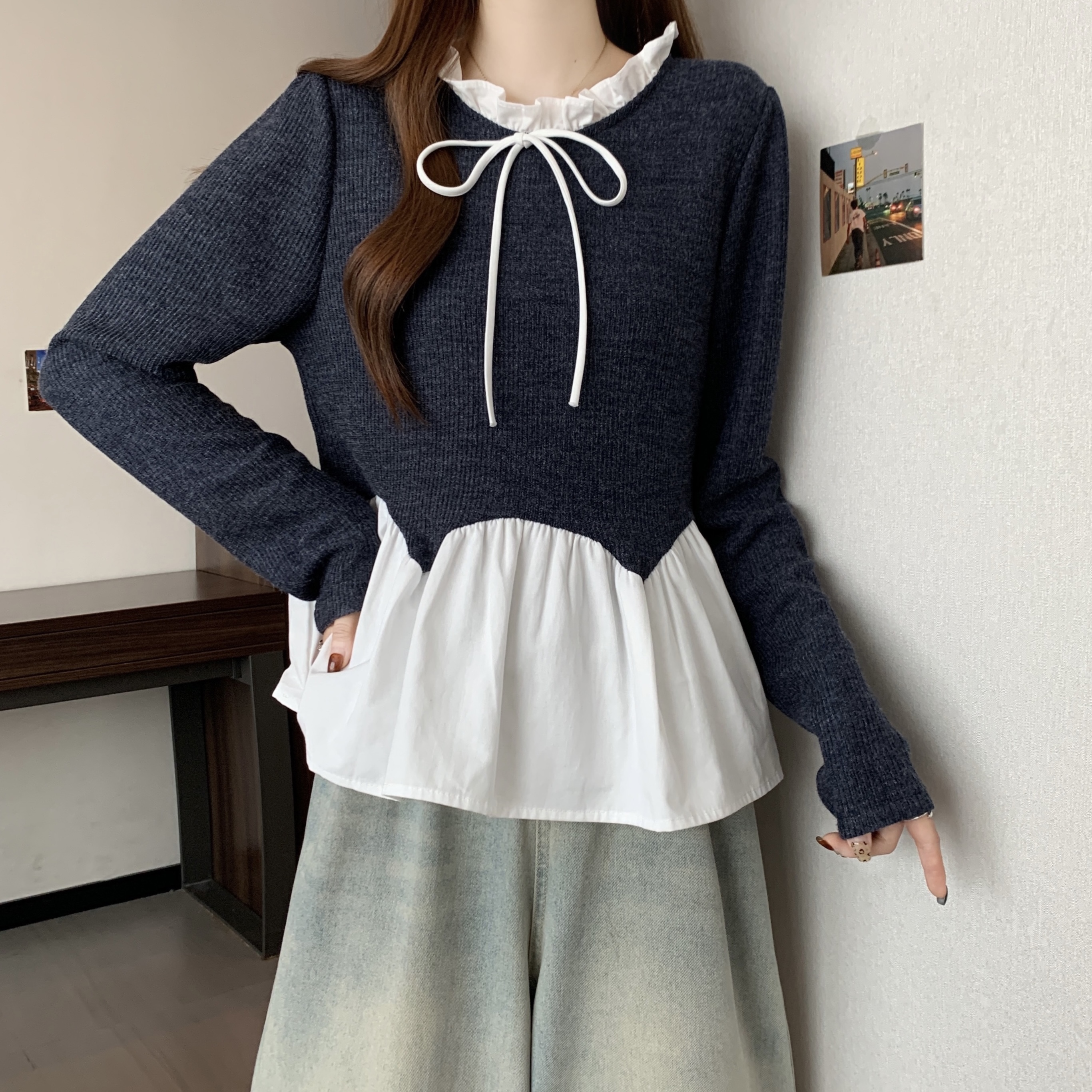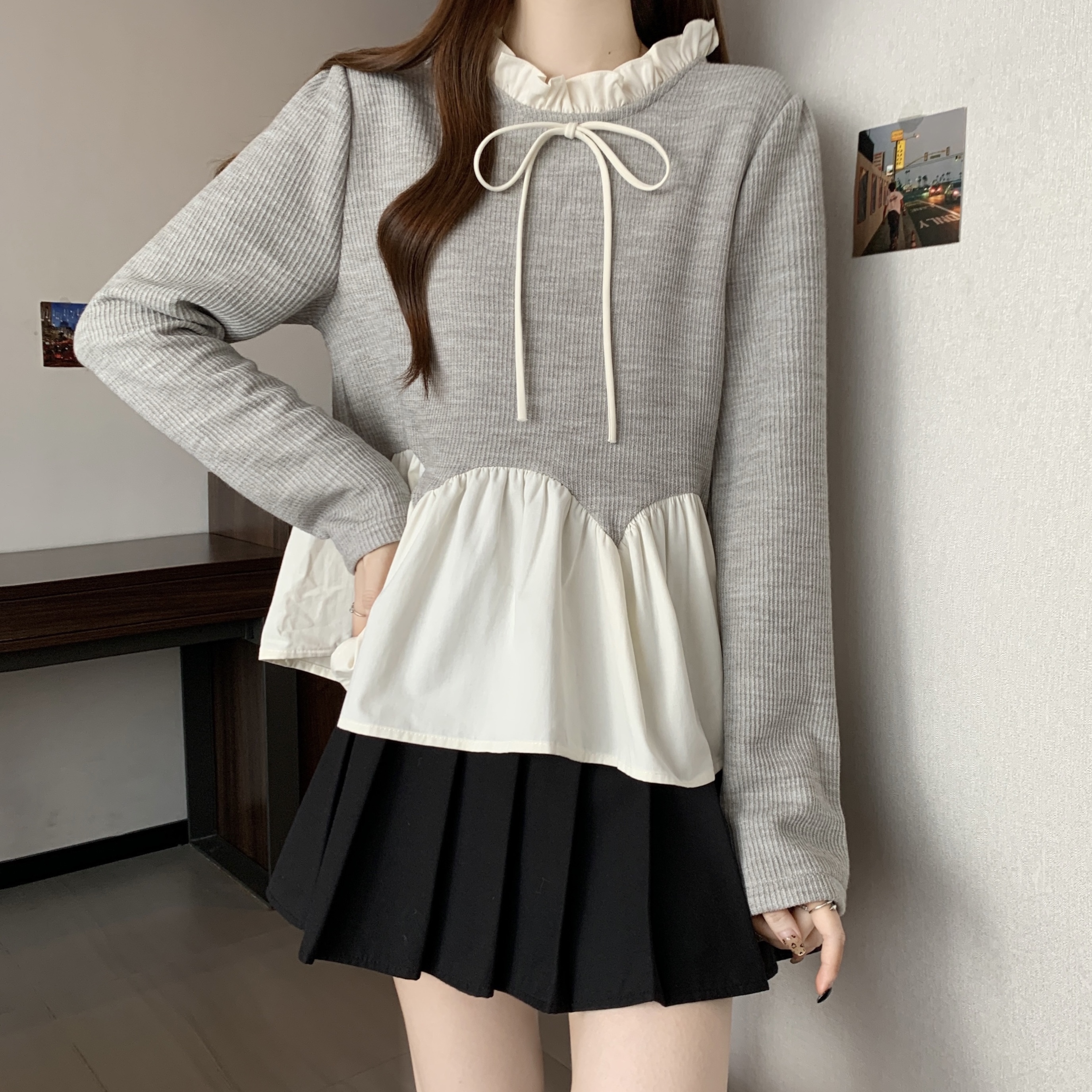 MY14016# 大码新款立领甜美蝴蝶结拼接长袖T恤打底衫女裝貨源服裝批發