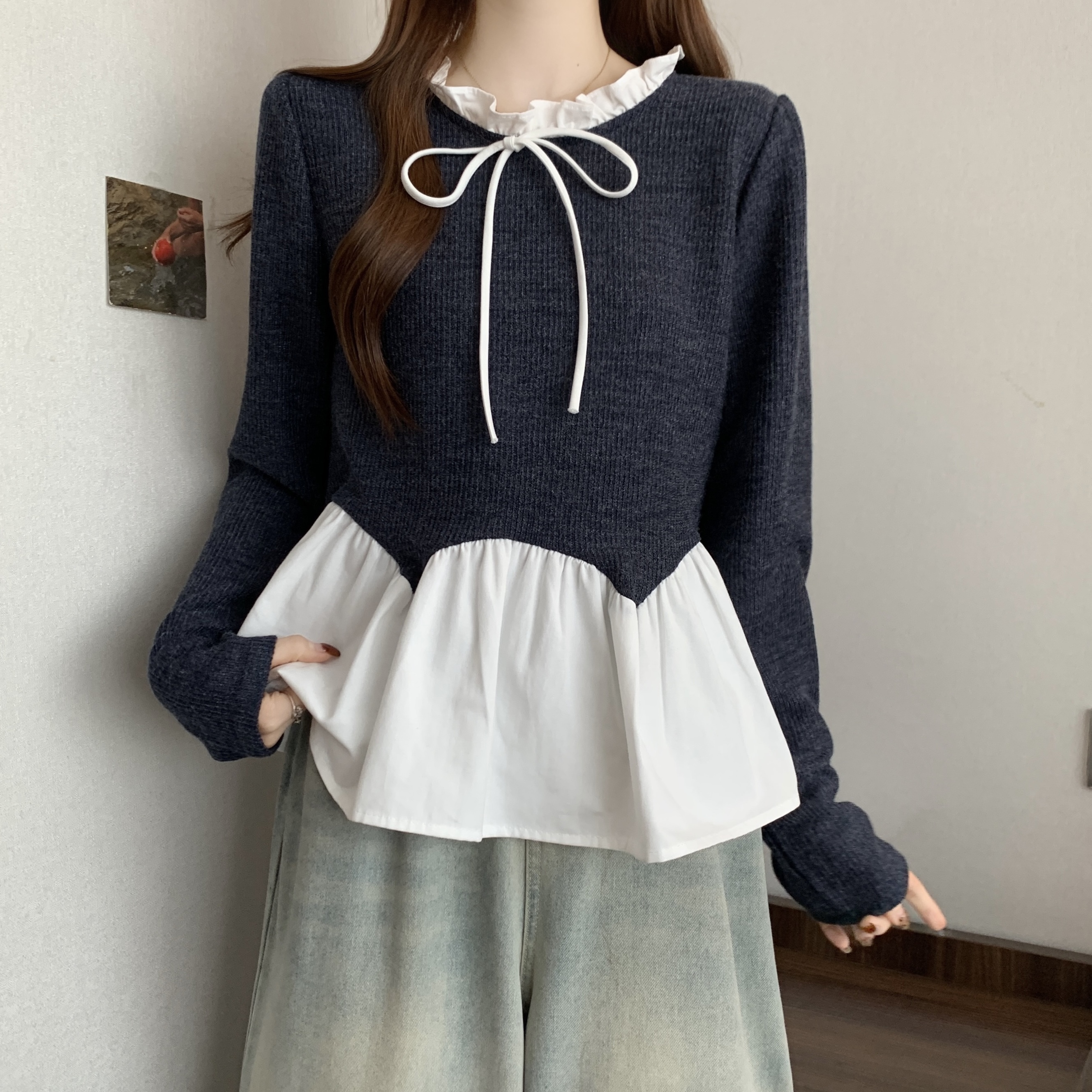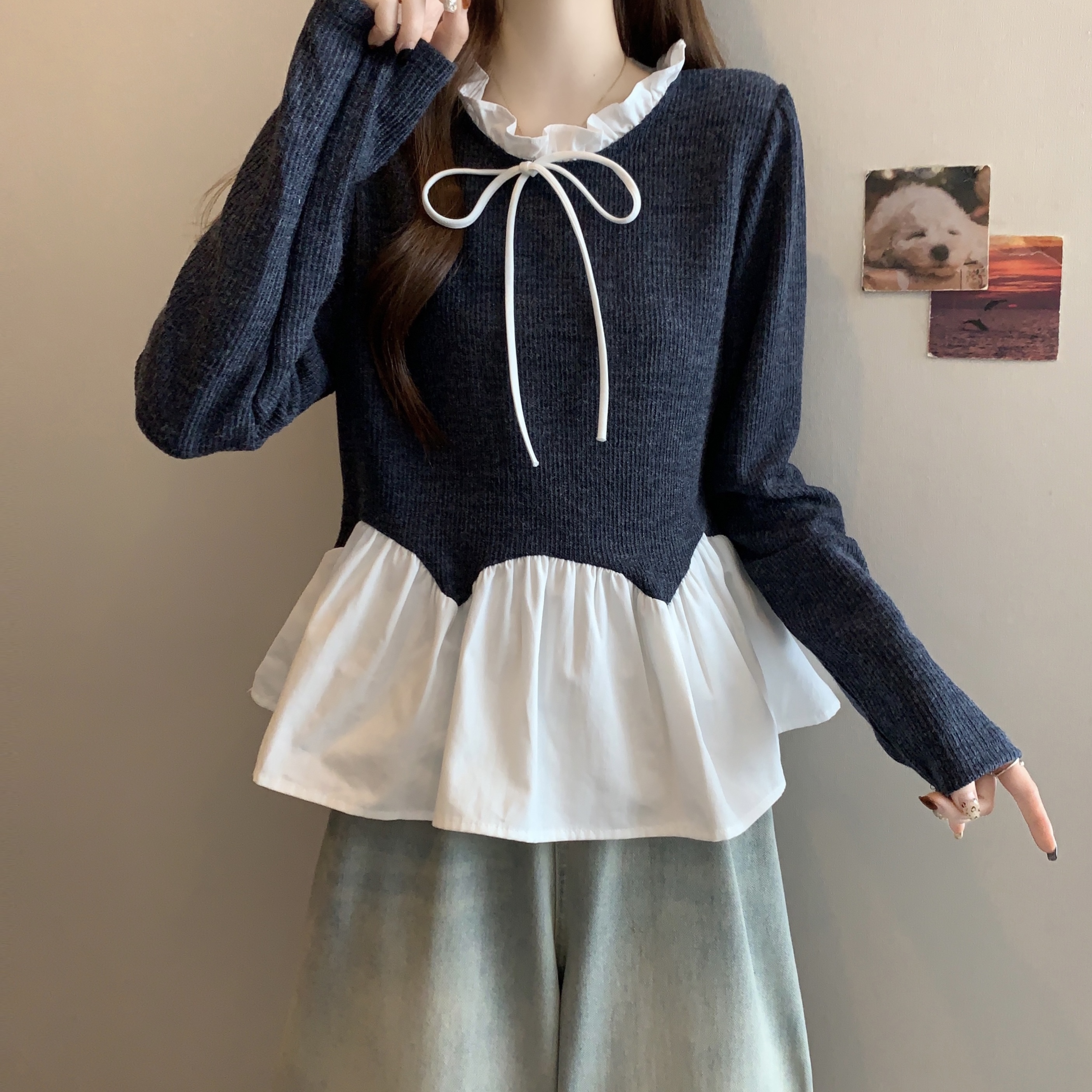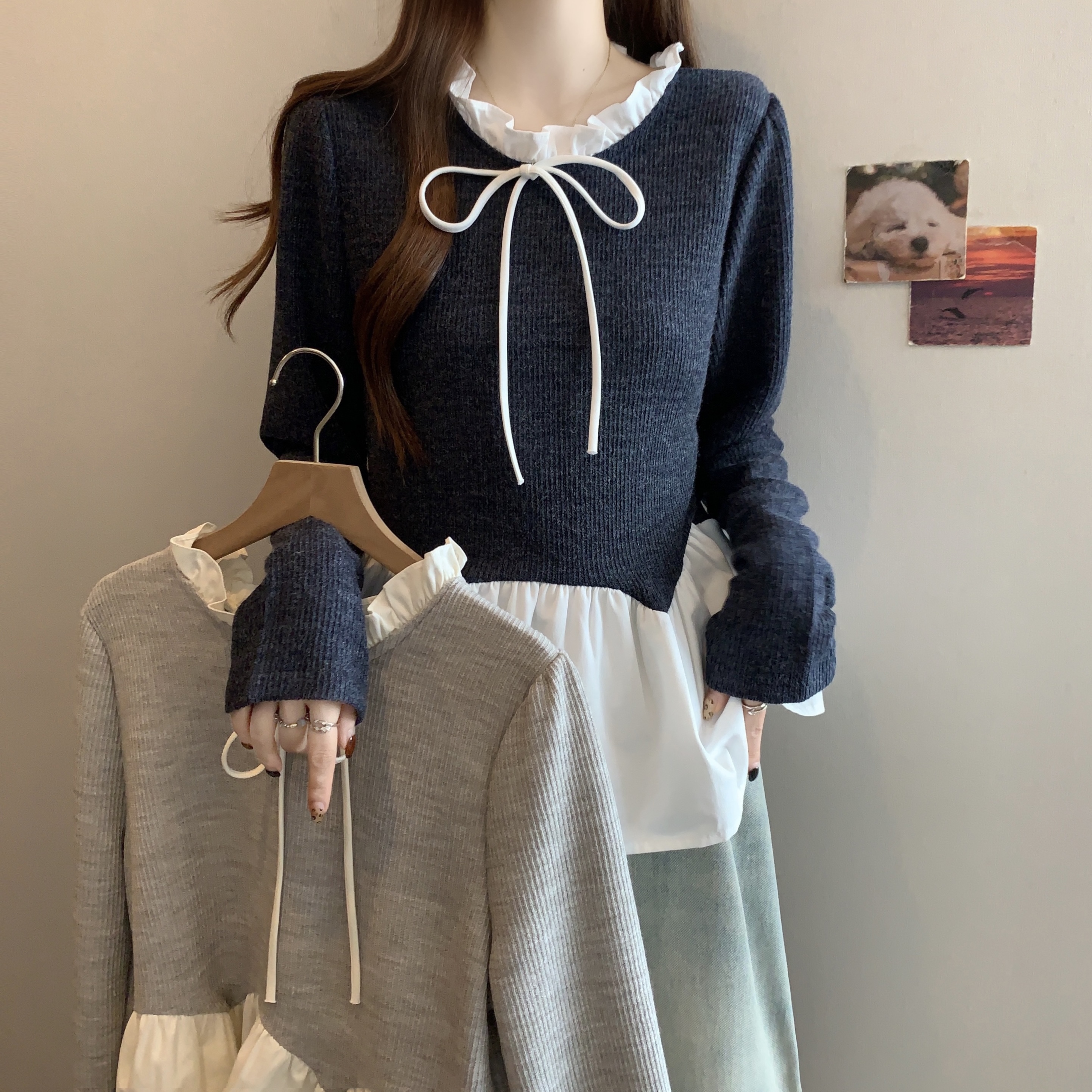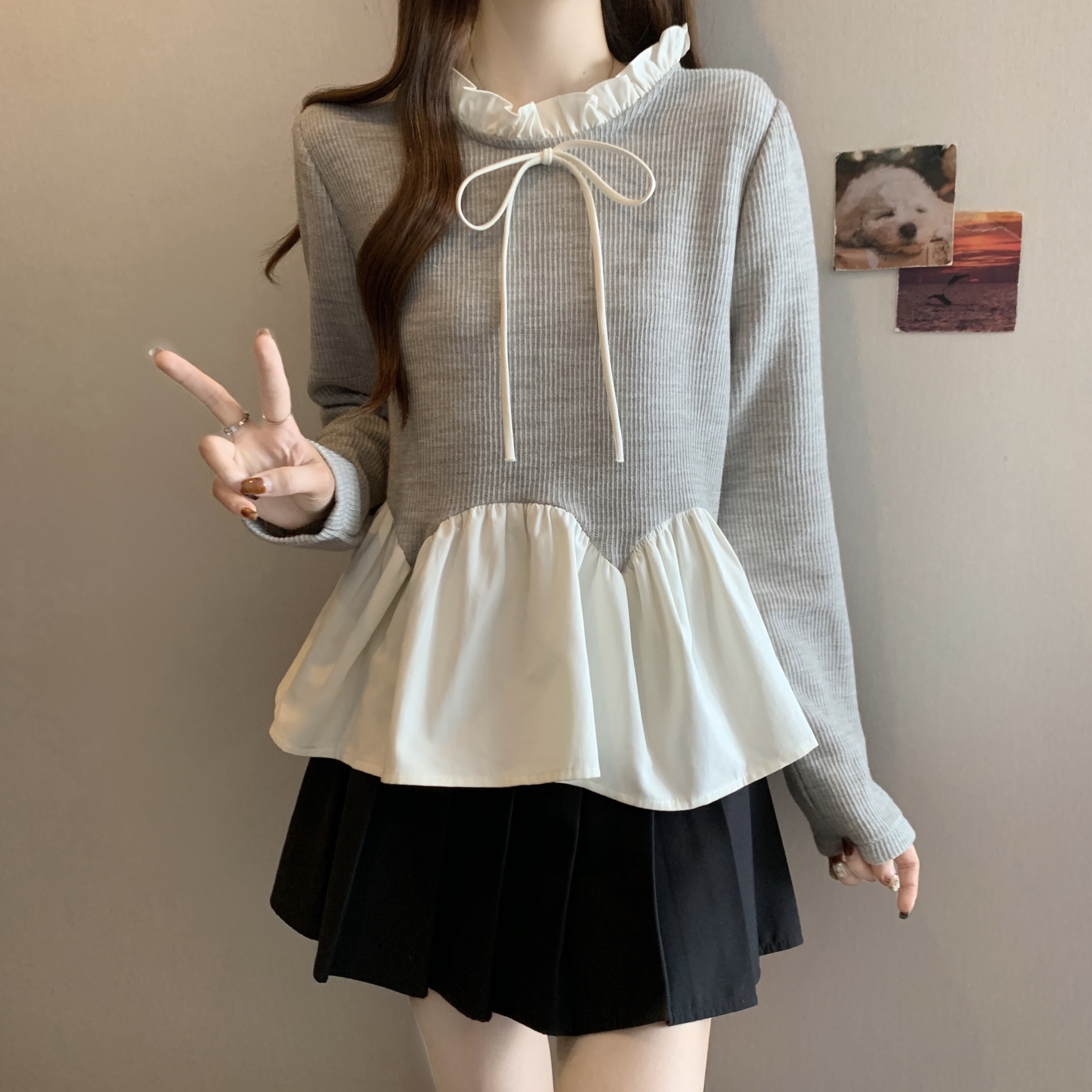 MY14016# 大码新款立领甜美蝴蝶结拼接长袖T恤打底衫女裝貨源服裝批發
