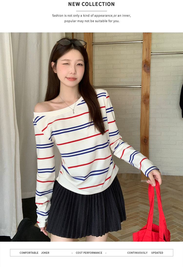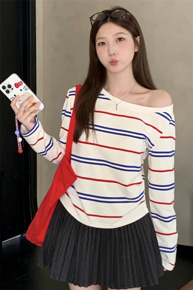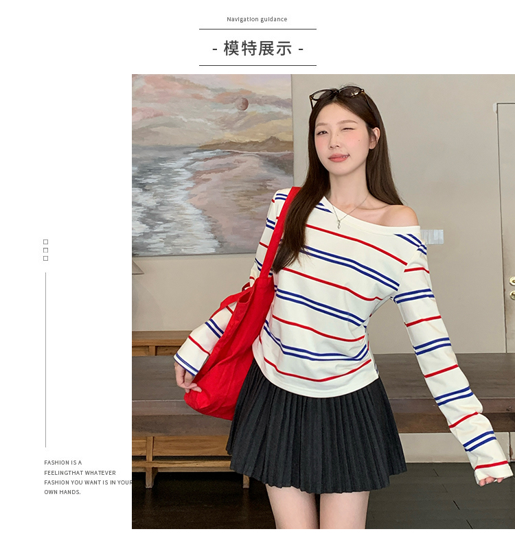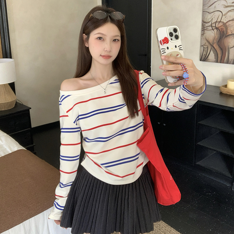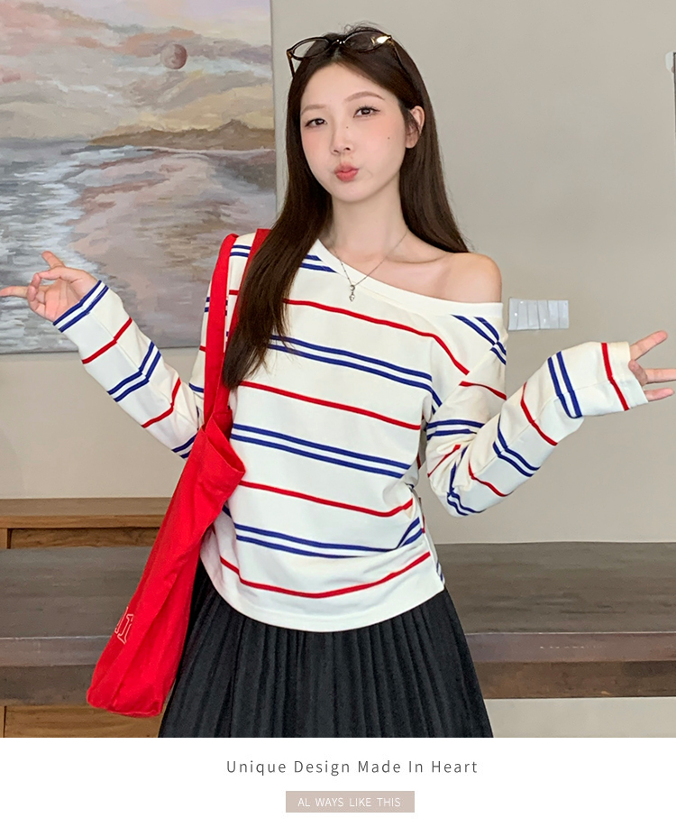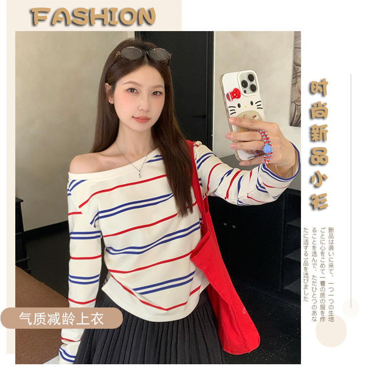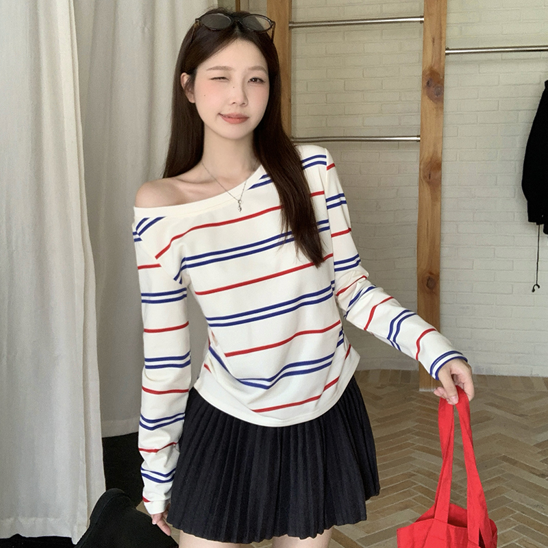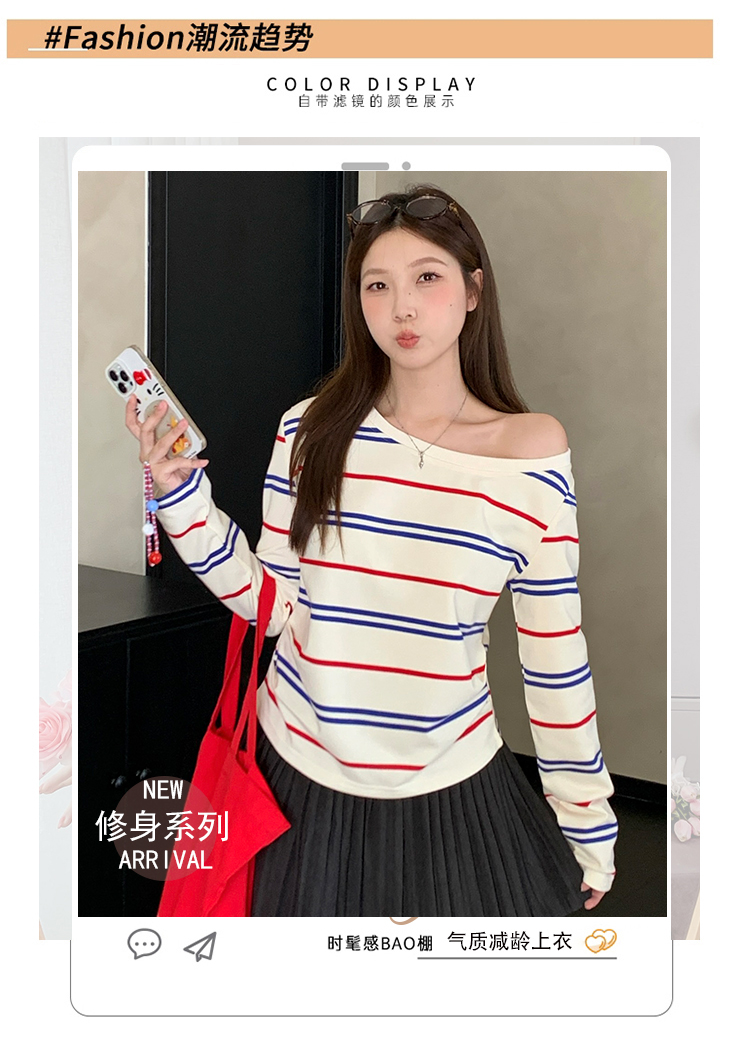 MY14019# 大码设计感别致斜肩t恤卫衣韩系气质百搭条纹露肩上衣女裝貨源服裝批發