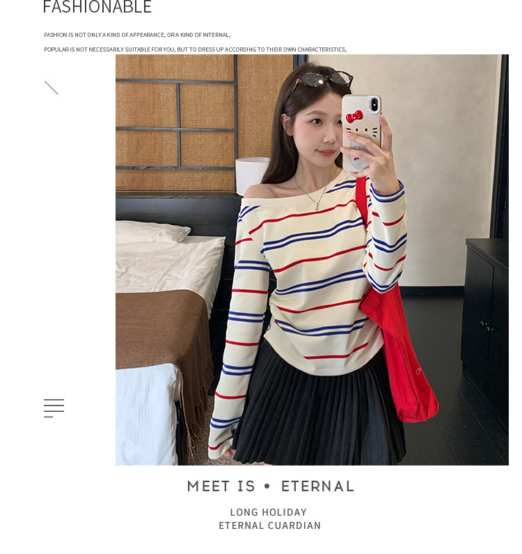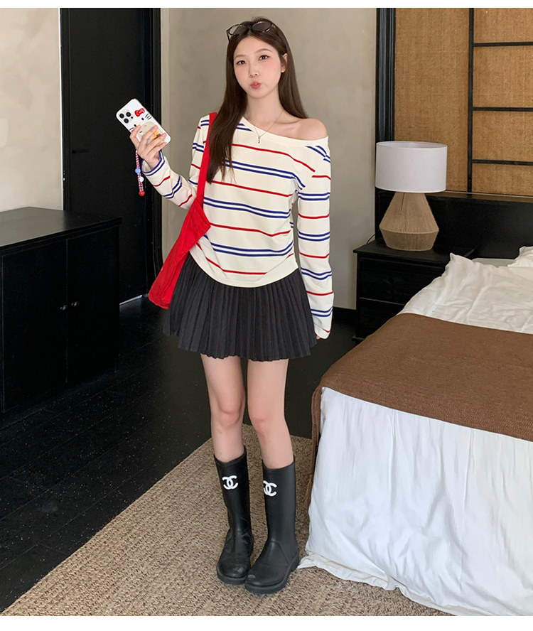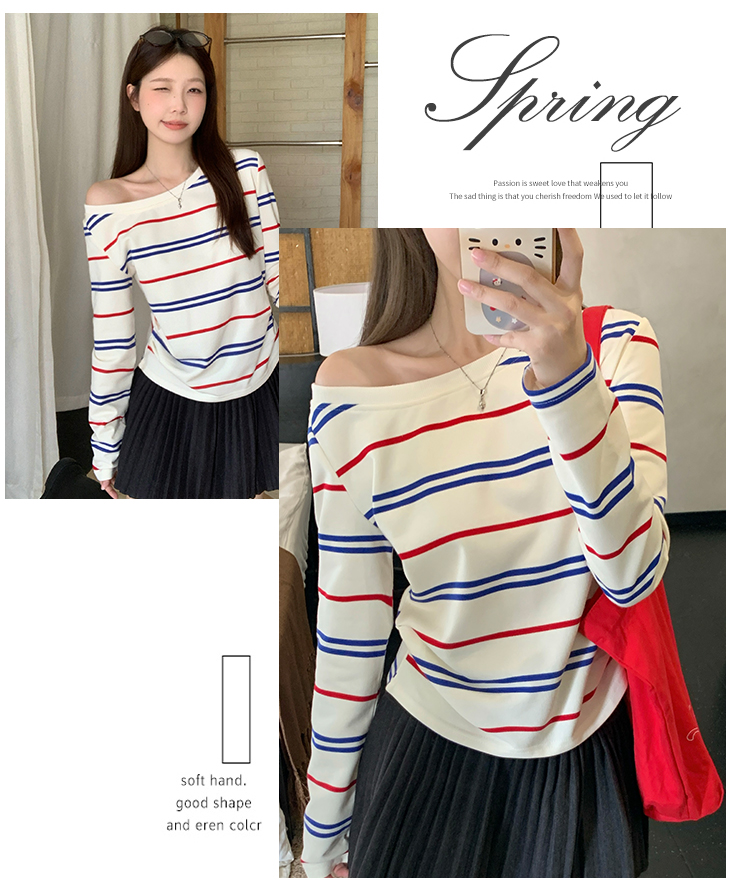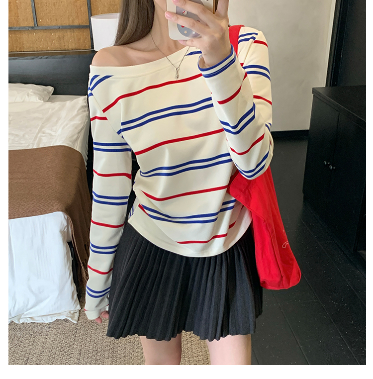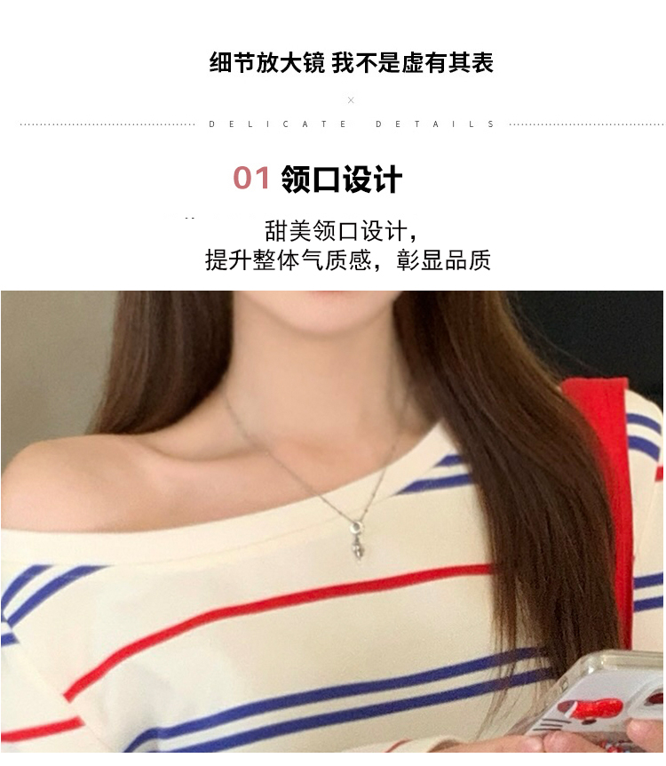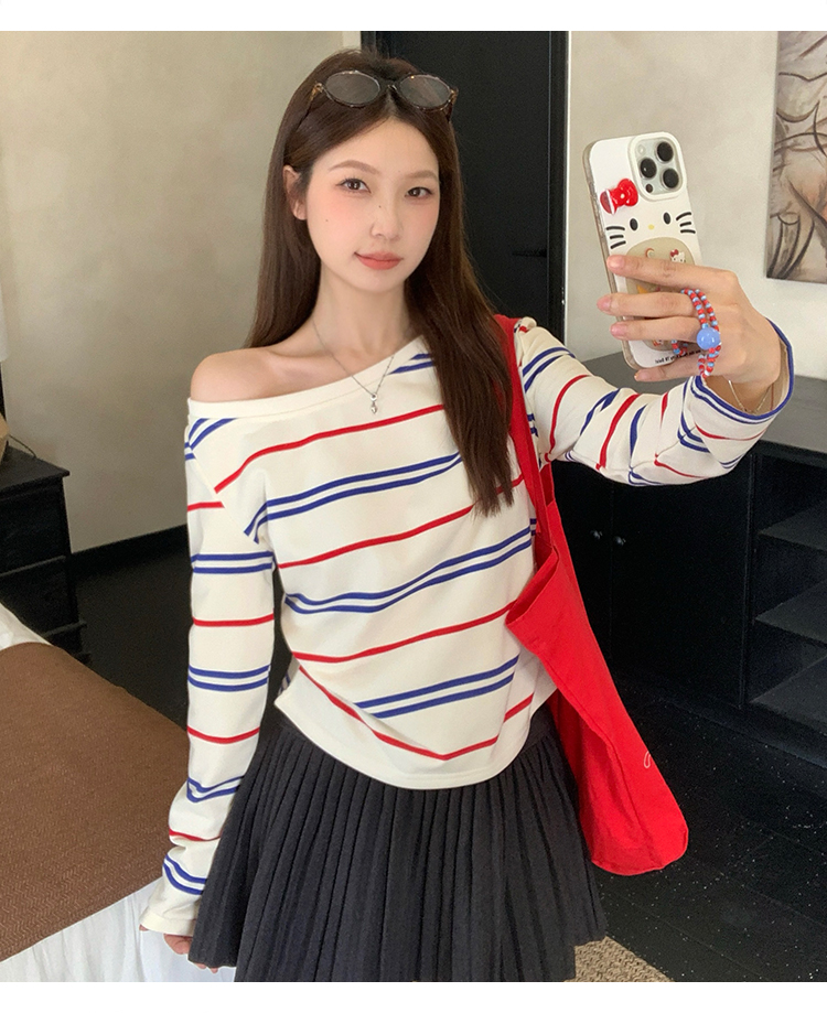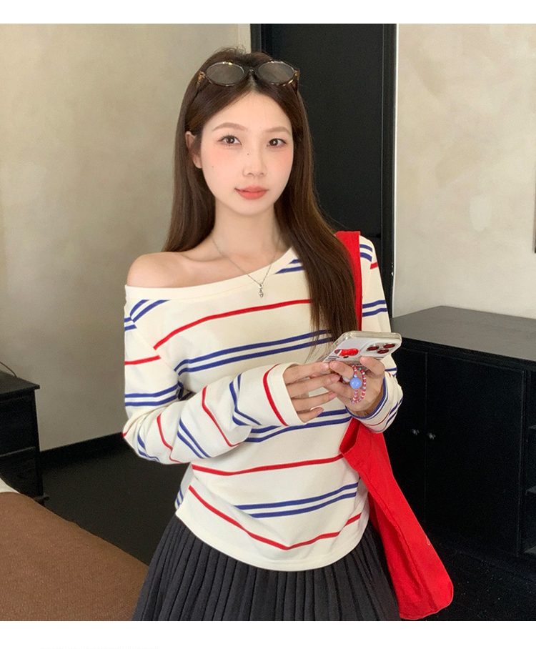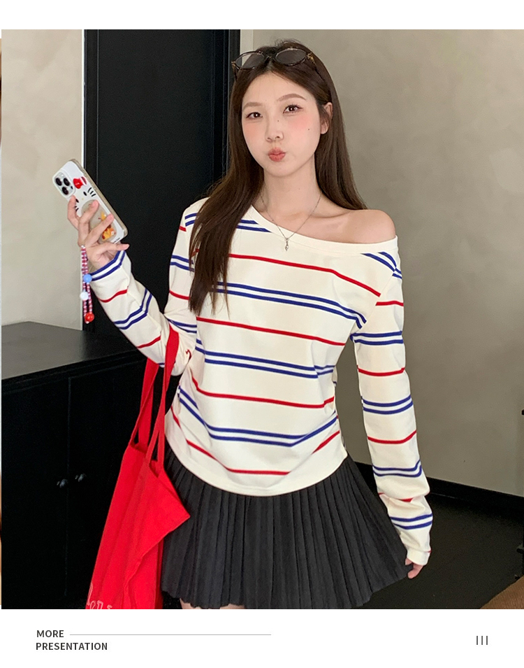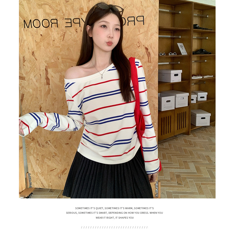MY14019# 大码设计感别致斜肩t恤卫衣韩系气质百搭条纹露肩上衣女裝貨源服裝批發