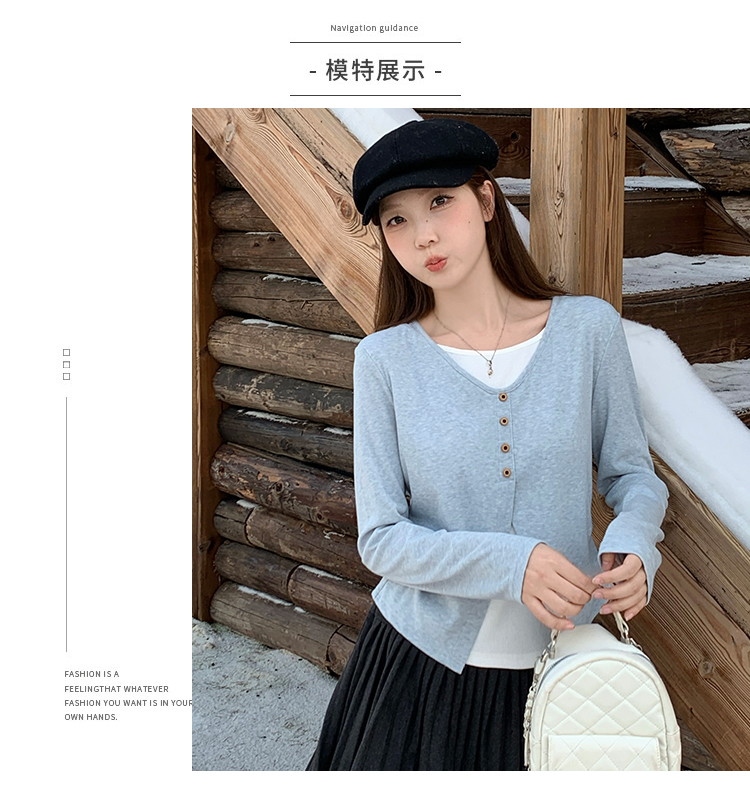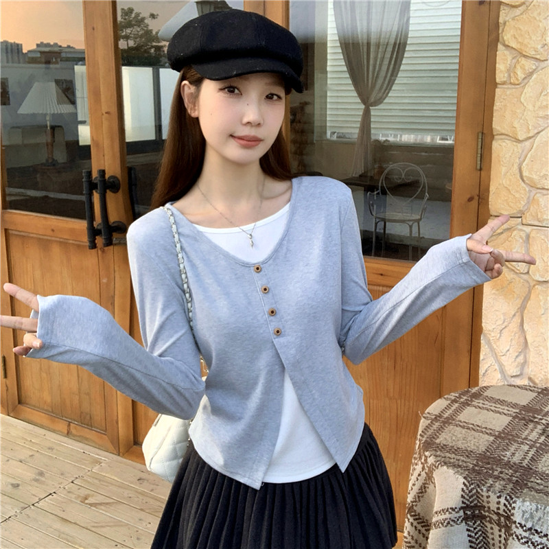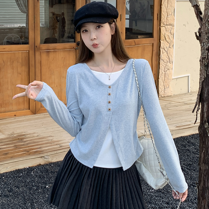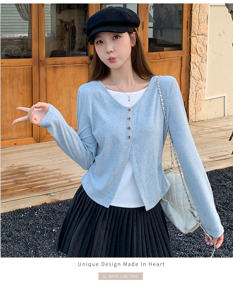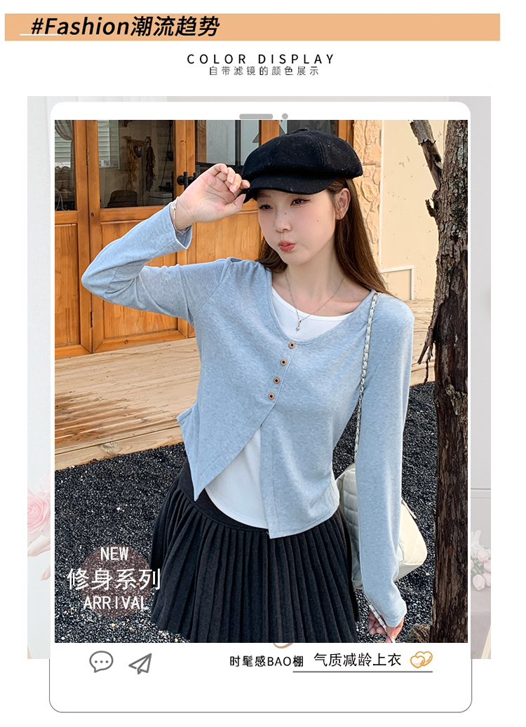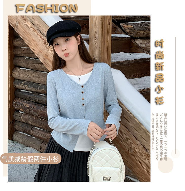 MY14020# 大码气质温柔假两件撞色拼接T恤绝美内搭打底衫别致上衣女裝貨源服裝批發