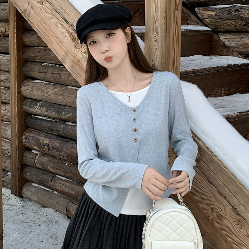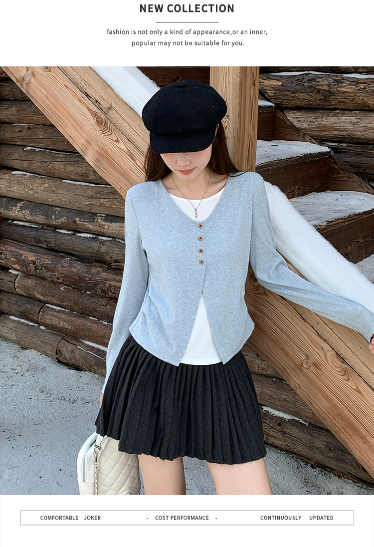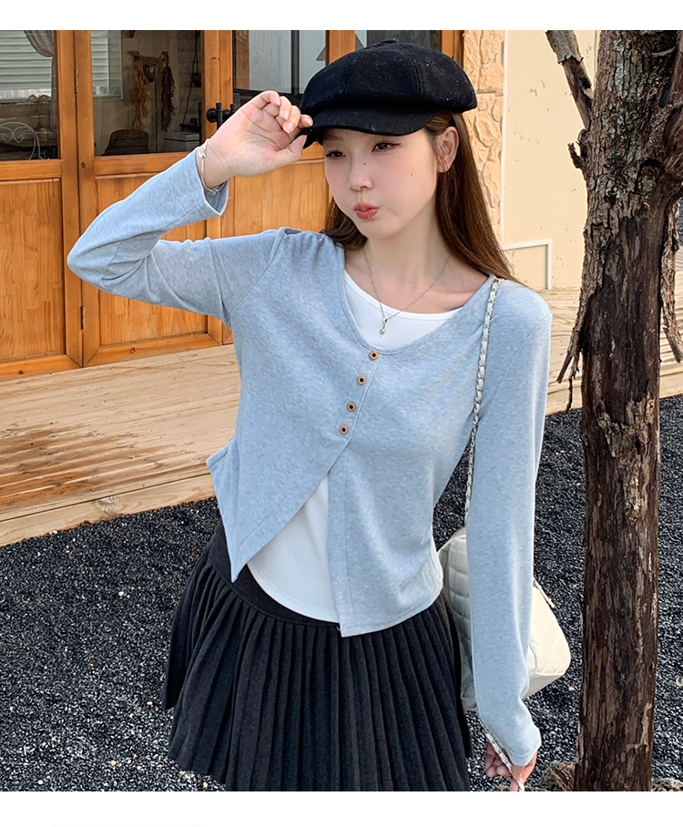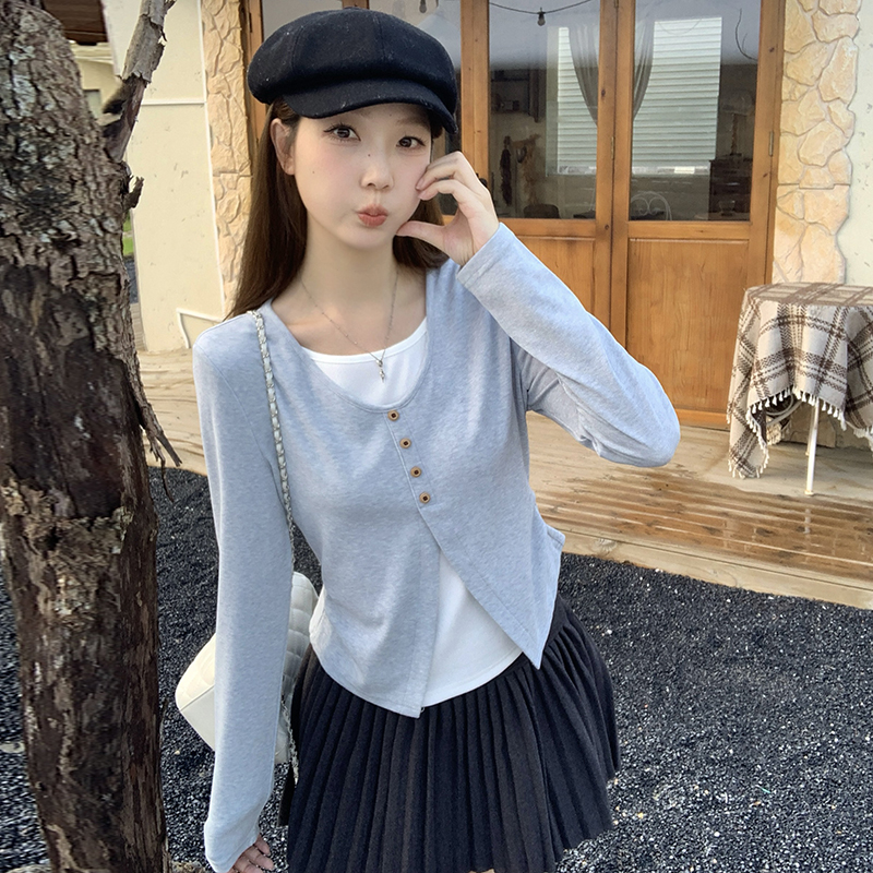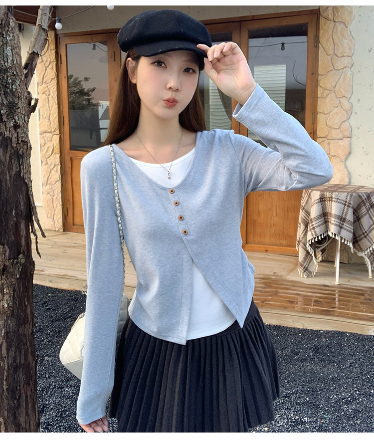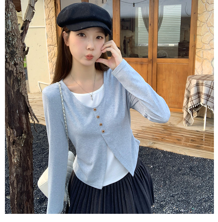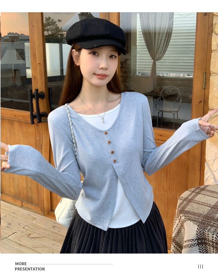 MY14020# 大码气质温柔假两件撞色拼接T恤绝美内搭打底衫别致上衣女裝貨源服裝批發