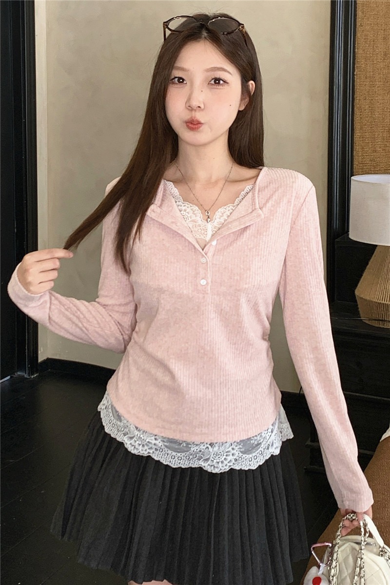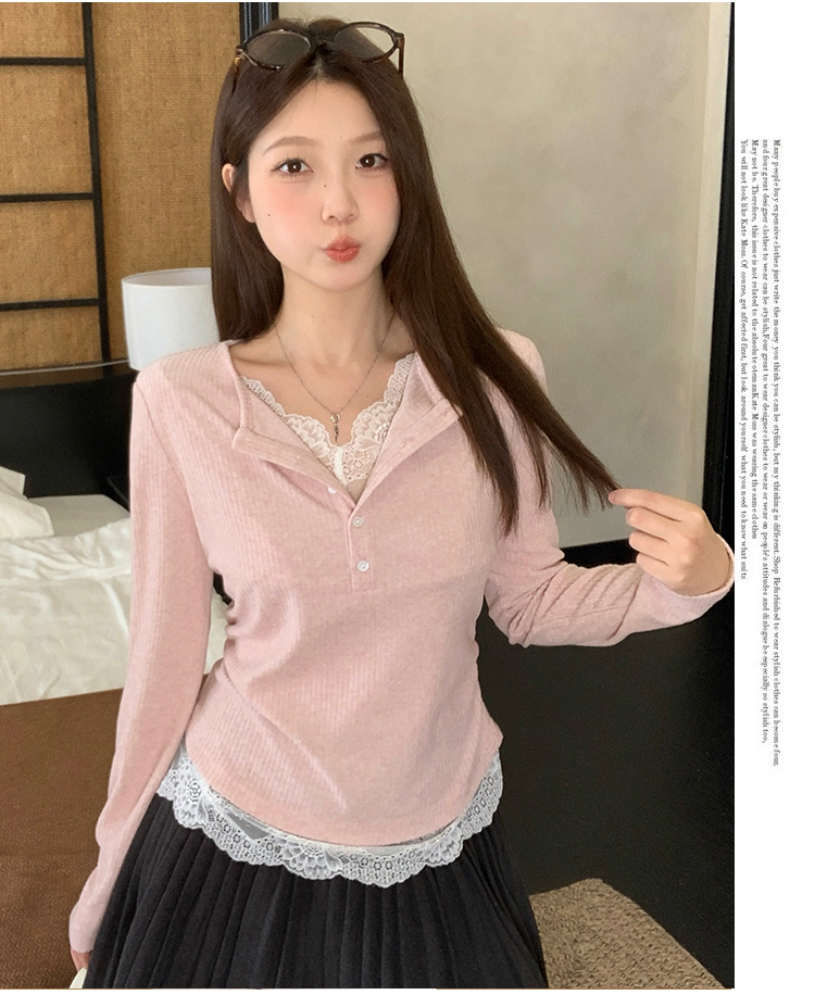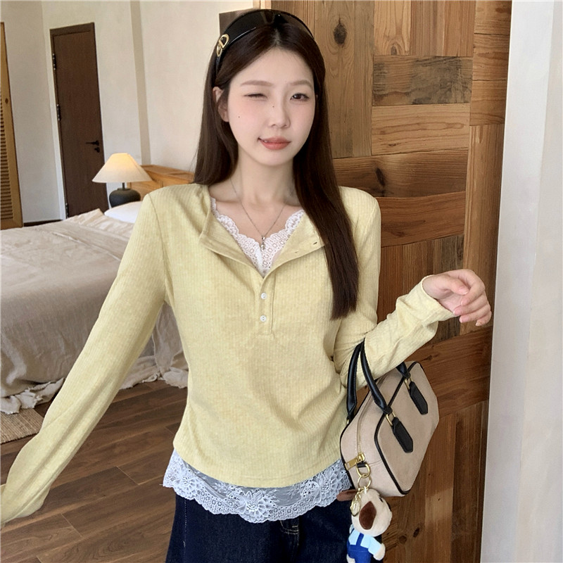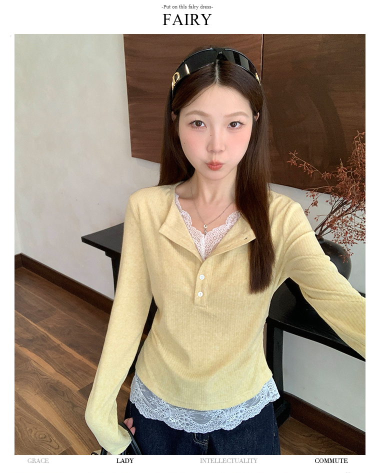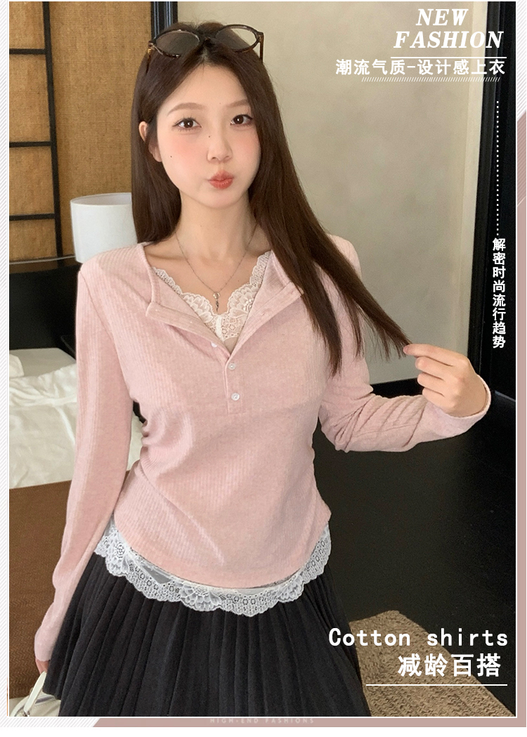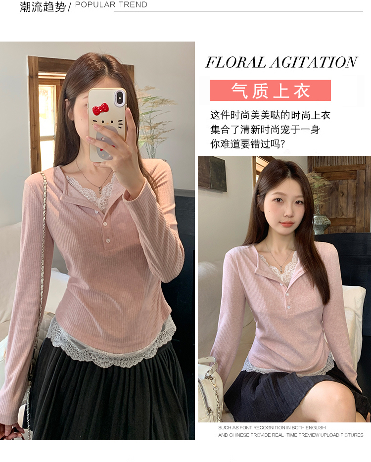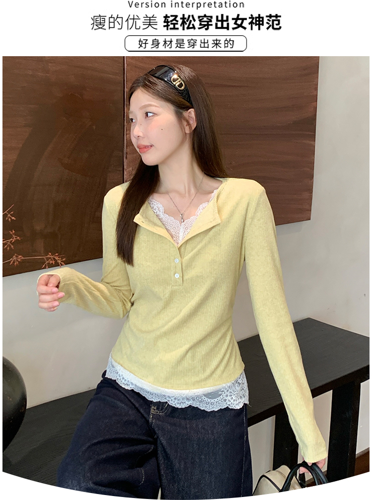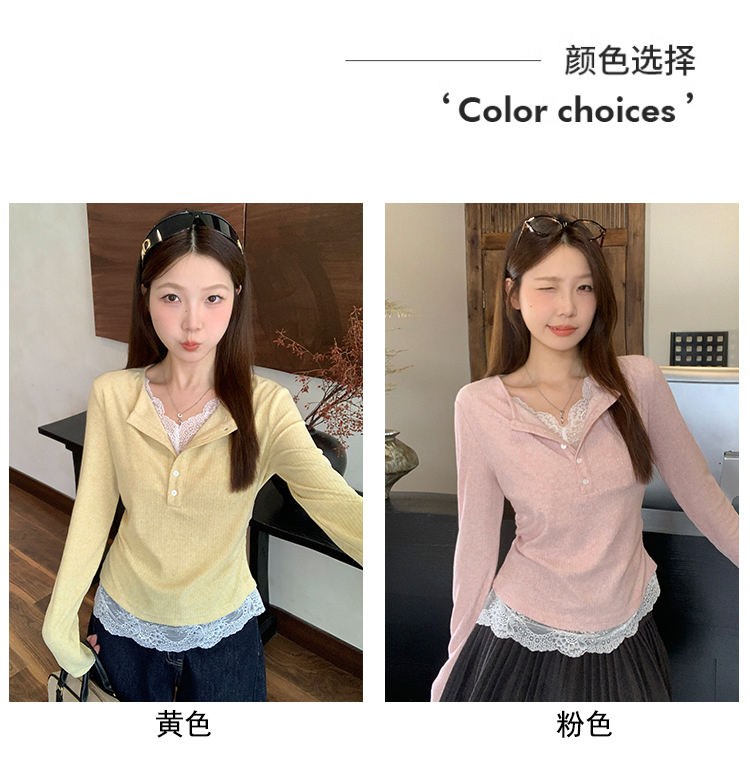 MY14024# 胖淑女蕾丝花边拼接假两件T恤上衣针织衫洋气打底衫女裝貨源服裝批發