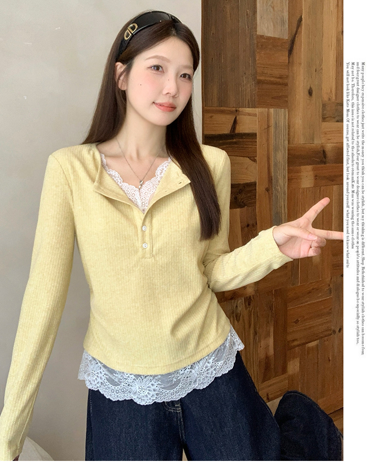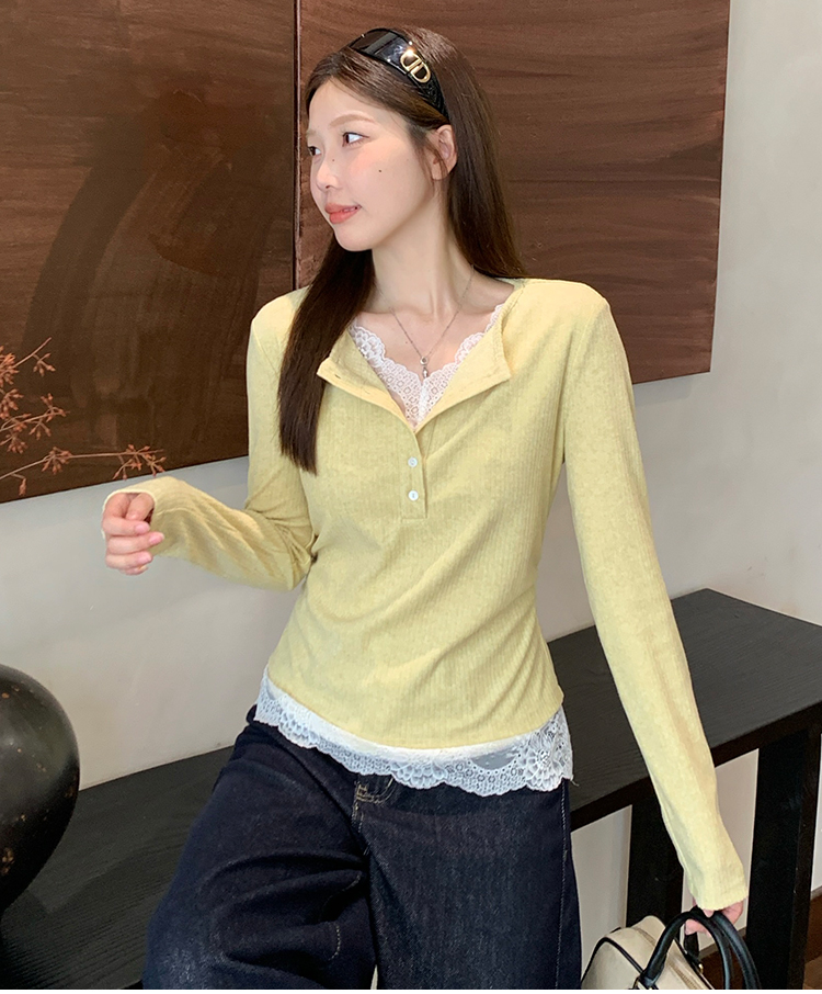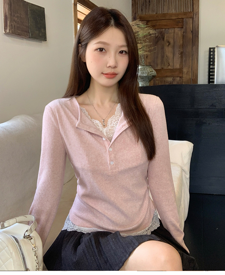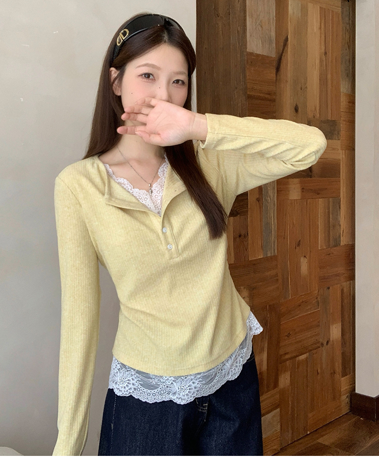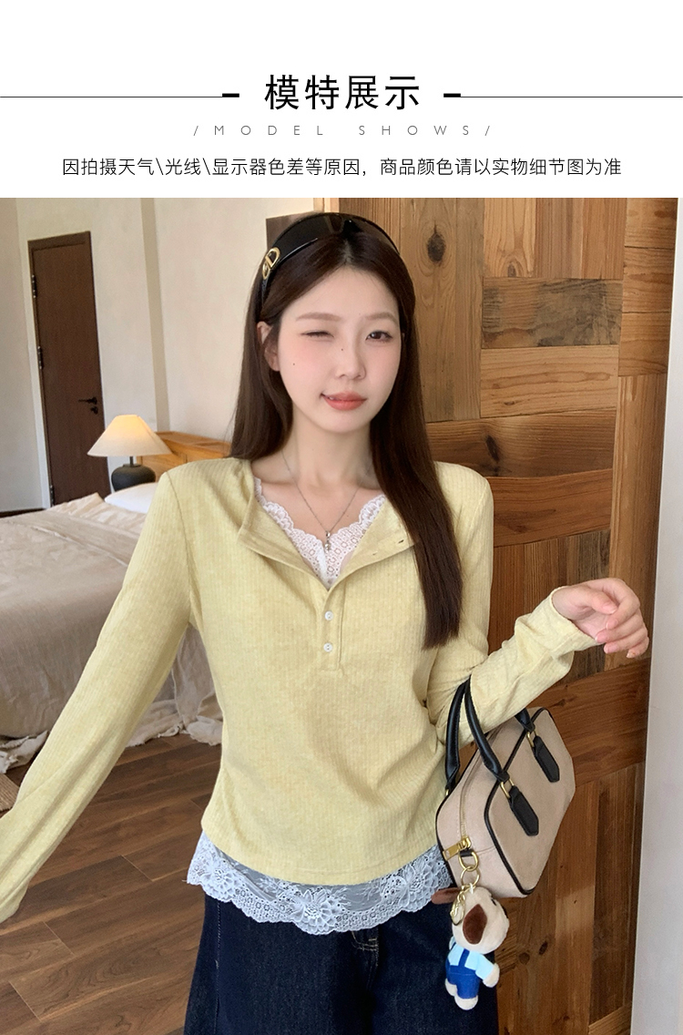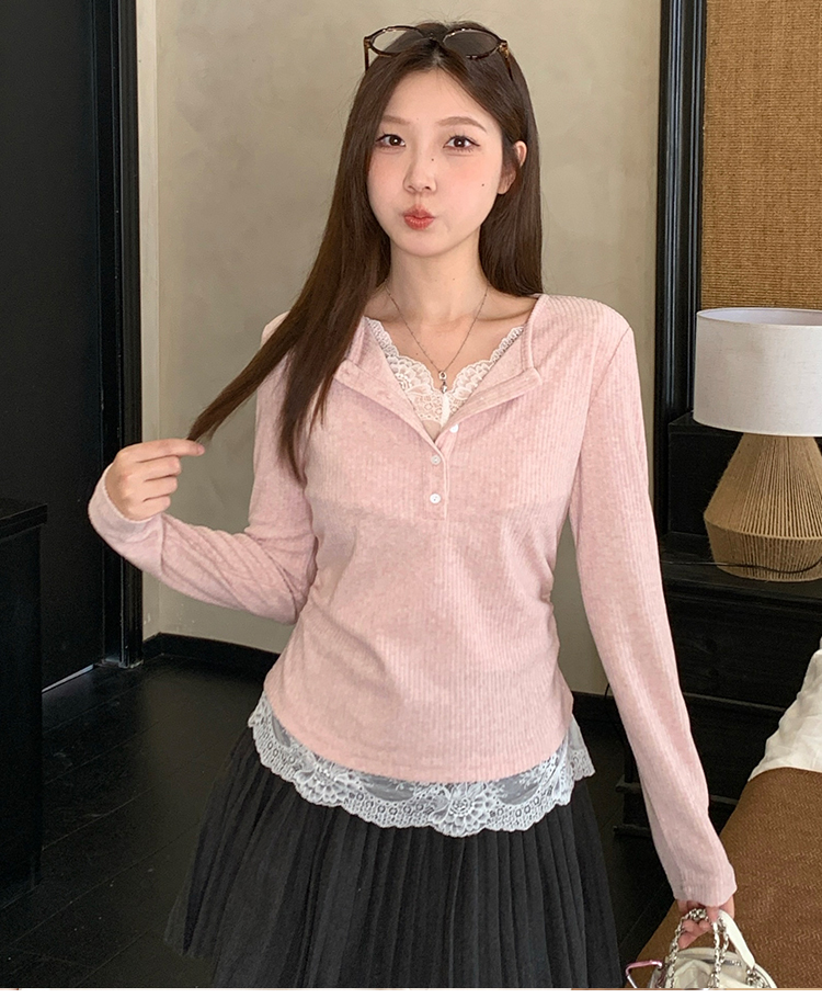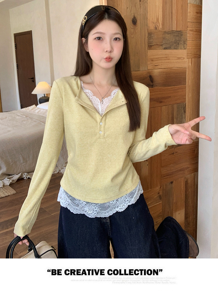 MY14024# 胖淑女蕾丝花边拼接假两件T恤上衣针织衫洋气打底衫女裝貨源服裝批發