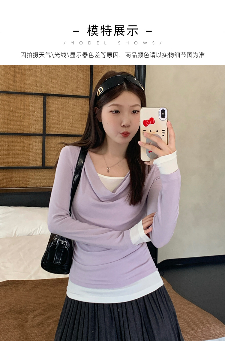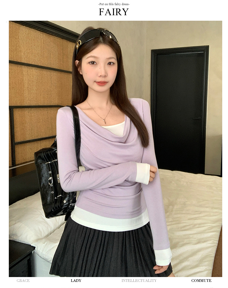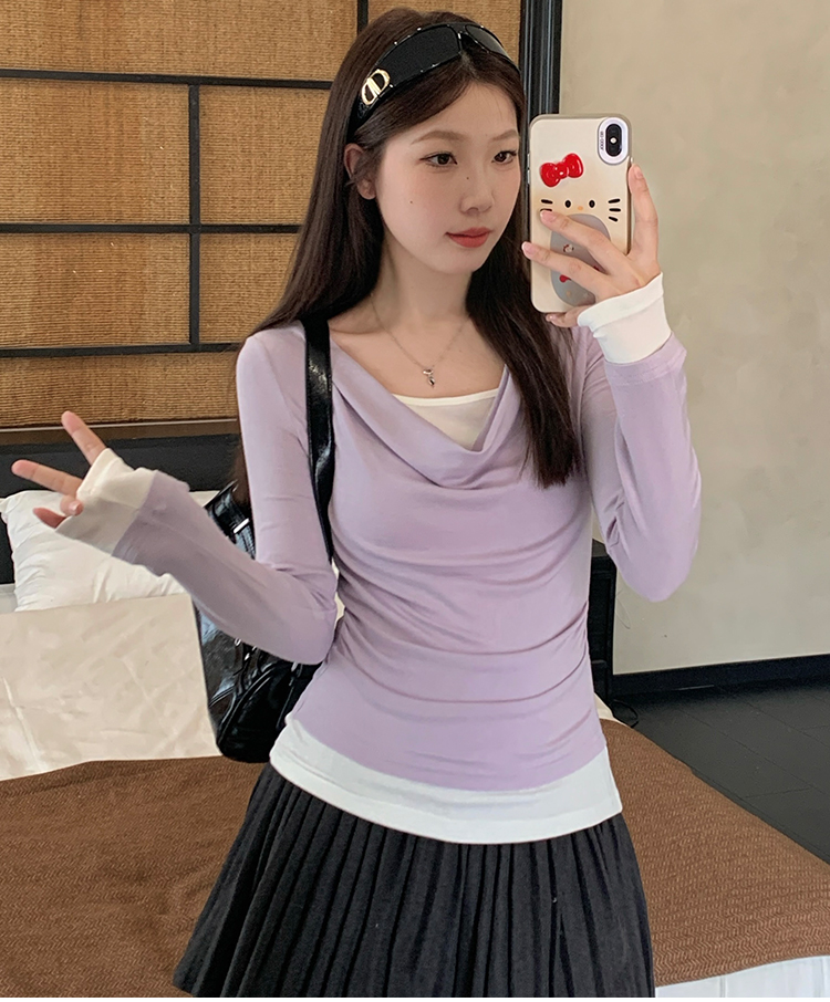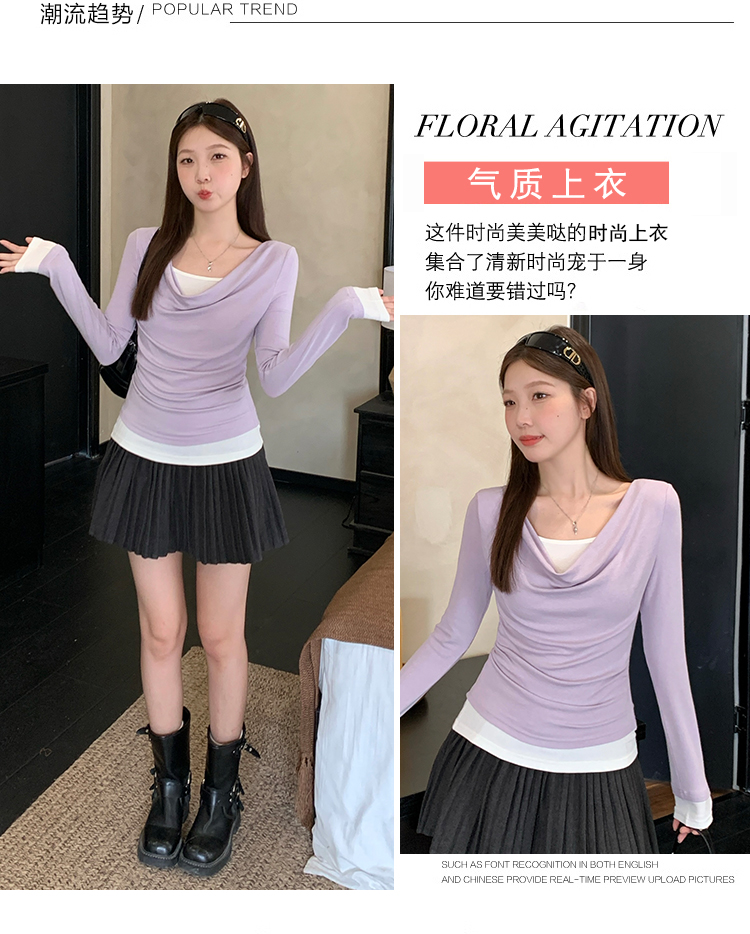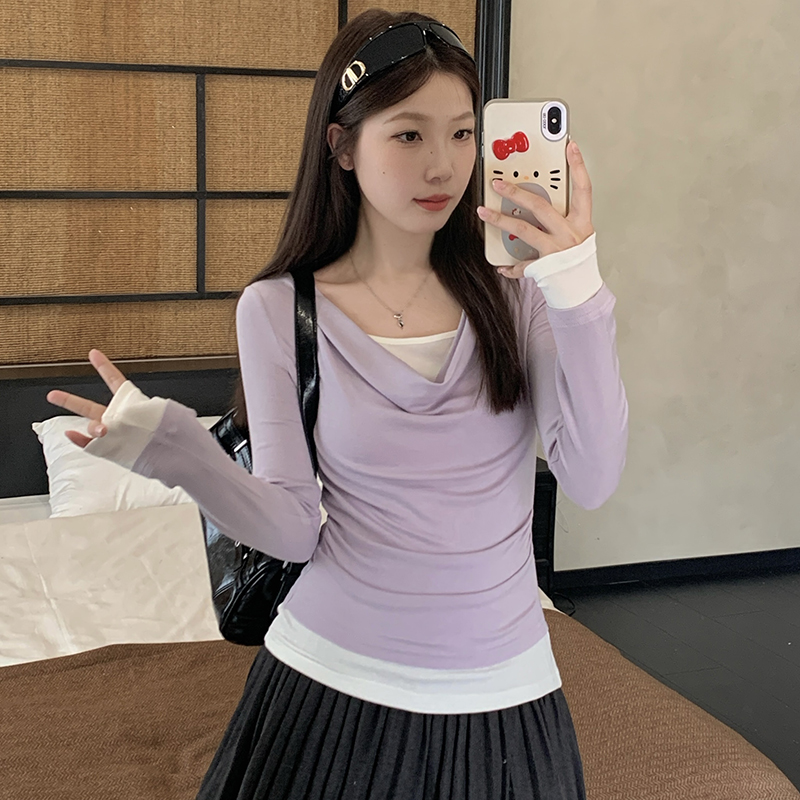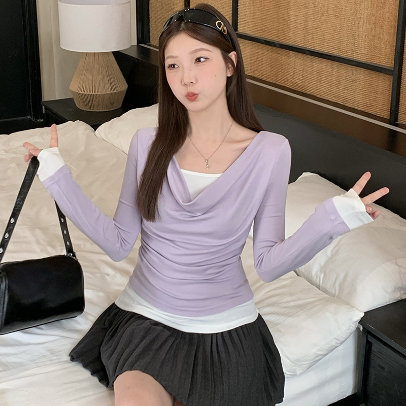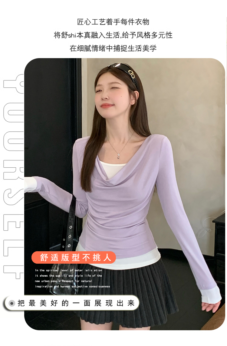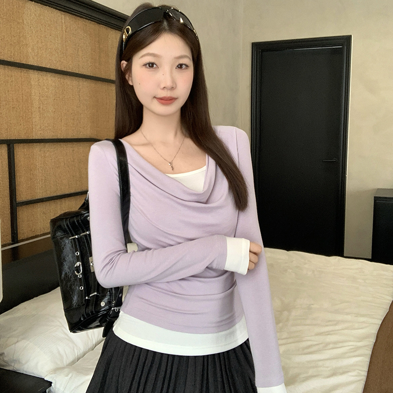 MY14025# 大码简约风气质假两件荡领拼接小衫t恤打底衫内搭上衣女裝貨源服裝批發