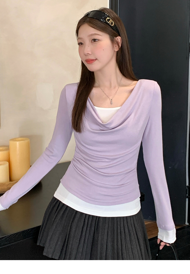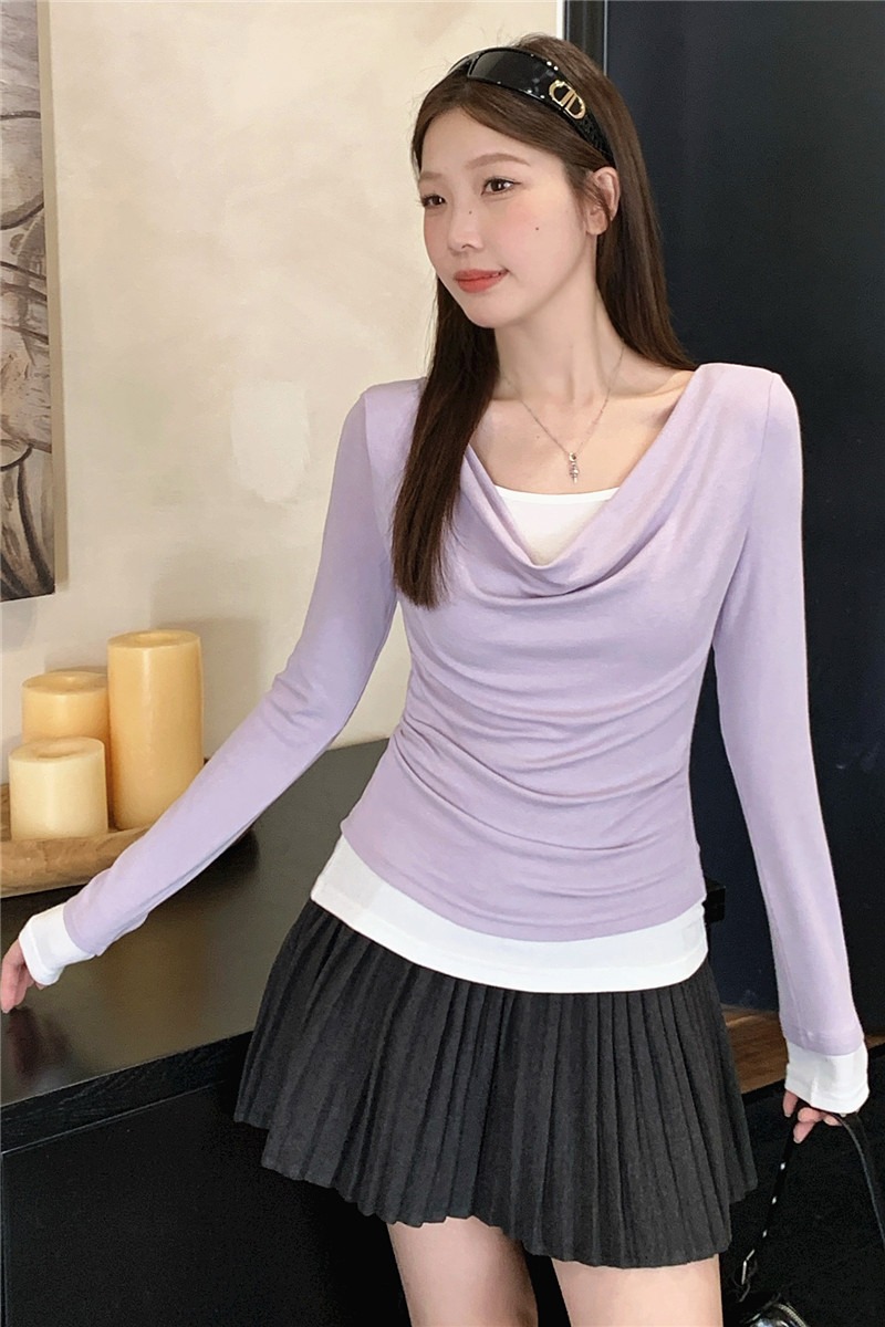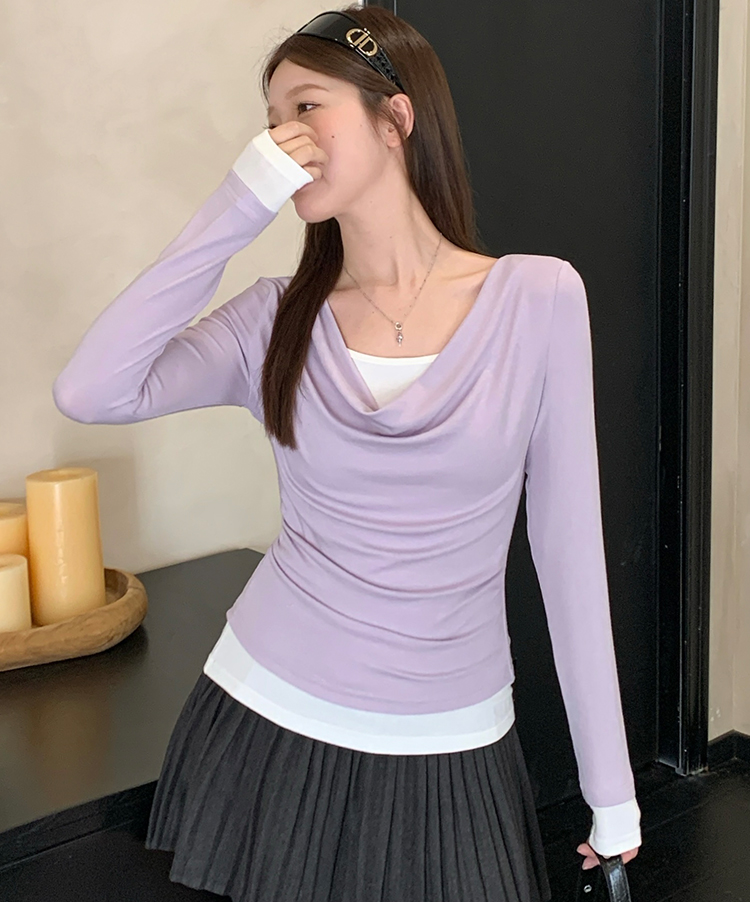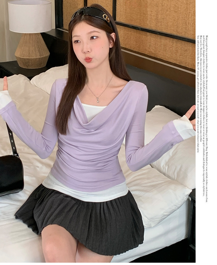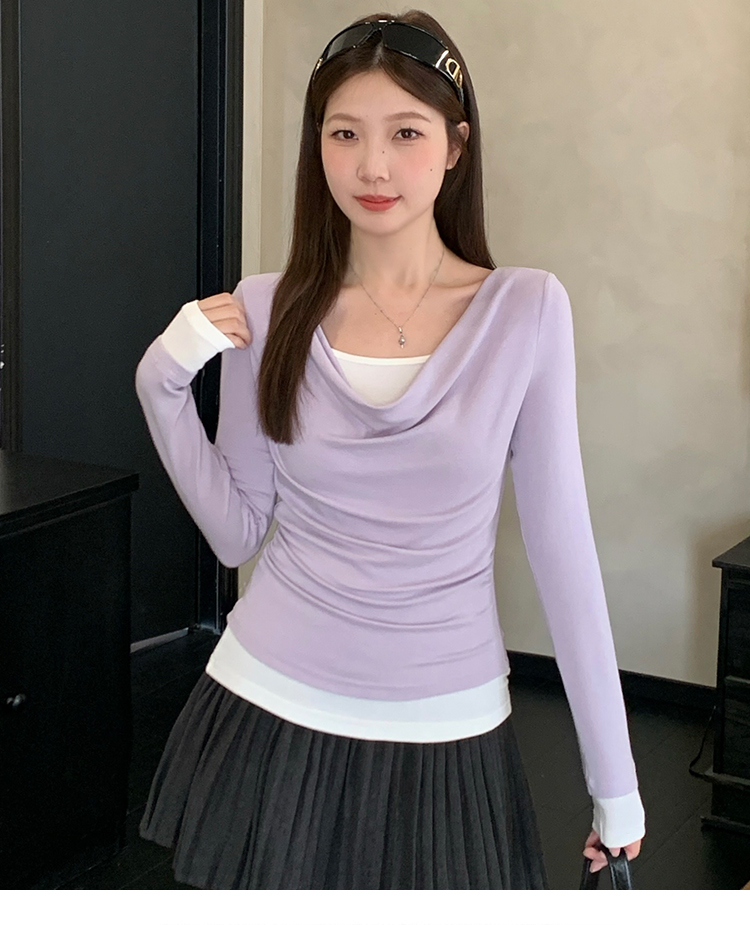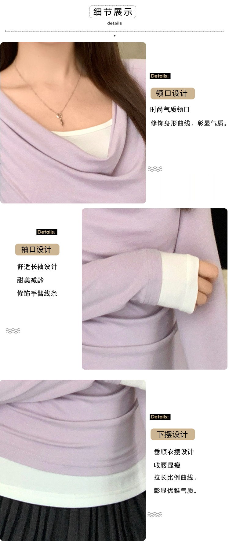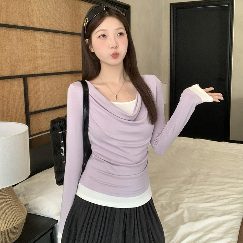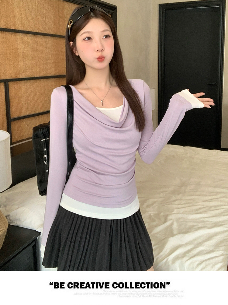 MY14025# 大码简约风气质假两件荡领拼接小衫t恤打底衫内搭上衣女裝貨源服裝批發