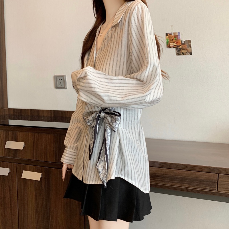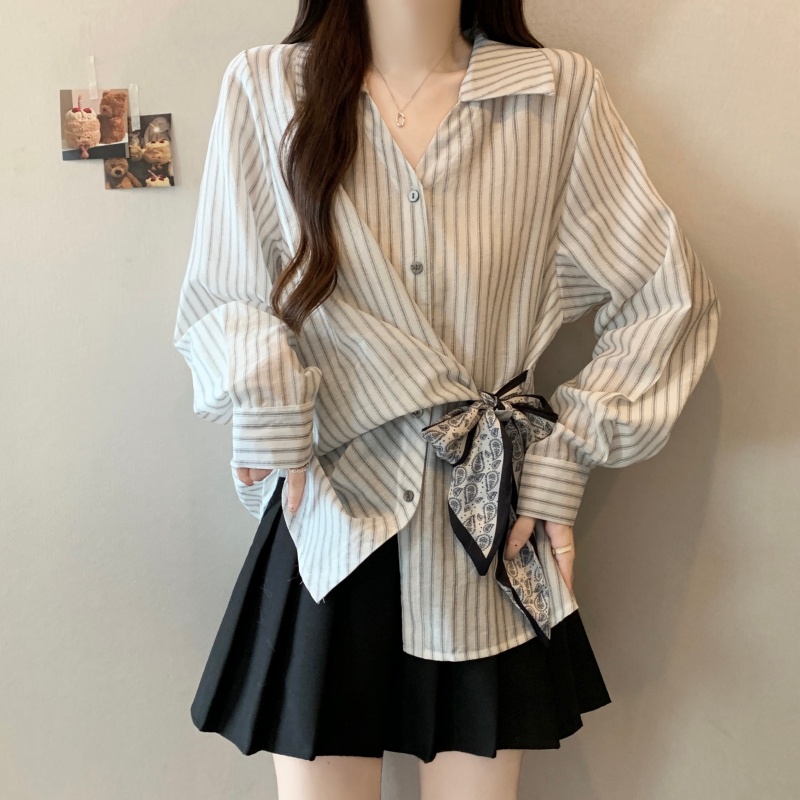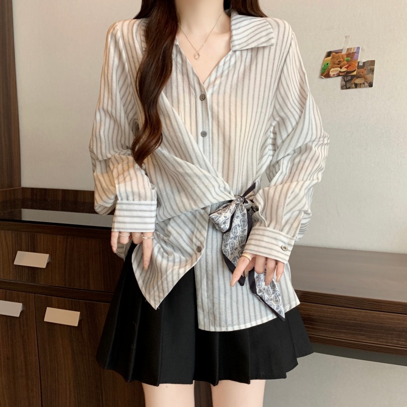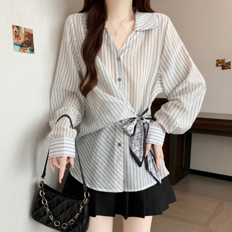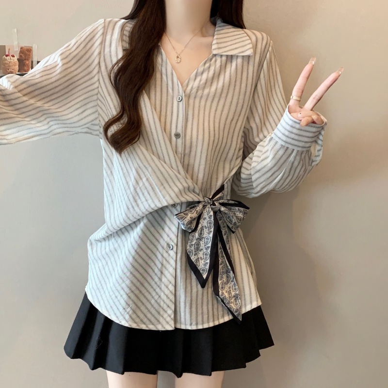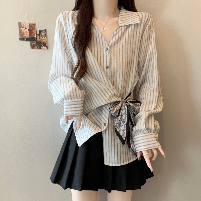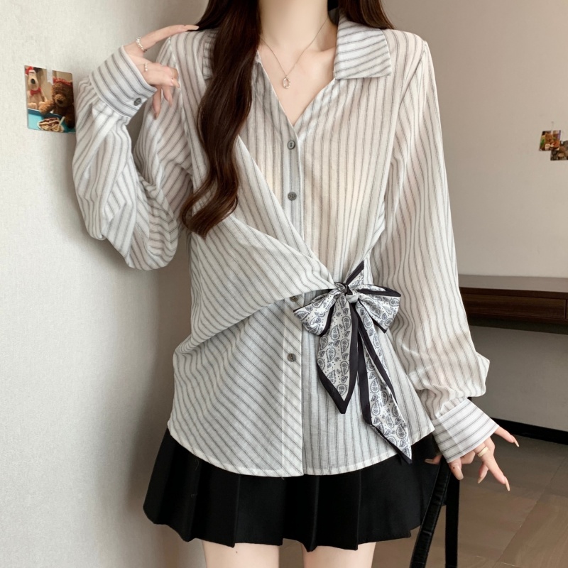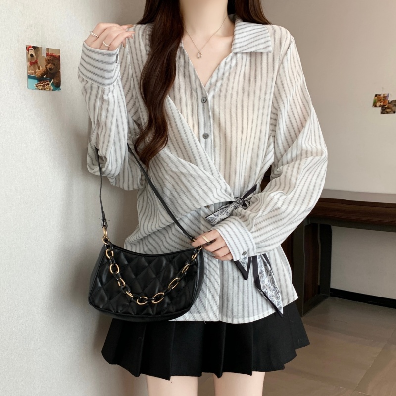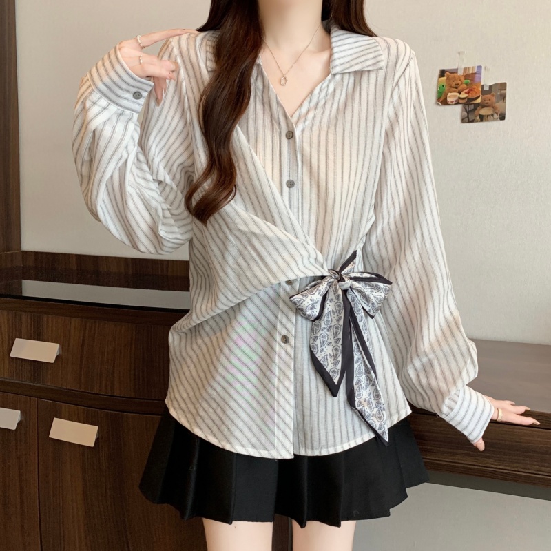 MY14028# 新款休闲百搭系带上衣韩版气质不规则白色衬衫女女裝貨源服裝批發