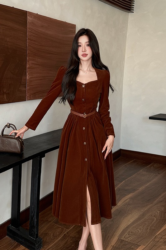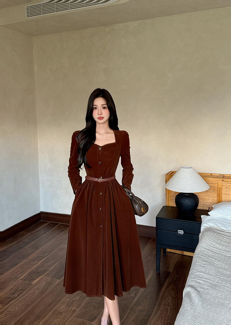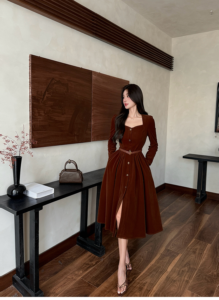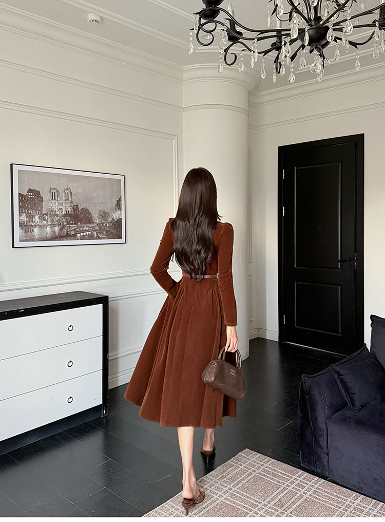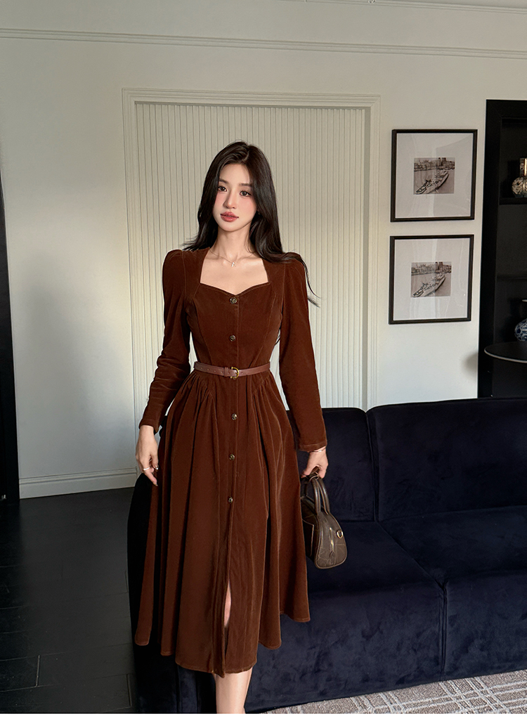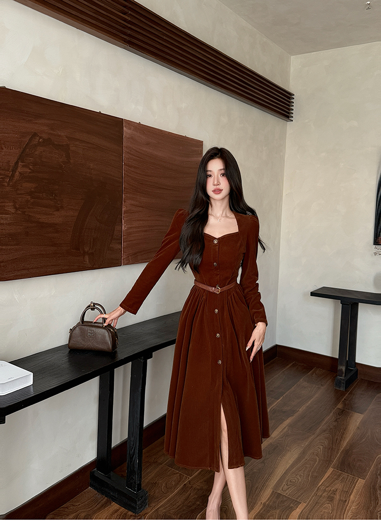 MY14052# 须尽欢 灯芯绒连衣裙秋轻奢高级感长袖法式长裙子女裝貨源服裝批發