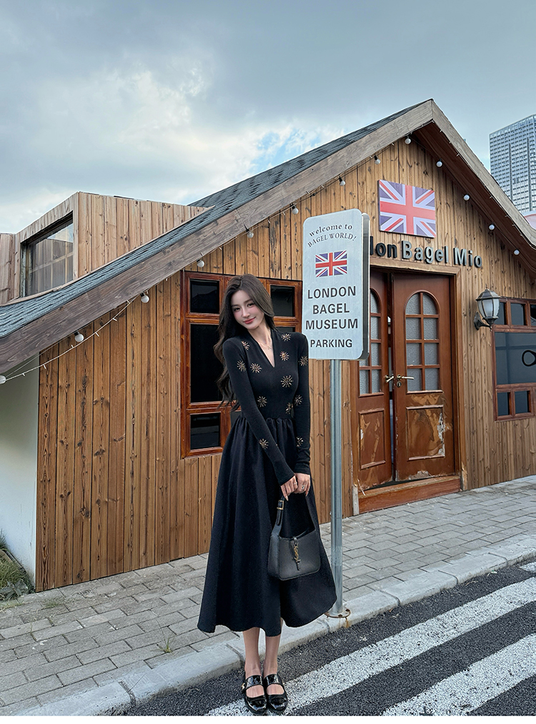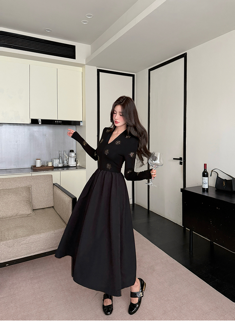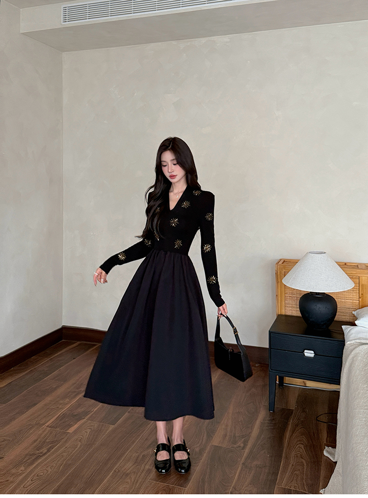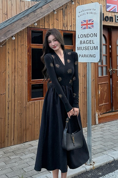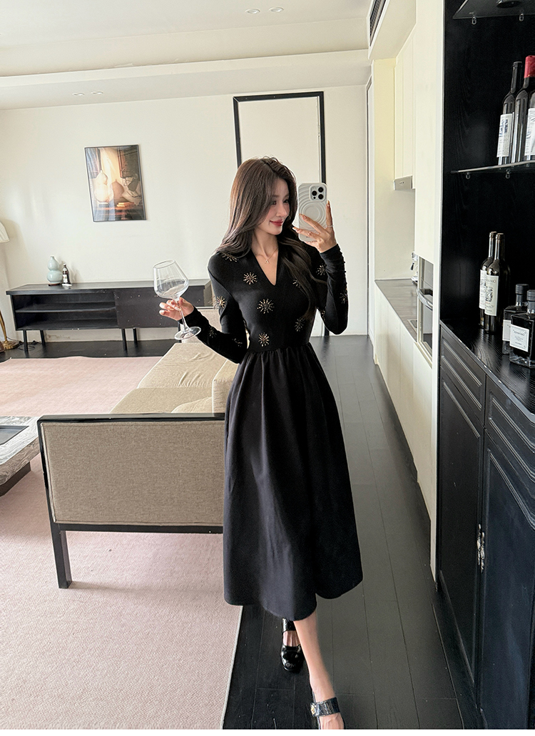 MY14053# 法式新款烫钻太阳花长袖时尚显瘦气质连衣裙女裝貨源服裝批發
