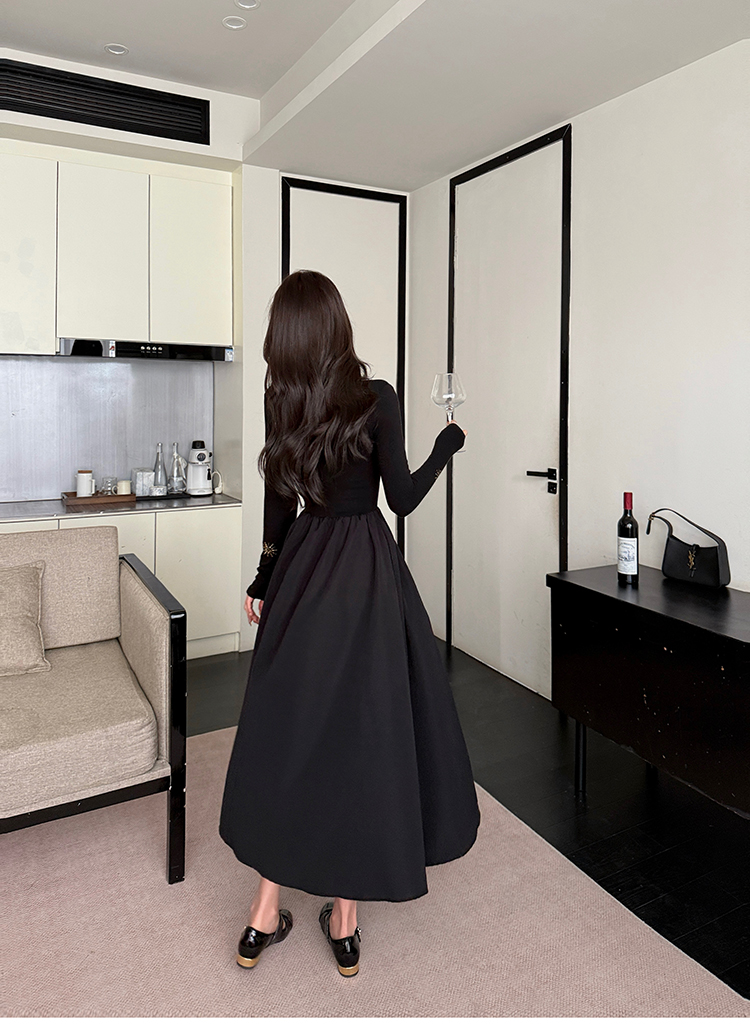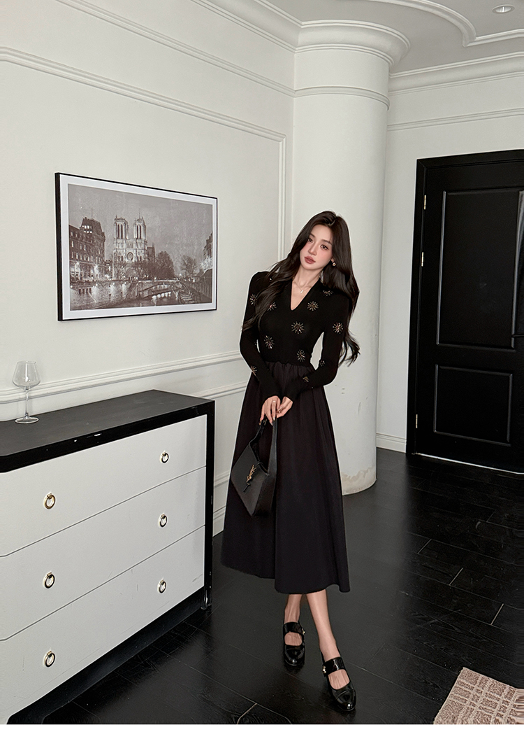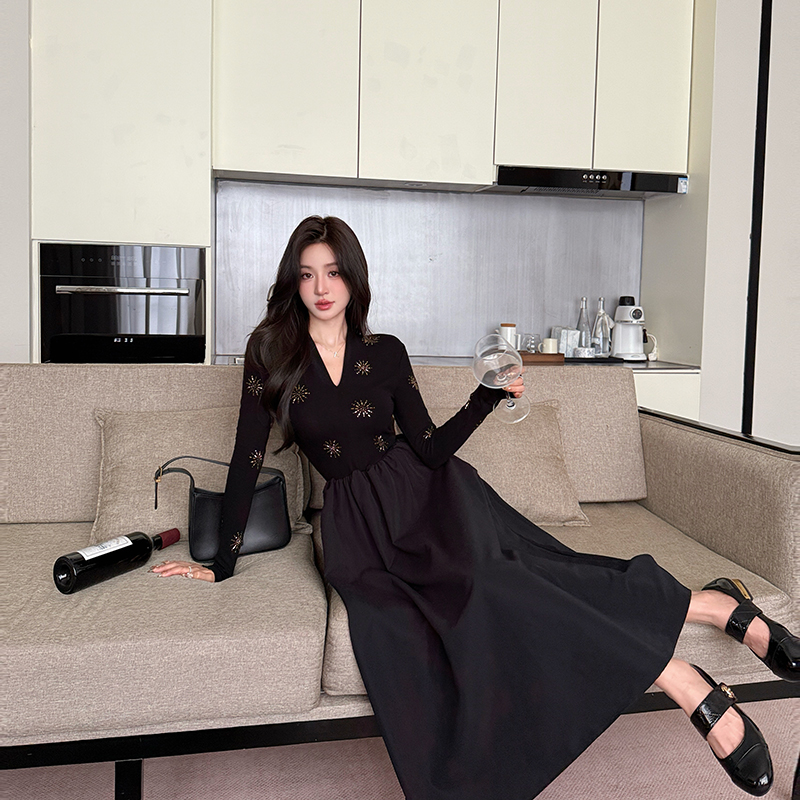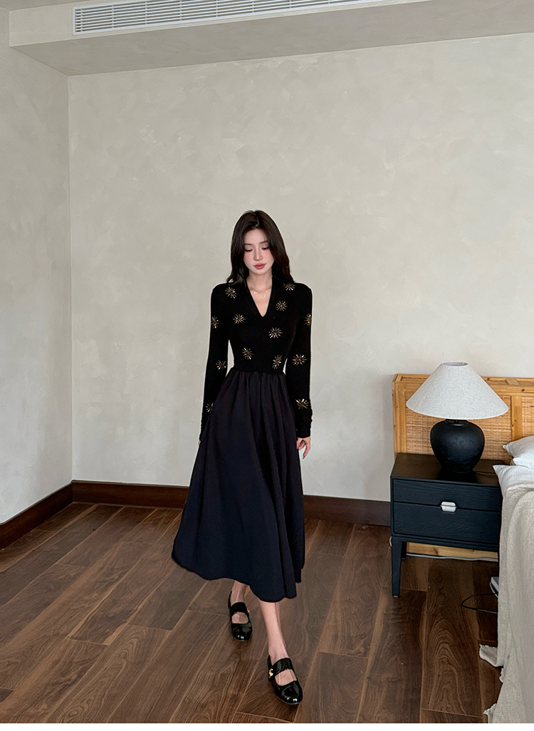 MY14053# 法式新款烫钻太阳花长袖时尚显瘦气质连衣裙女裝貨源服裝批發