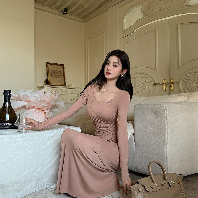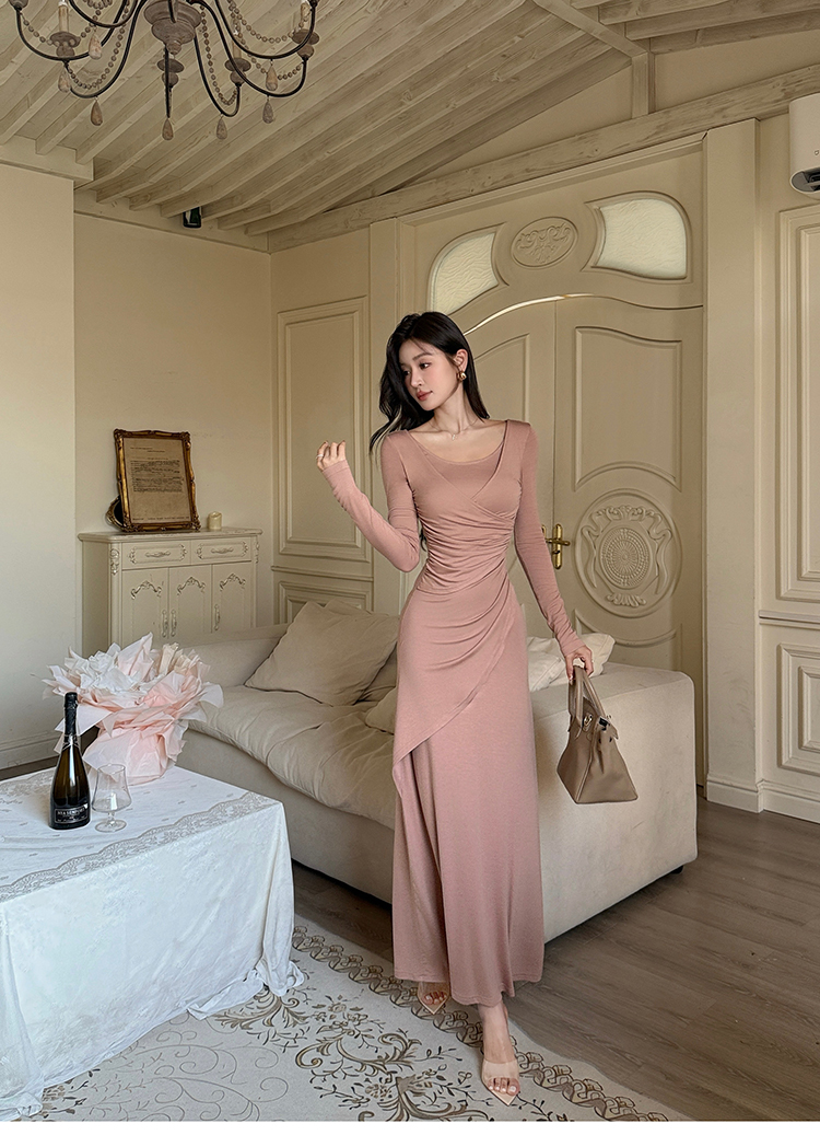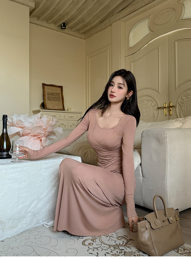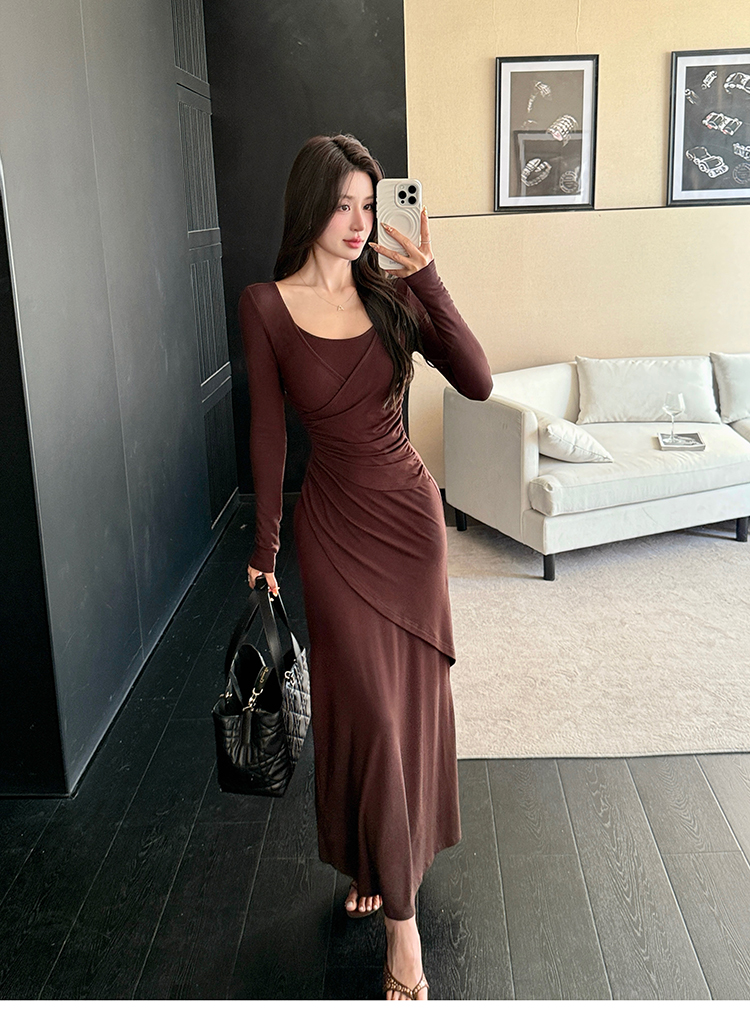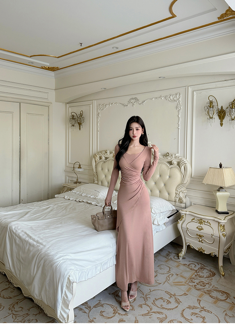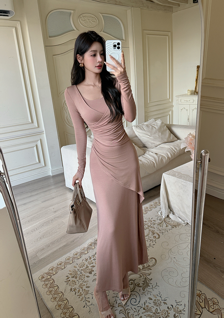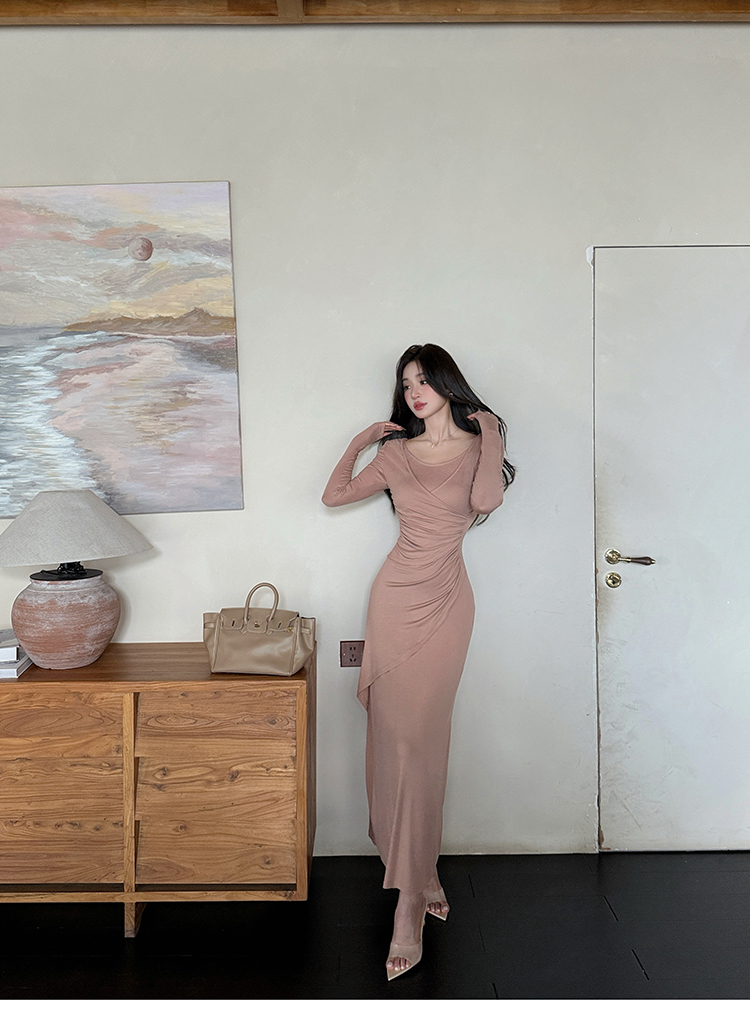 MY14054# 艺术白月光 气质收腰长款褶皱A字连衣裙内搭打底裙子女裝貨源服裝批發