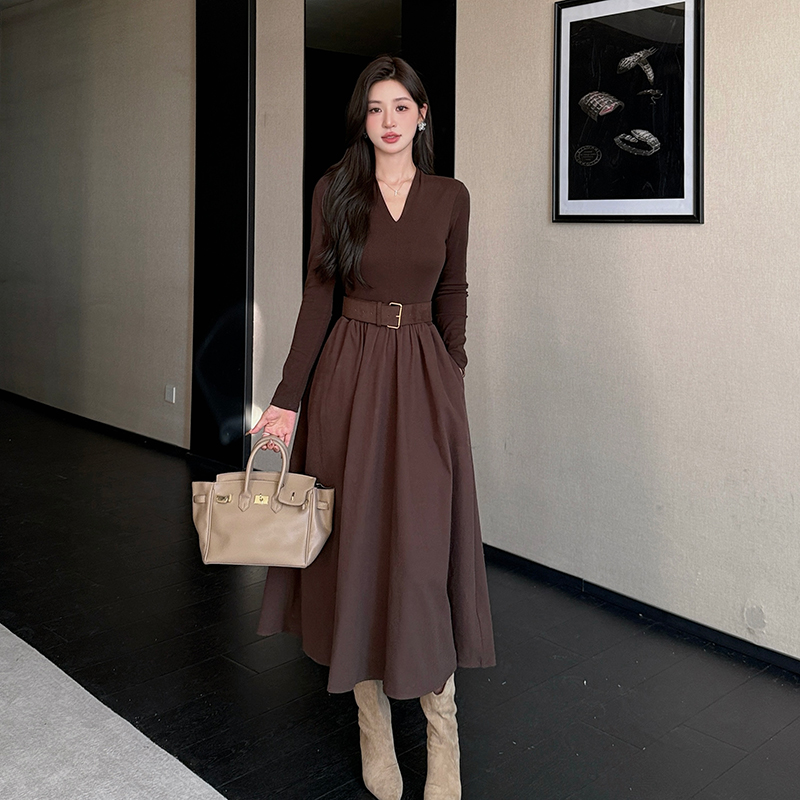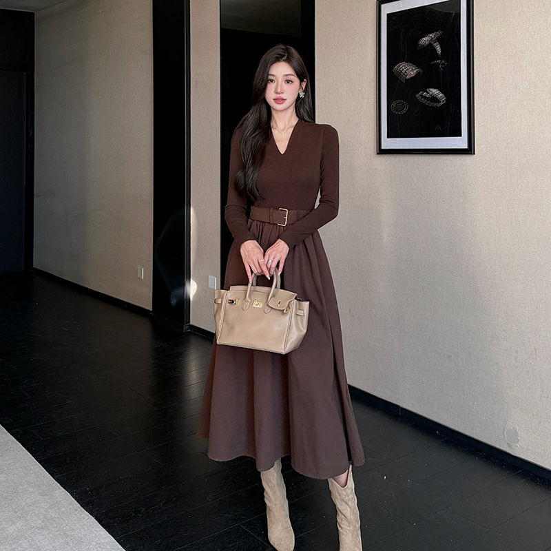 MY14055# 陌野复古卡其长袖连衣裙女高腰显瘦A字百褶裙长裙女裝貨源服裝批發