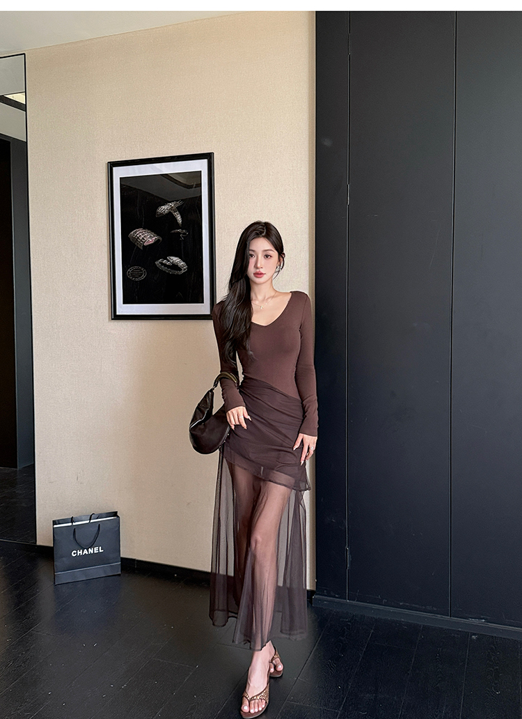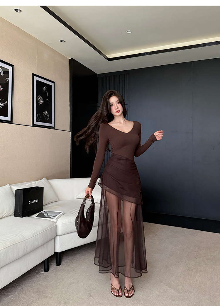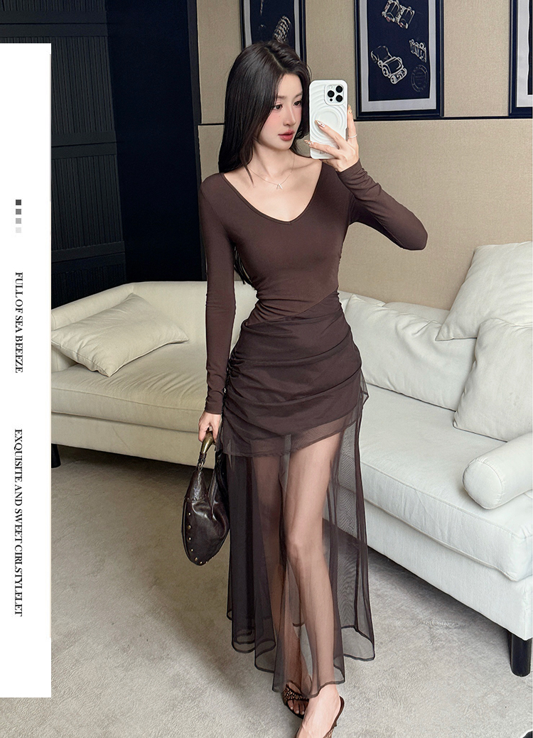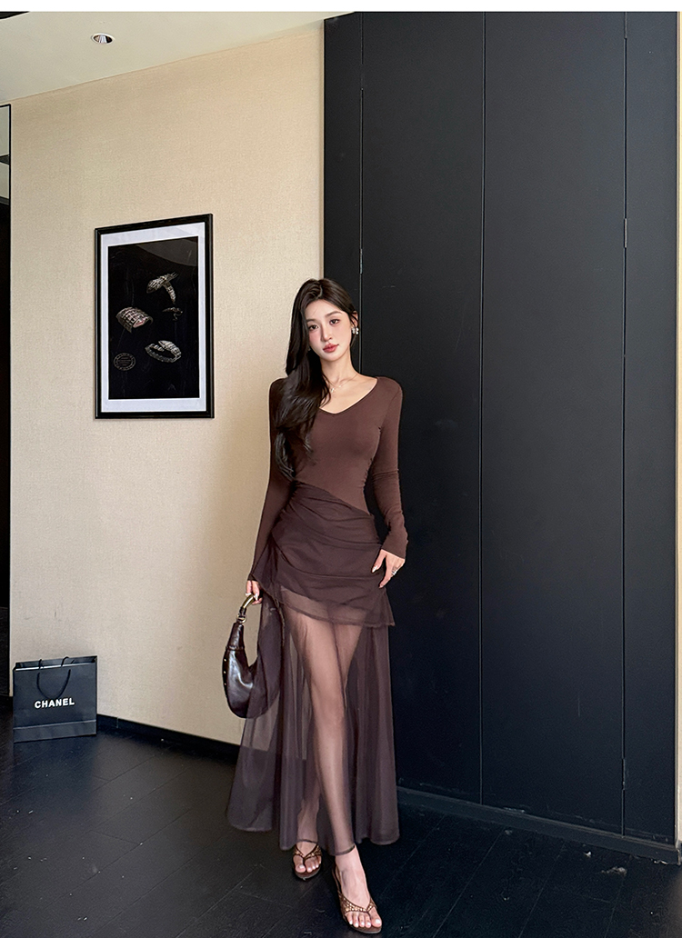 MY14058# 一纸云烟V领修身针织天丝连衣裙女秋冬季气质收腰网纱长裙女裝貨源服裝批發