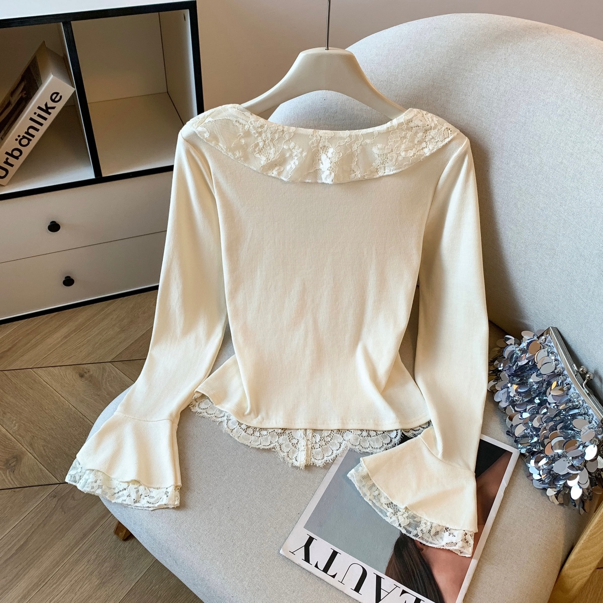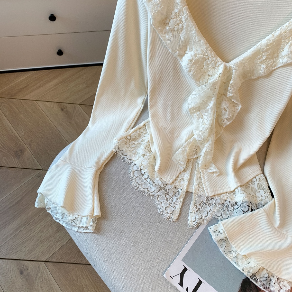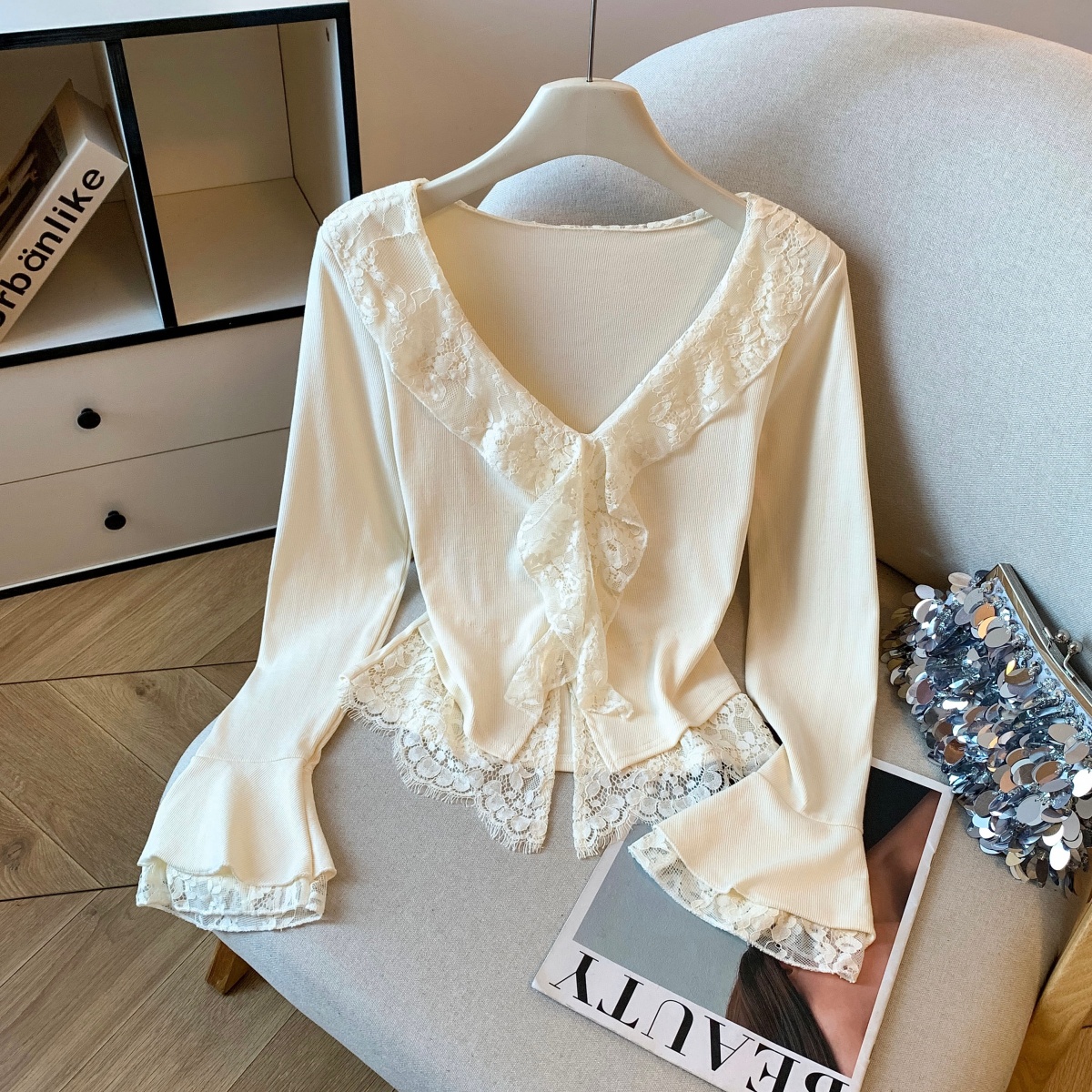 MY14065# 新款蕾丝拼接长袖女装韩系穿搭收腰开叉别致喇叭袖上衣女裝貨源服裝批發