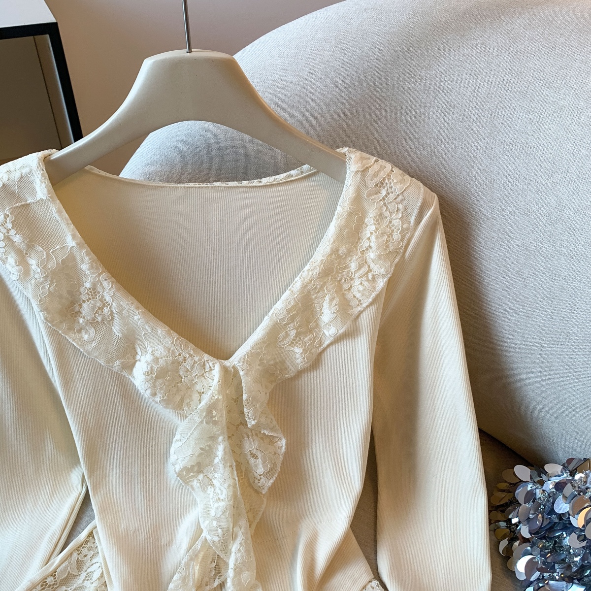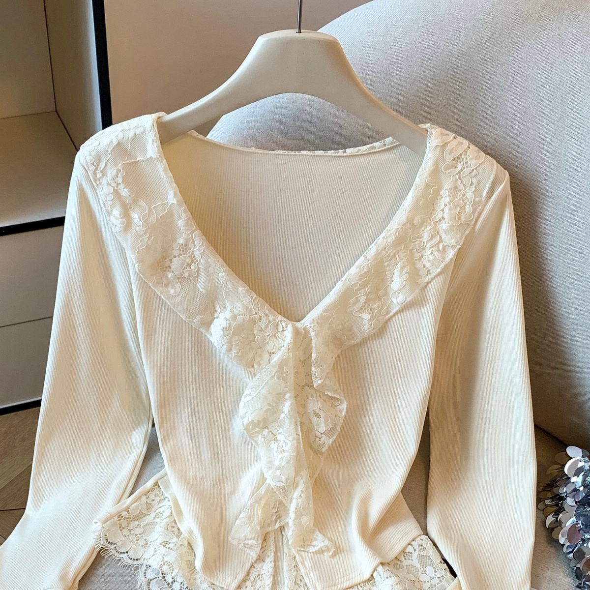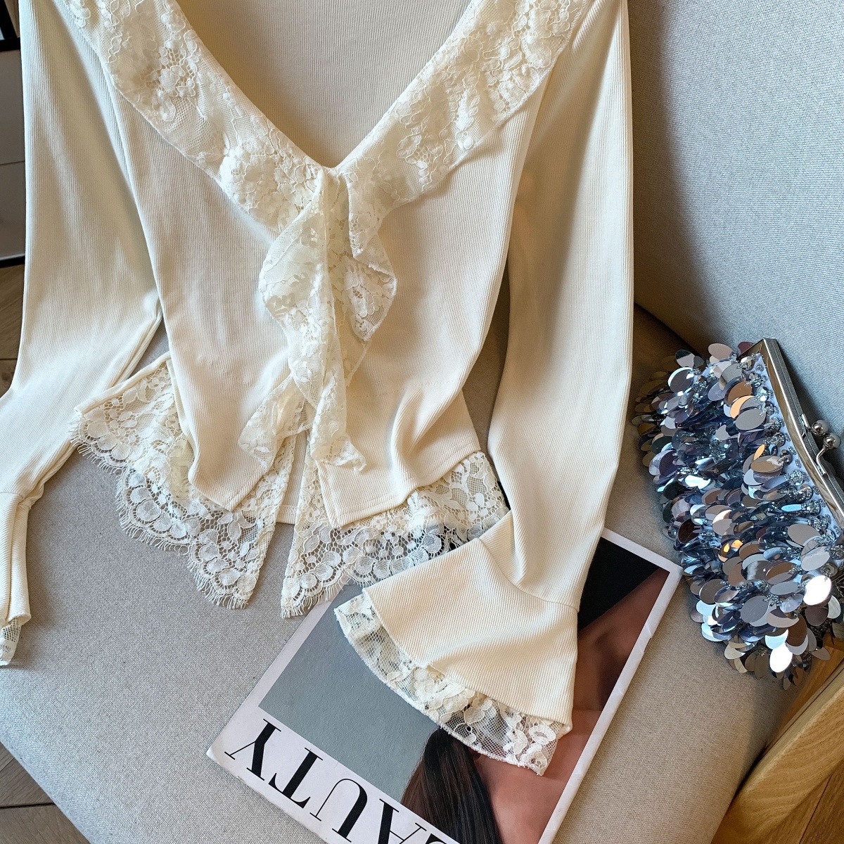 MY14065# 新款蕾丝拼接长袖女装韩系穿搭收腰开叉别致喇叭袖上衣女裝貨源服裝批發