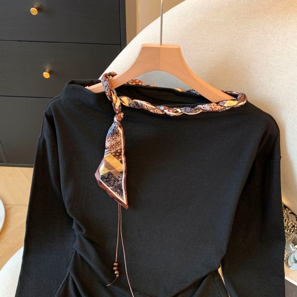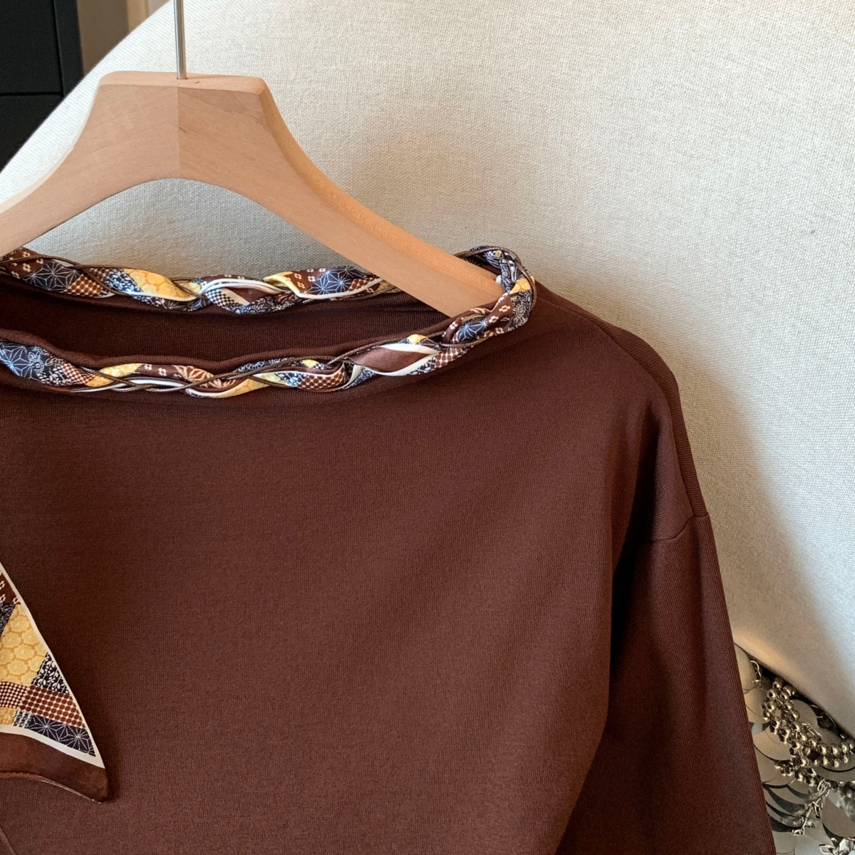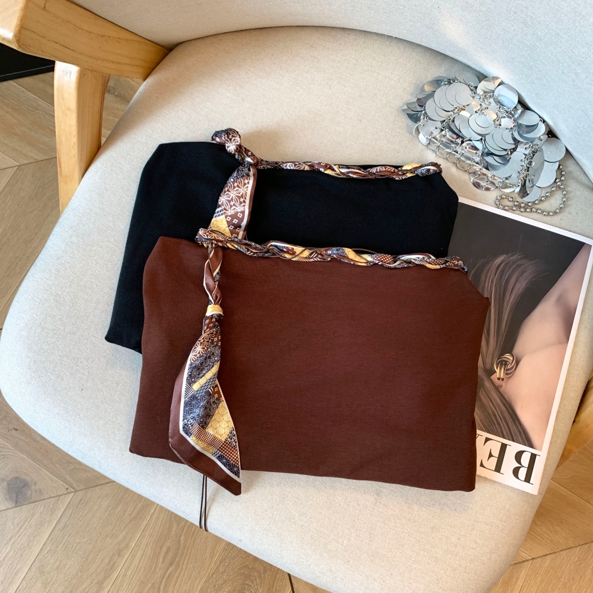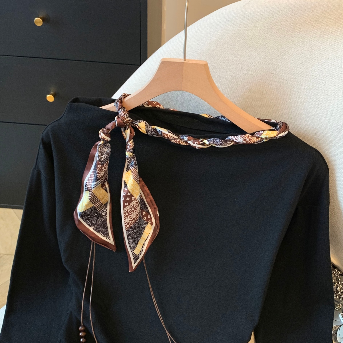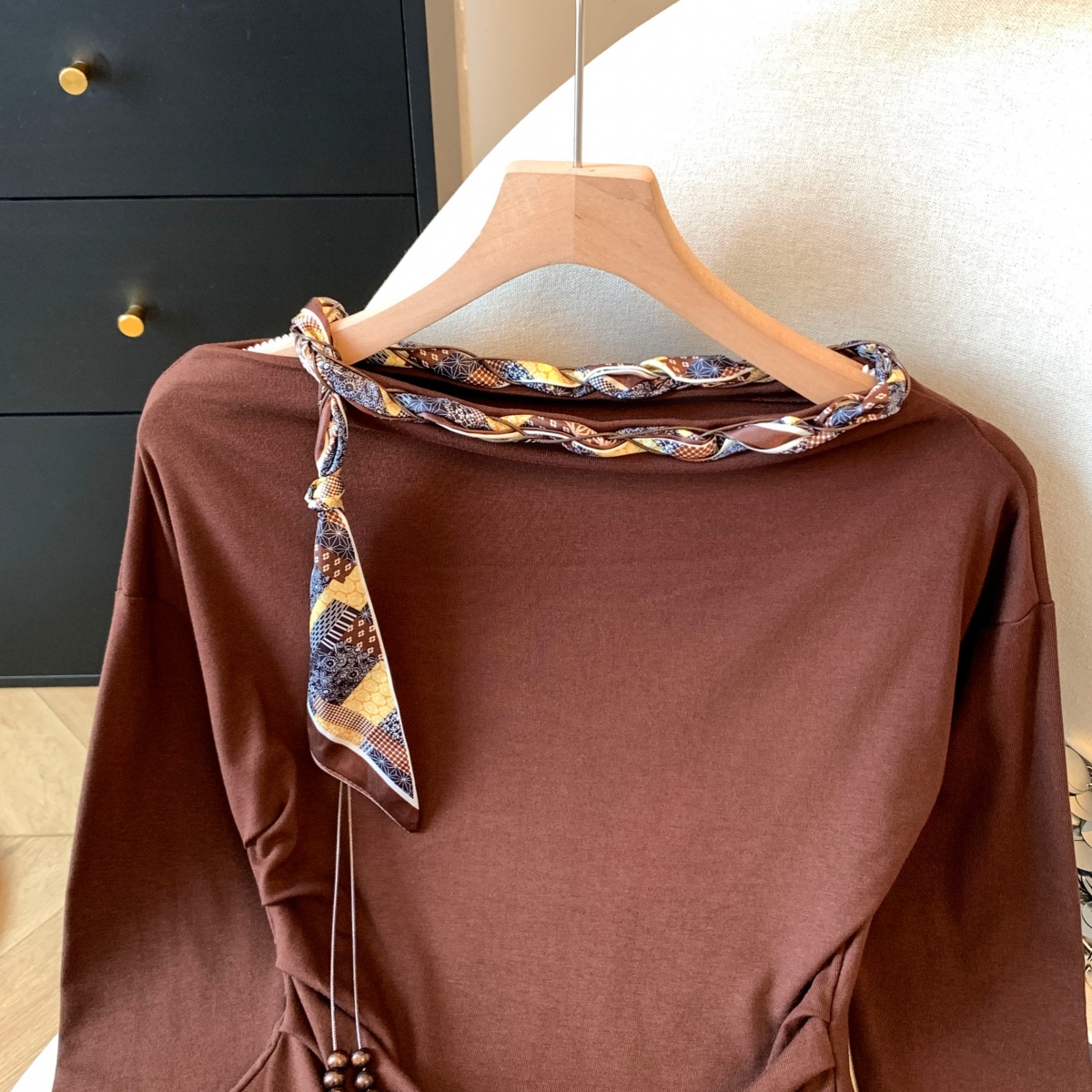 MY14069# 新款修身搭配丝巾设计通勤显瘦百搭一字肩套头针织衫女裝貨源服裝批發