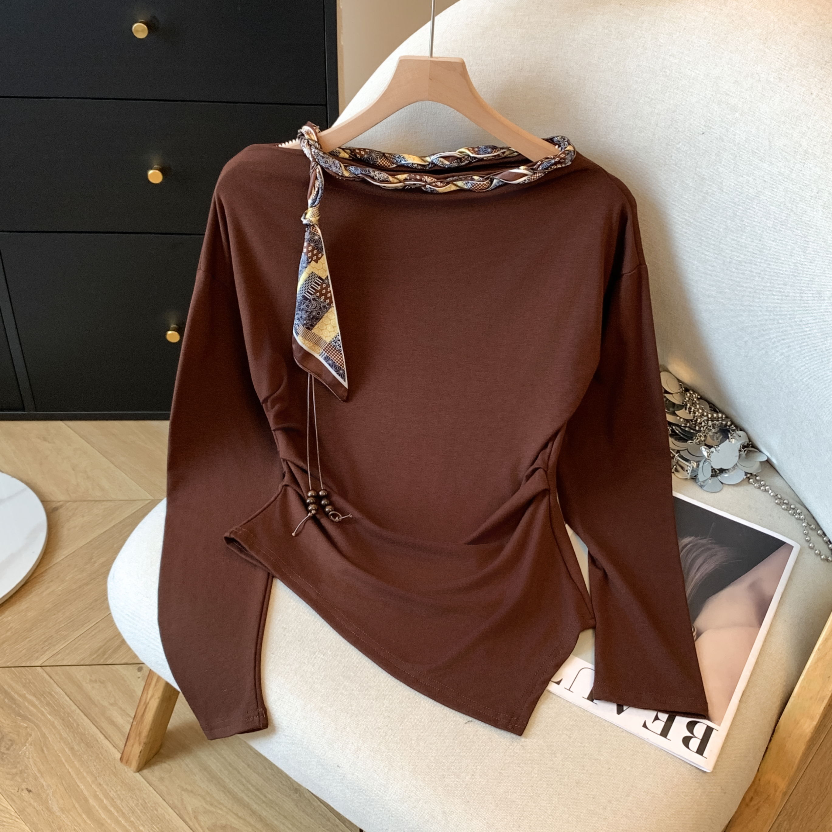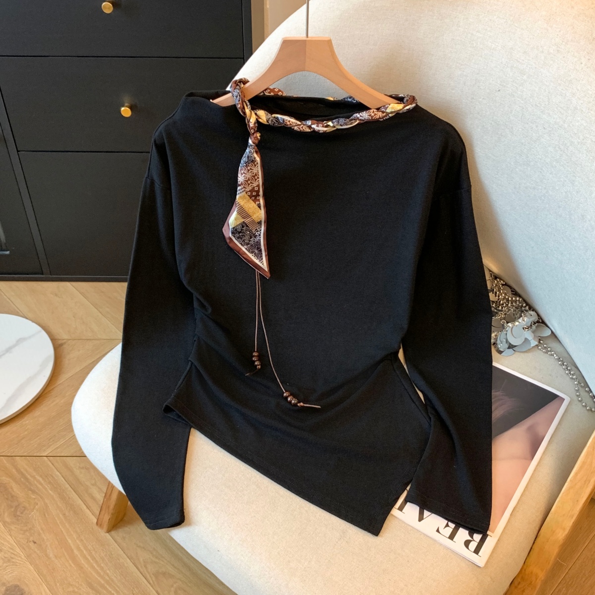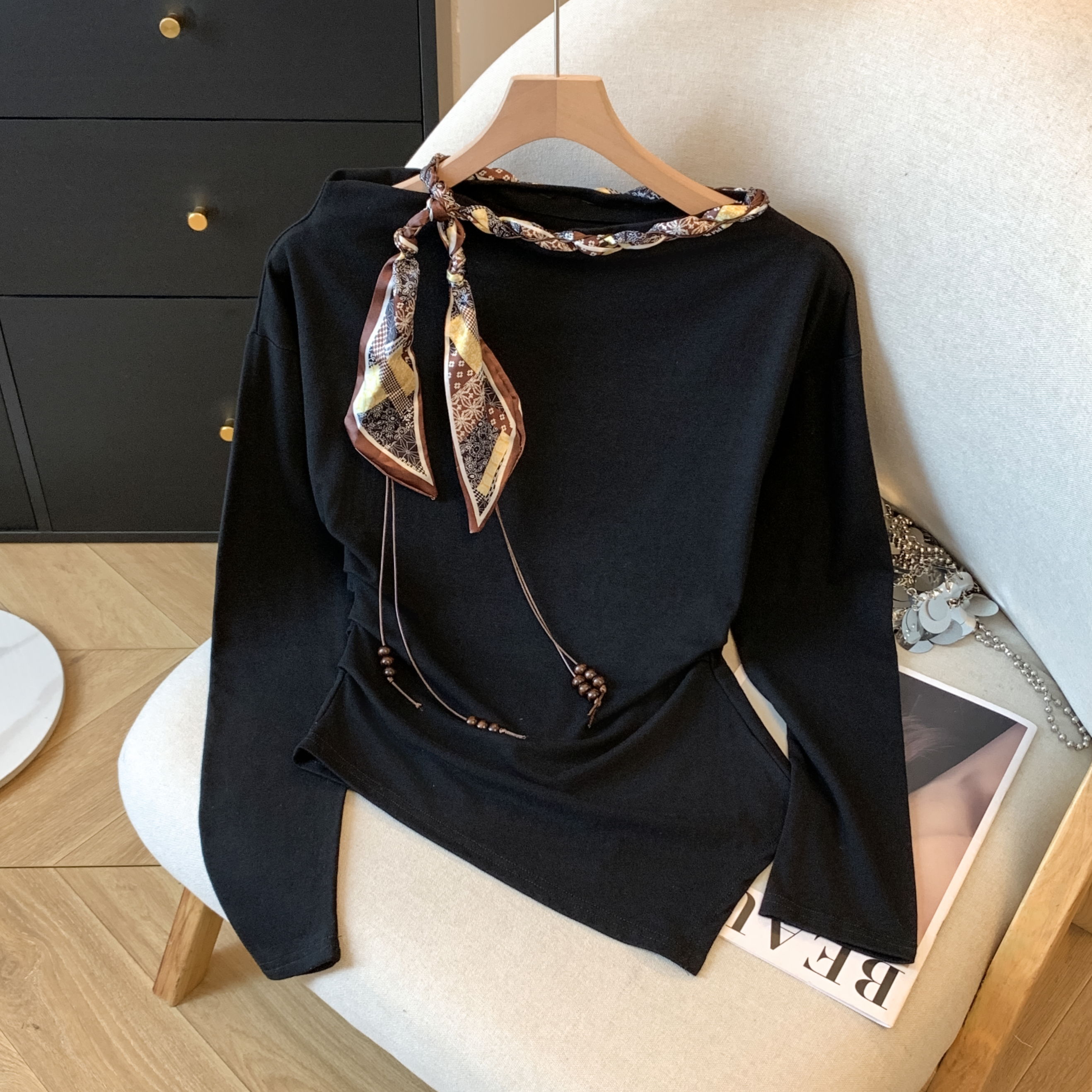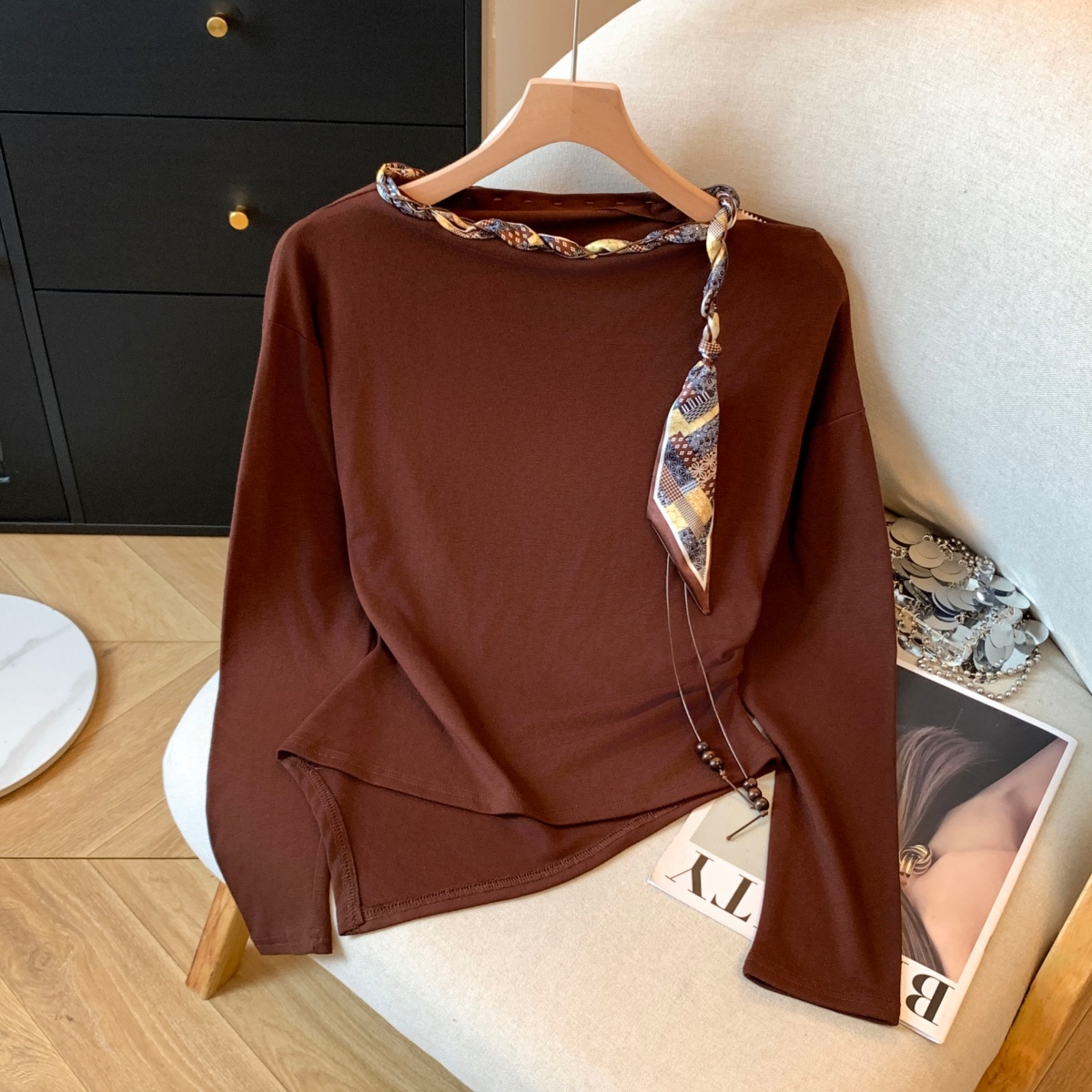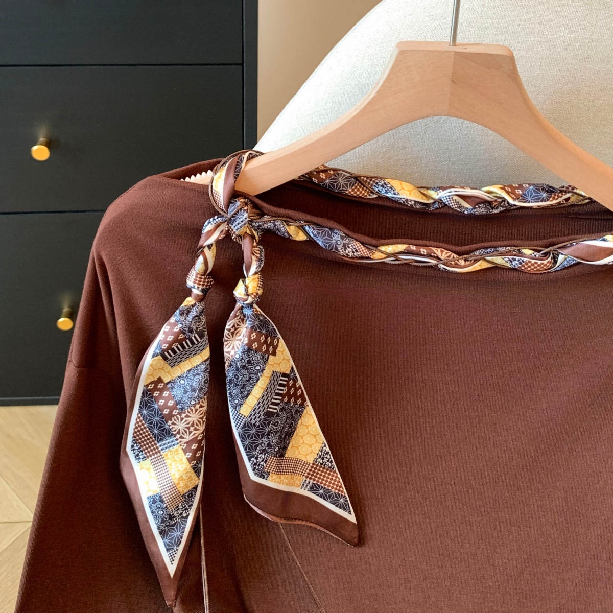 MY14069# 新款修身搭配丝巾设计通勤显瘦百搭一字肩套头针织衫女裝貨源服裝批發