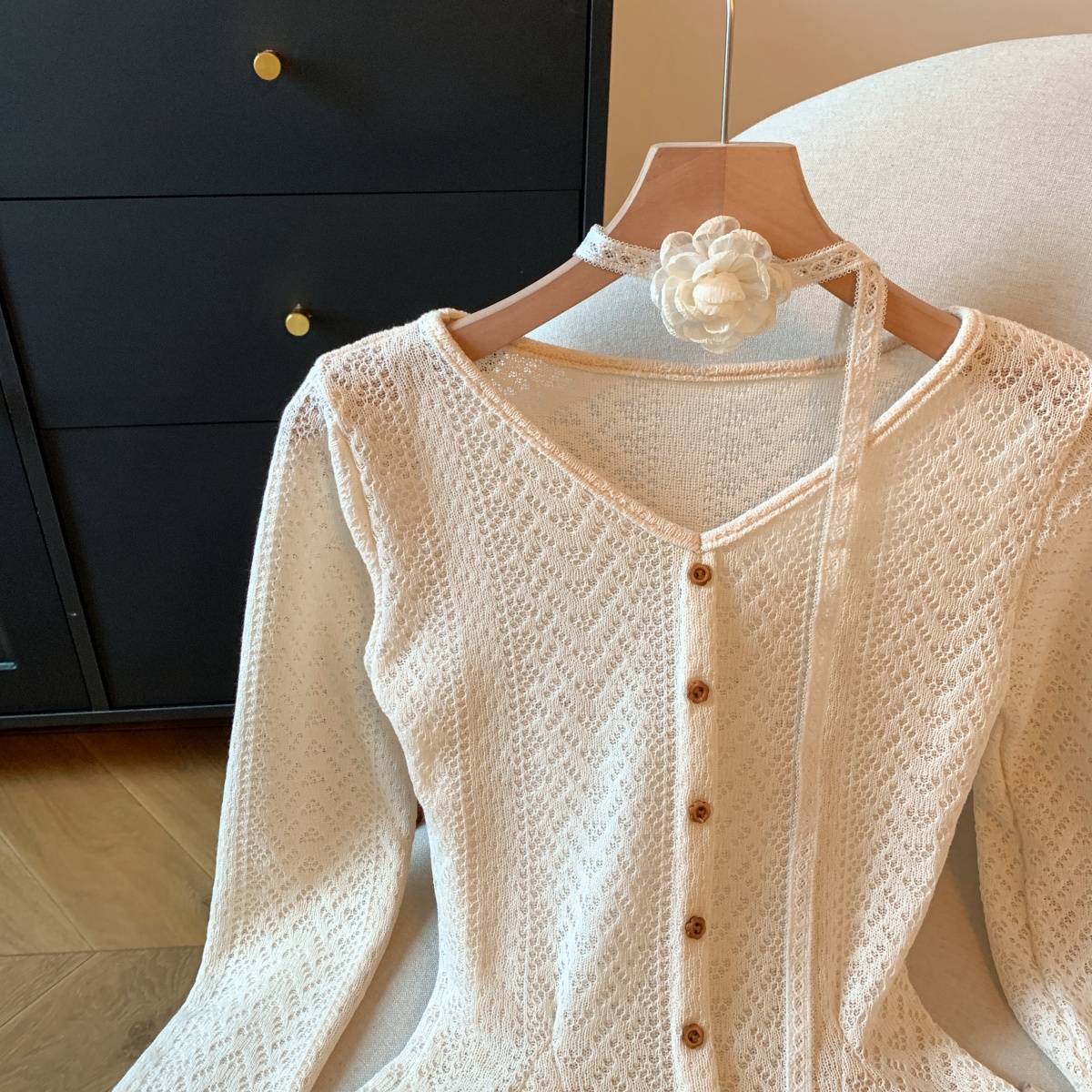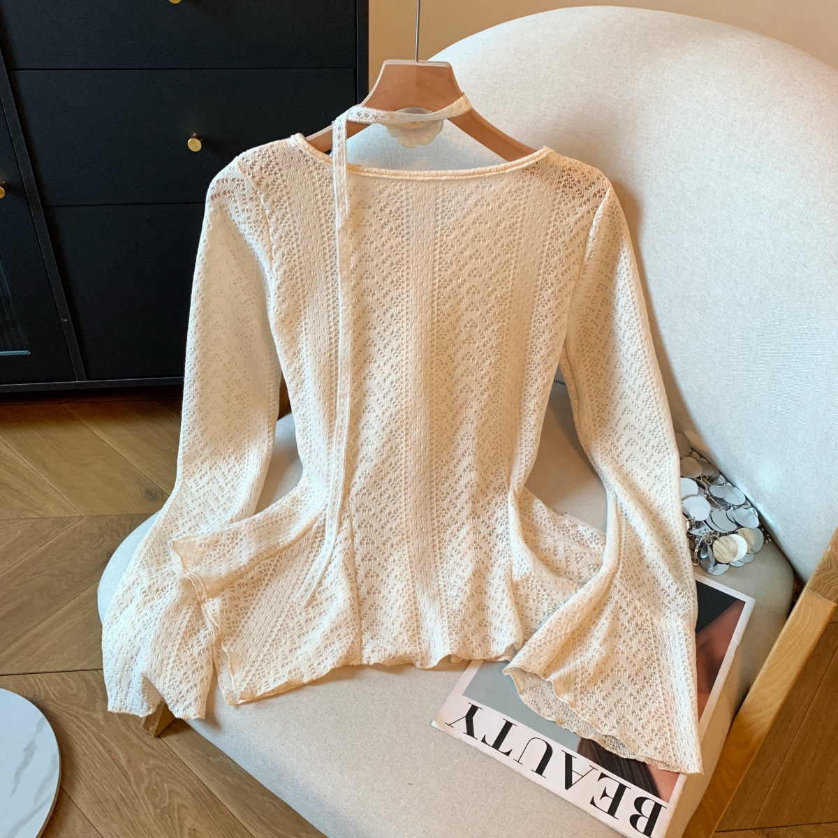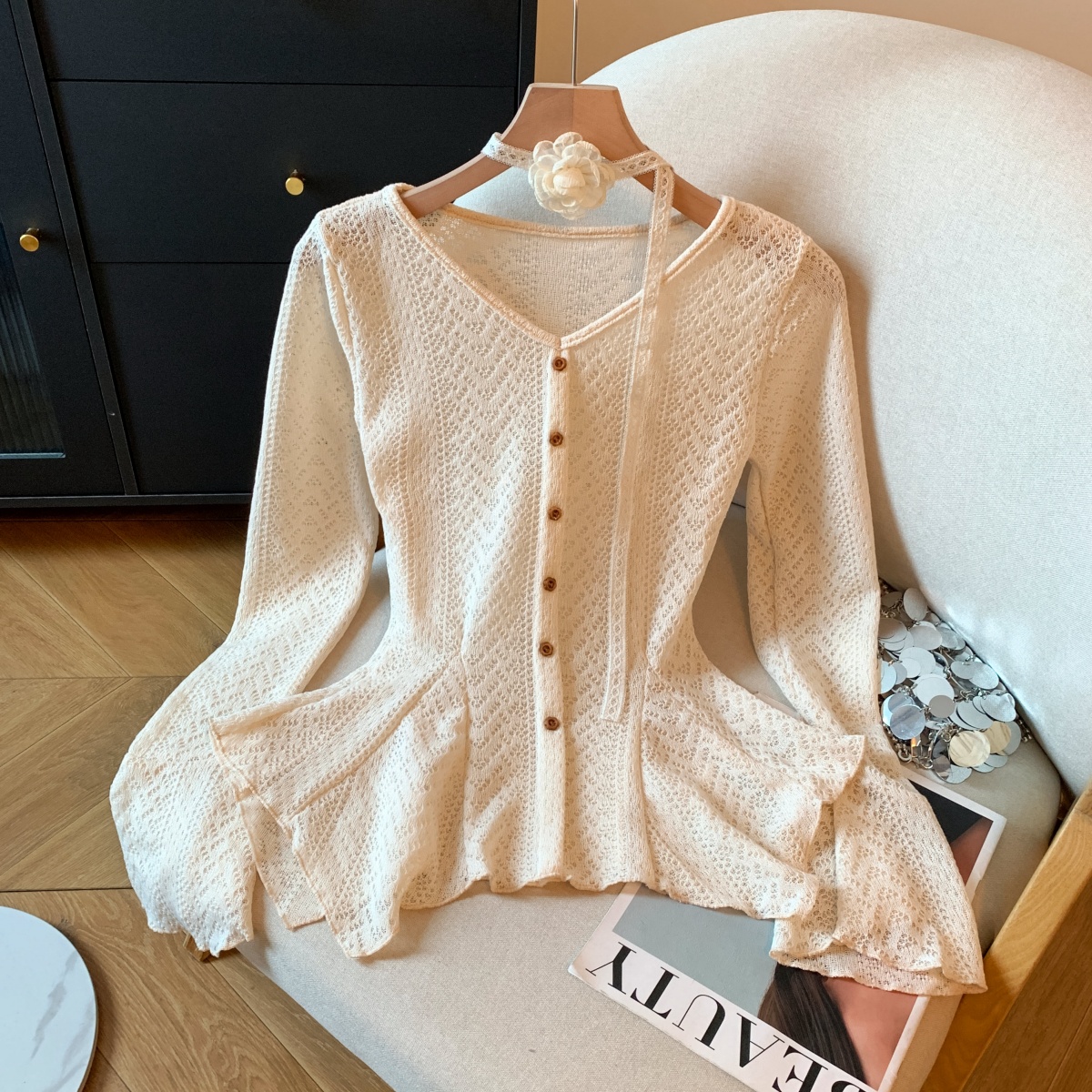 MY14070# 新款韩系简约喇叭袖上衣百搭温柔气质长袖配花朵飘带女裝貨源服裝批發
