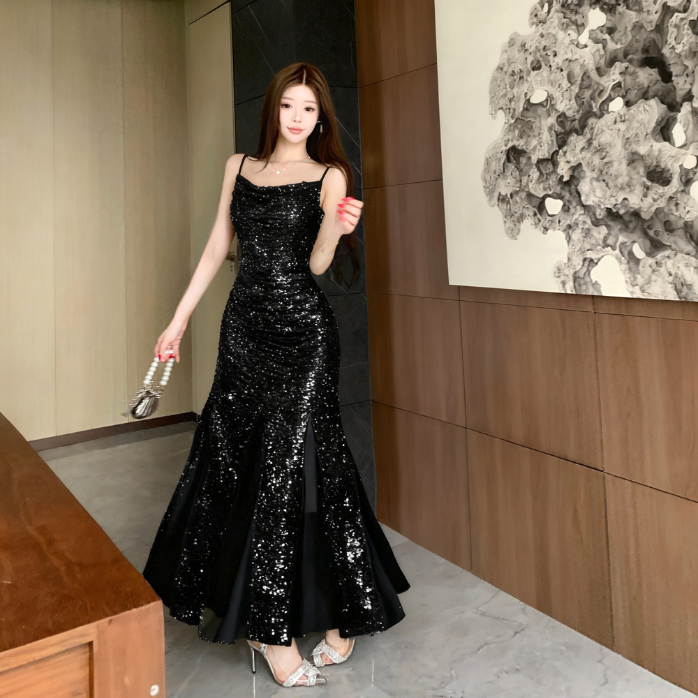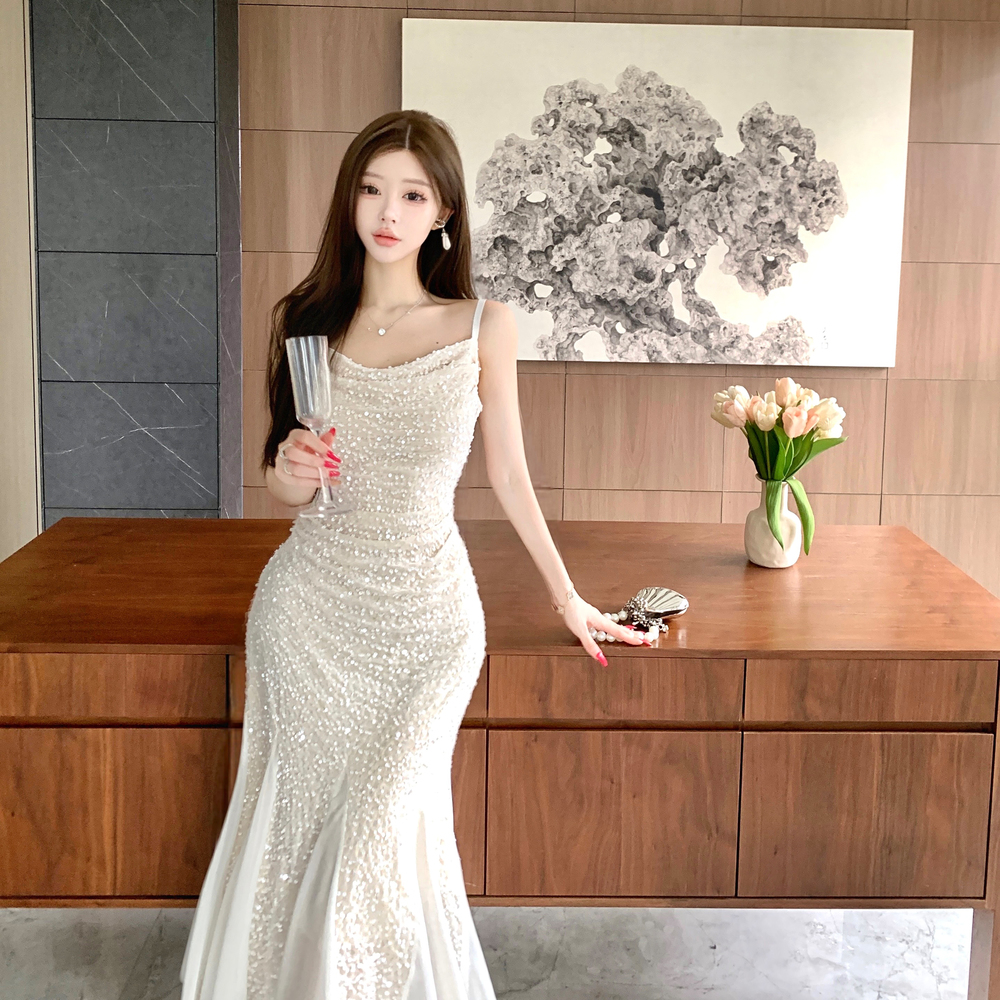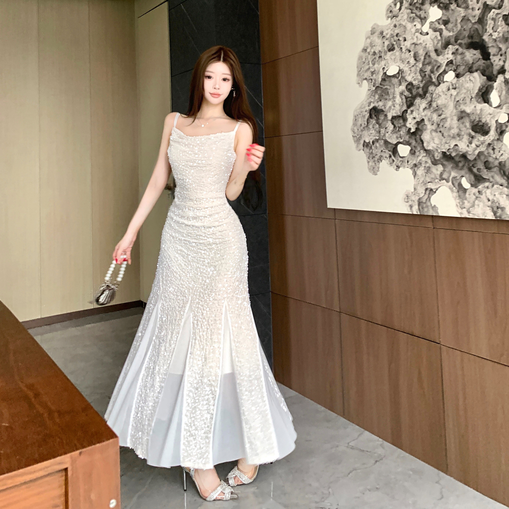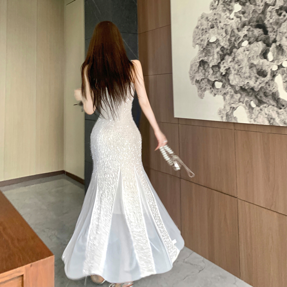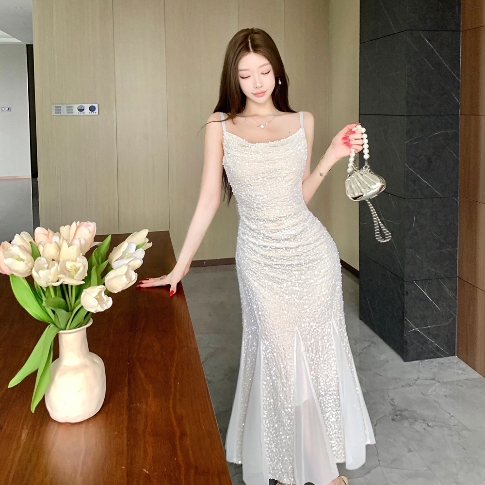 MY14076# 重工亮片网纱吊带连衣裙女晚礼服鱼尾包臀裙女裝貨源服裝批發