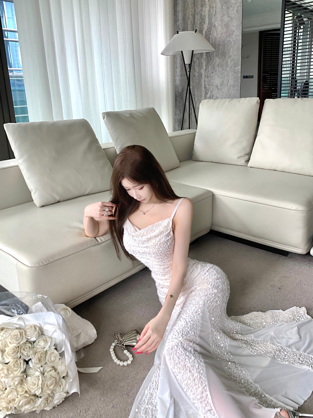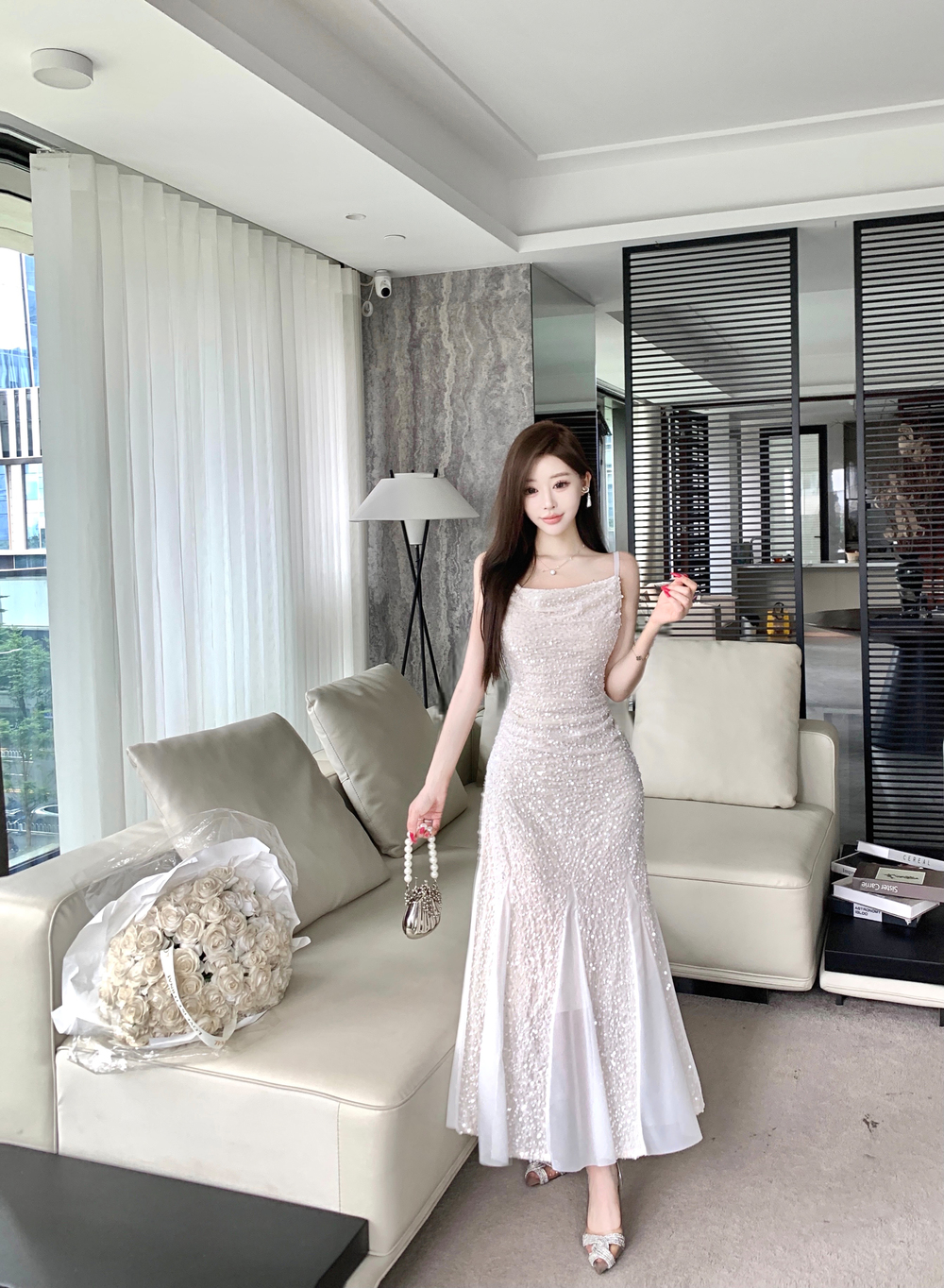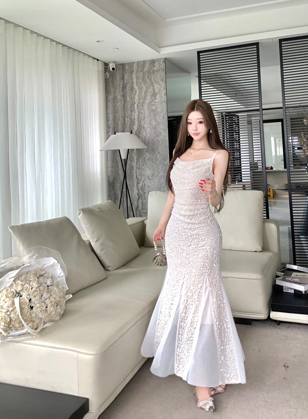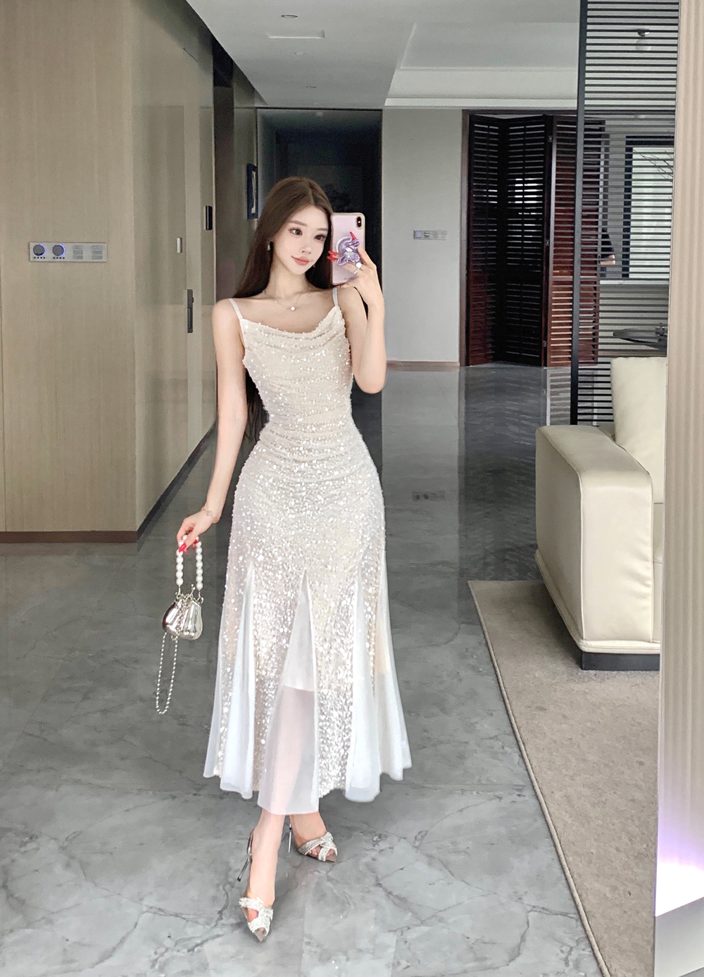 MY14076# 重工亮片网纱吊带连衣裙女晚礼服鱼尾包臀裙女裝貨源服裝批發