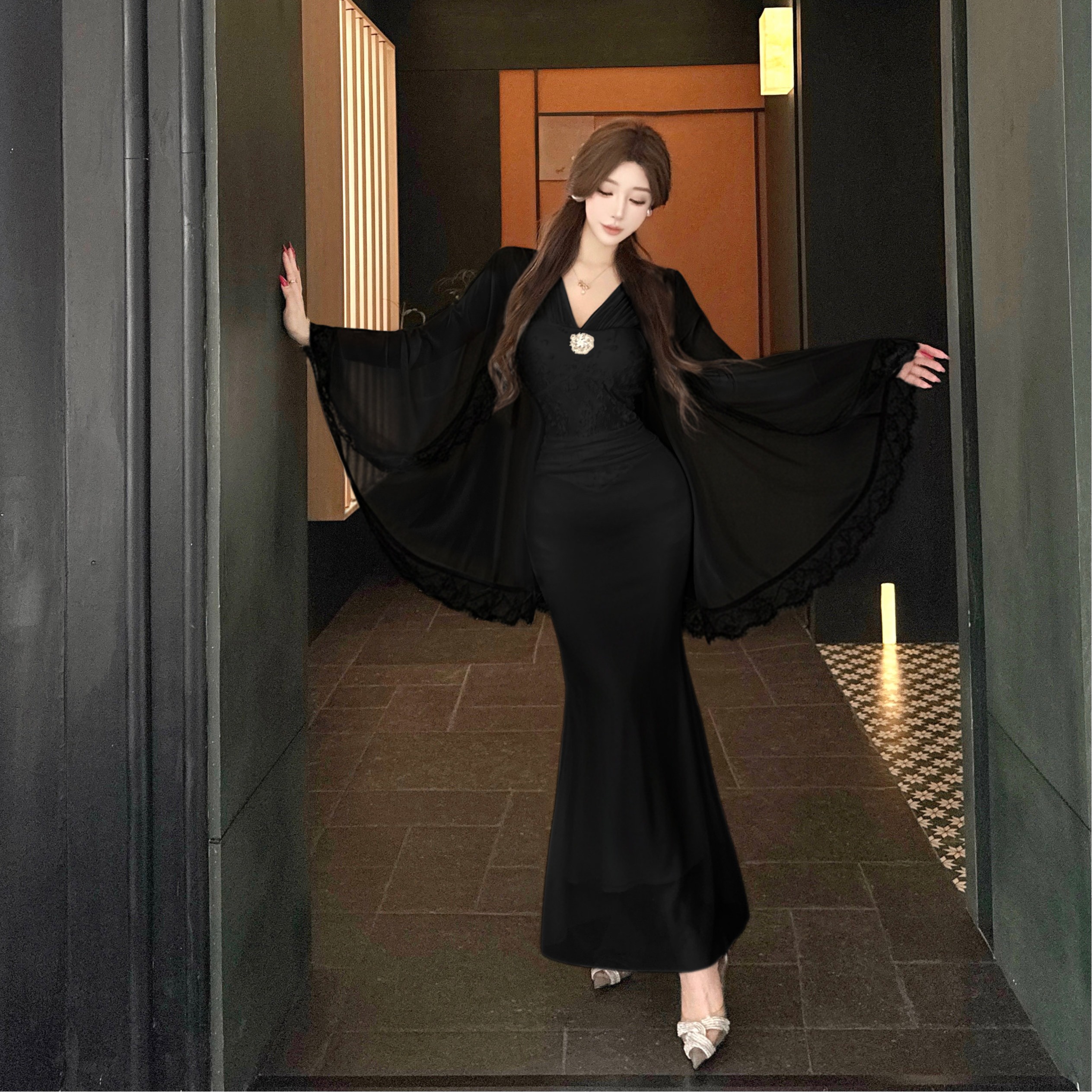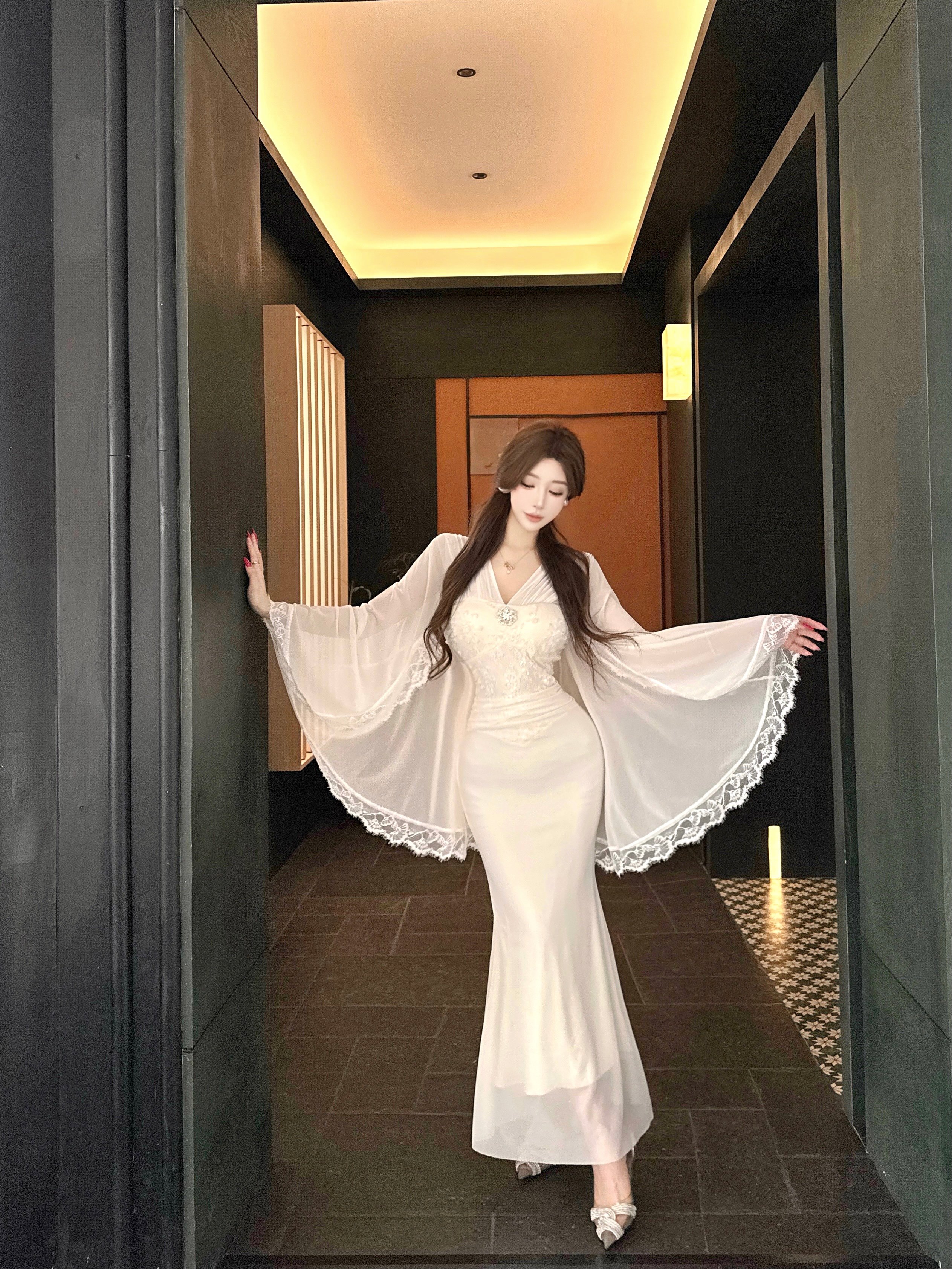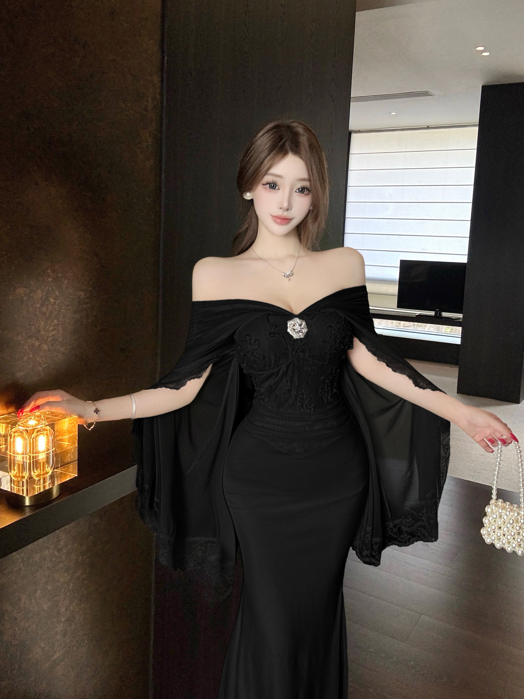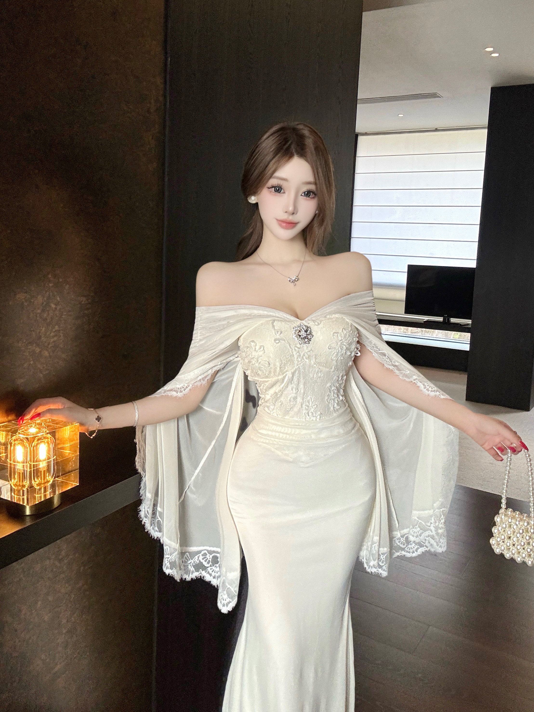 MY14077# 江南美人绝美高级感温柔纯欲性感飘带连肩袖设计感礼服显瘦裙女裝貨源服裝批發